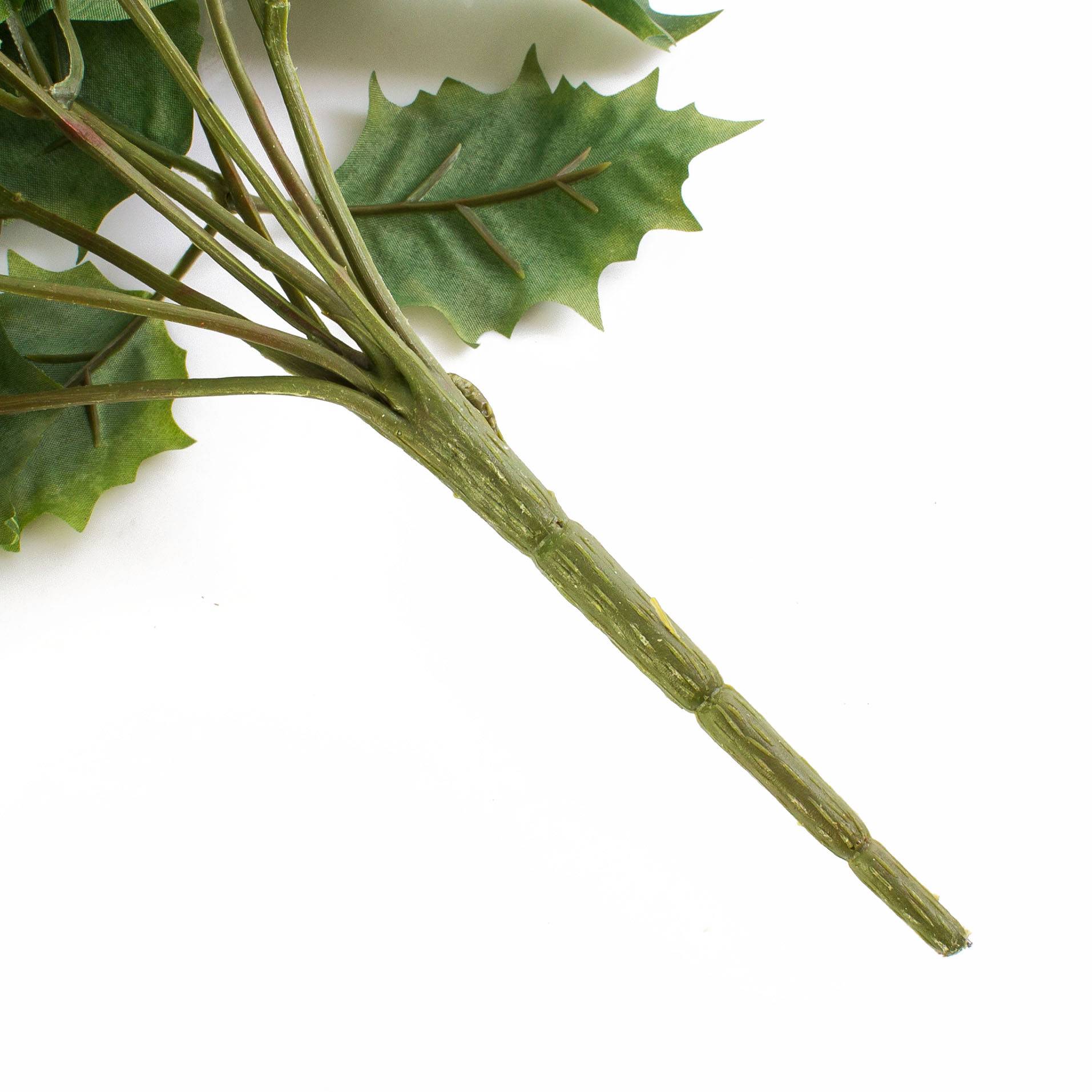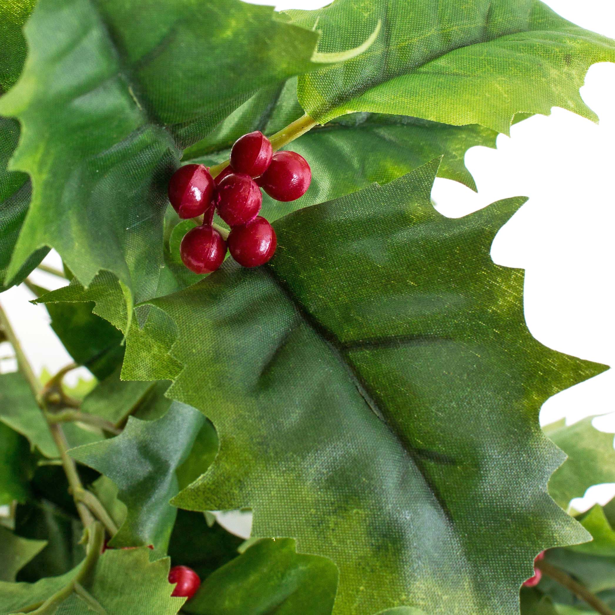 - Con numerosas bayas rojas y 90 hojas serradas de apariencia natural repartidas en 9 ramas