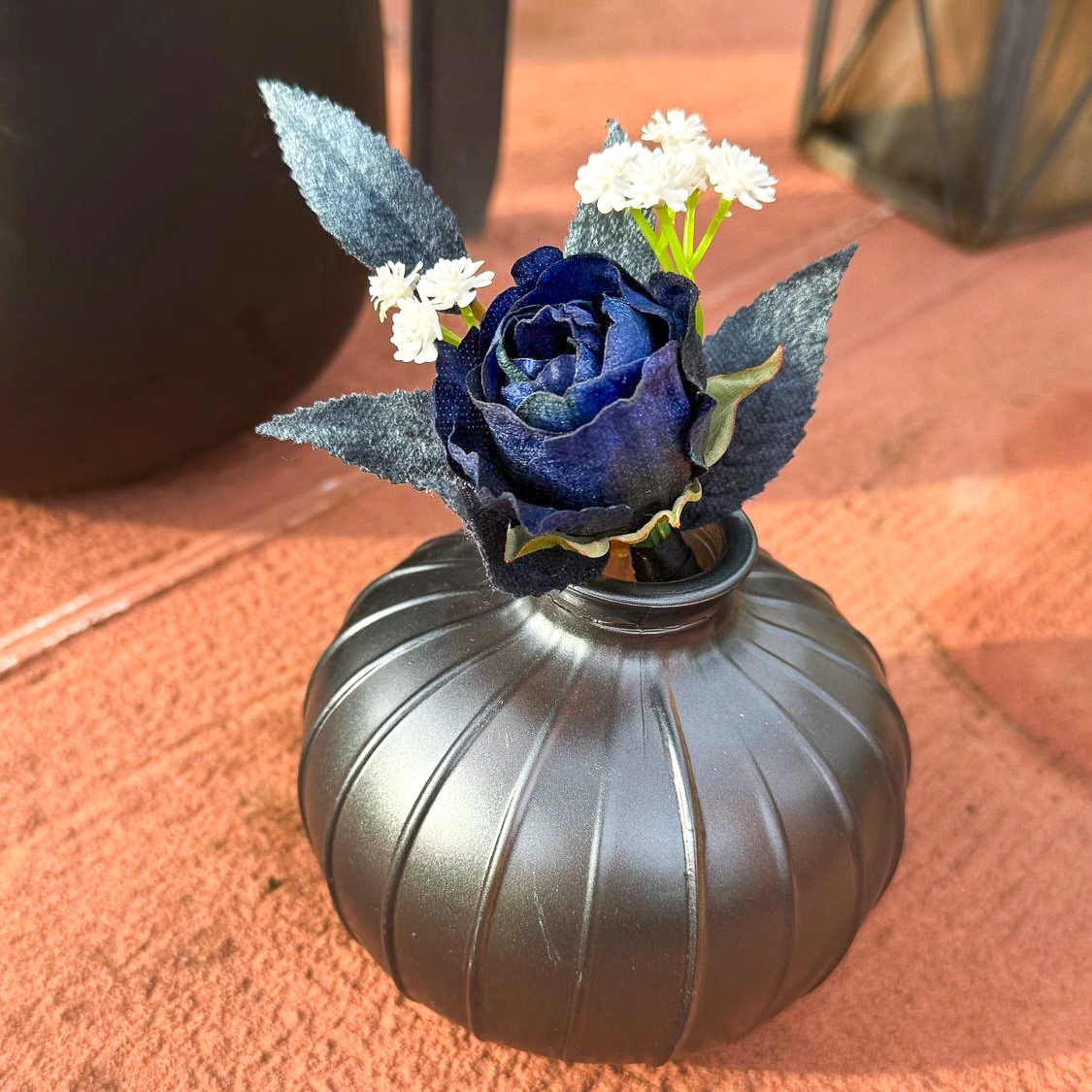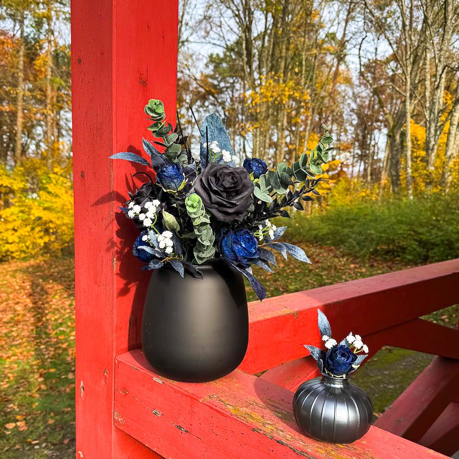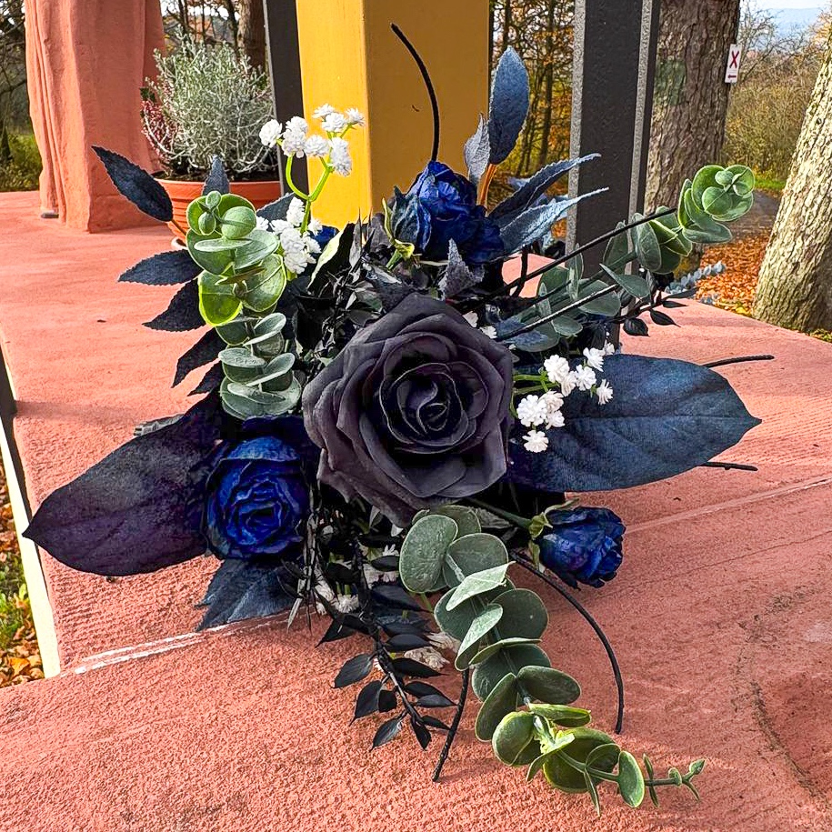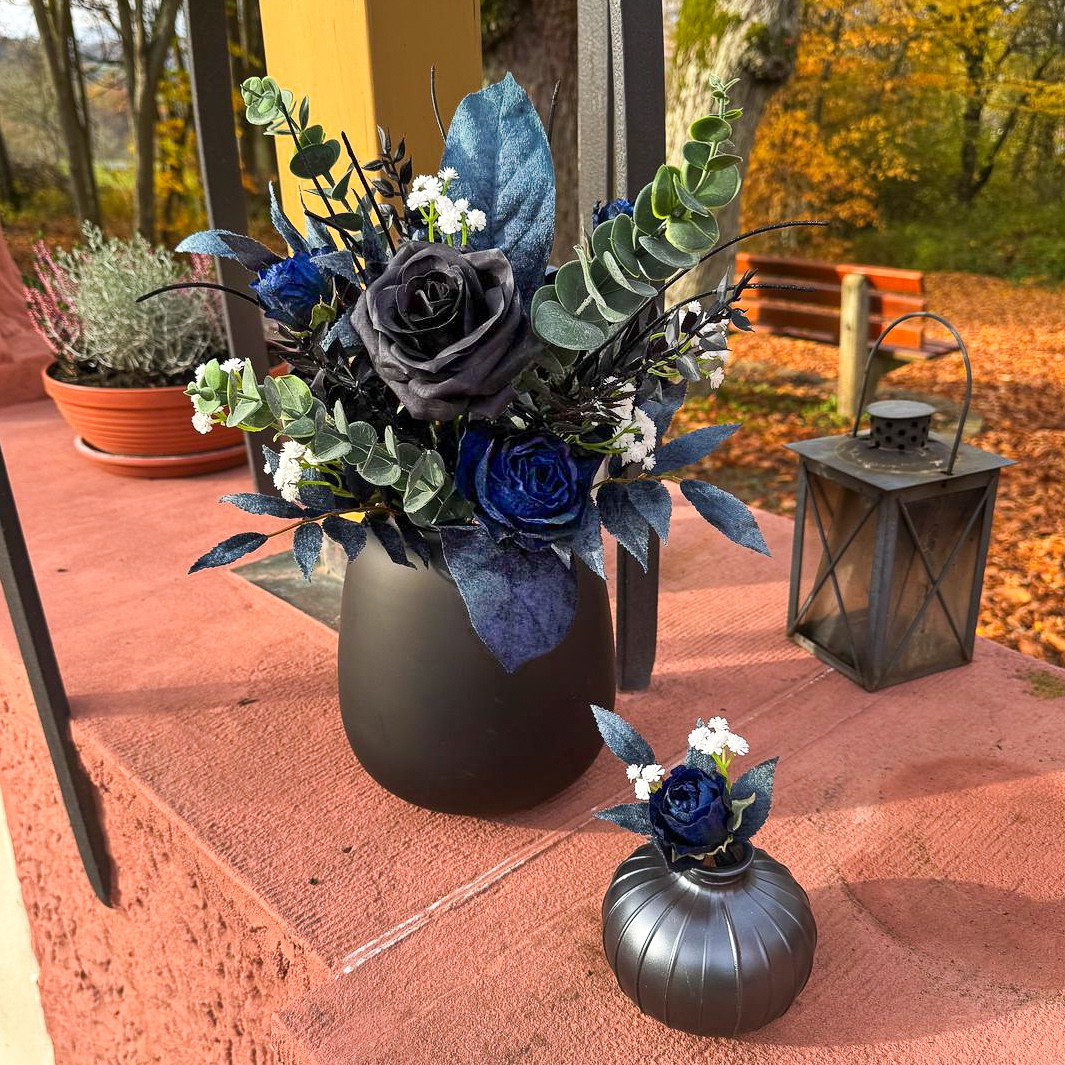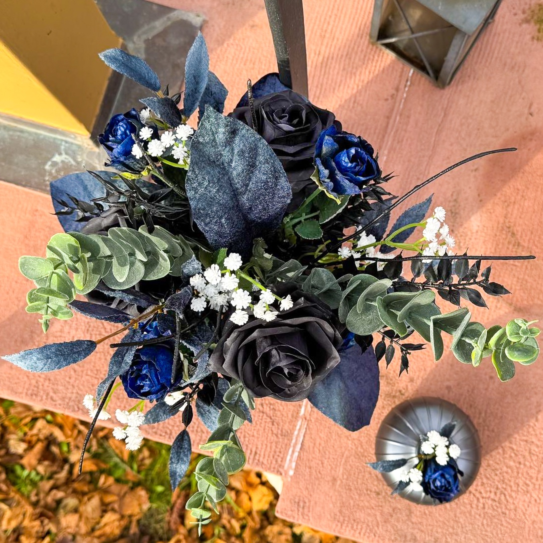 ¡Cuando el arte floral se une a la elegancia atemporal! Tuvimos el placer de encargarnos de toda la decoración floral para una boda de ensueño en el sur de Francia, en una idílica península. La celebración tuvo lugar a mediados de noviembre, una época en la que la elegancia y la profundidad de los colores cobran especial relevancia. La clienta deseaba un concepto moderno y elegante en negro y azul oscuro, complementado con delicados toques blancos para crear una impresión de boda clásica. Todos los elementos azul oscuro recibieron una superficie aterciopelada, que despliega un efecto elegante y cálido, especialmente en la estación más fría del año. El ramo de la novia y el alfiler a juego para el novio constituyen el núcleo de todo el concepto floral, en armonía entre sí y marcando el estilo de todos los demás arreglos. ¿También desea celebrar su boda con flores artificiales? ¡Compre el look!
