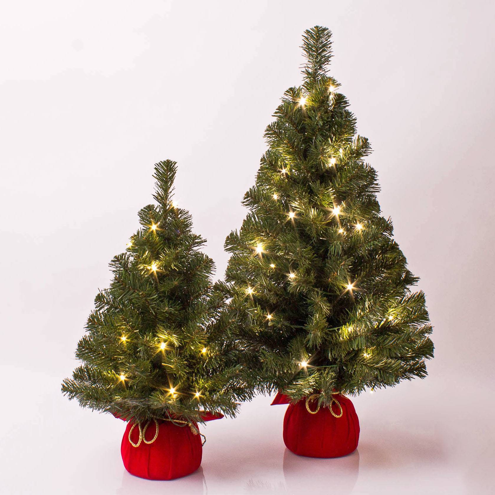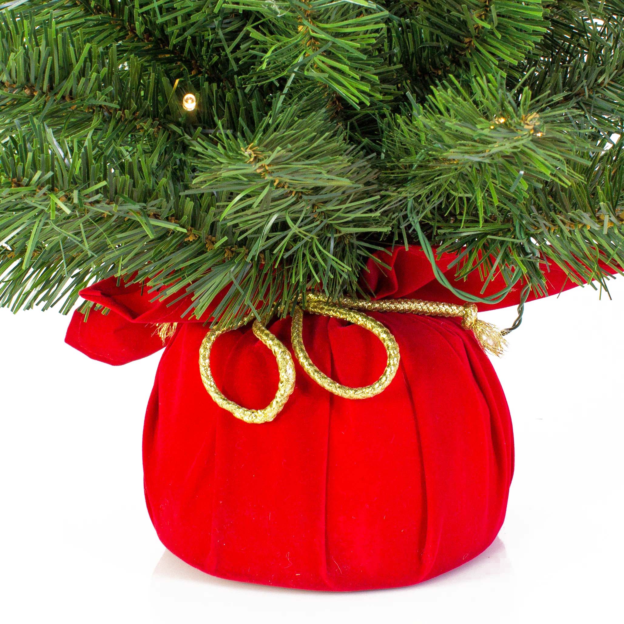 Mini árbol Navidad artificial WARSCHAU, saco yute rojo, LEDs, 90cm, Ø50cm