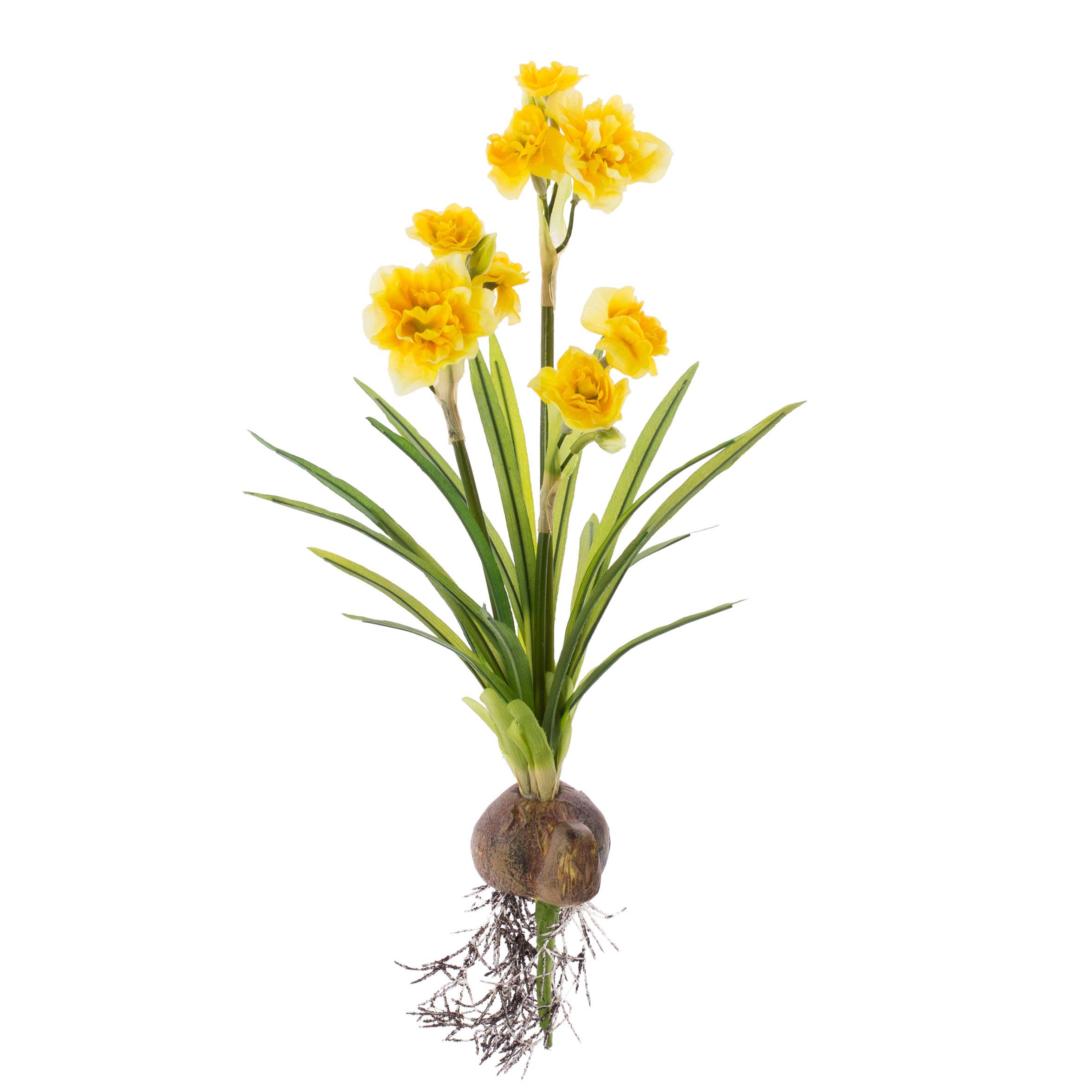 Narcissus artificial con 7 flores amarillas y un bulbo. La planta decorativa posee una altura total aproximada de 45 cm.