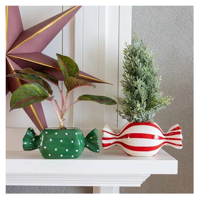 ¡Suave brillo navideño en una envoltura divertida! Un look navideño limpio y moderno, en el que predominan las formas claras y los colores discretos. Un pequeño abeto nevado aporta la clásica magia invernal al arreglo. Junto a él se encuentra una Calathea ornata, cuyas delicadas venas rosadas aportan un toque elegante y contemporáneo. Ambas plantas se encuentran en una maceta de cerámica con forma de caramelo, el único elemento llamativo y juguetón en un estilo por lo demás discreto. Las brillantes macetas con forma de caramelo combinan la dulzura festiva con la sencillez moderna, creando así un toque sutil y encantador. Al fondo cuelga una flor de pascua que, con su presencia ligera y gráfica, completa el conjunto sin recargar la escena. La impresión general: minimalista, moderna, invernal, con un toque de alegría festiva. ¡Compra el look!