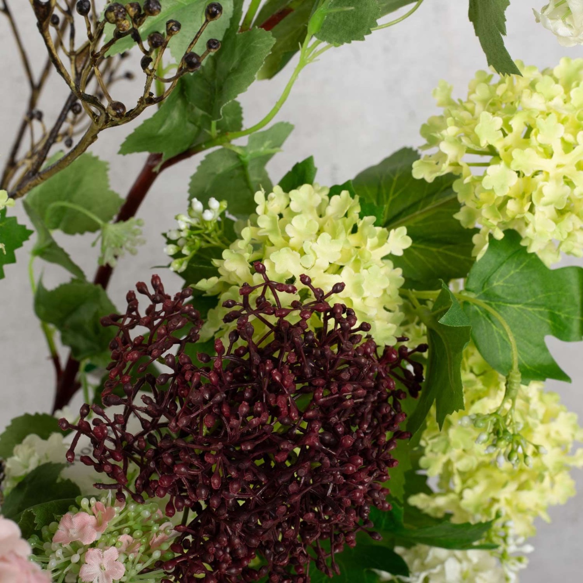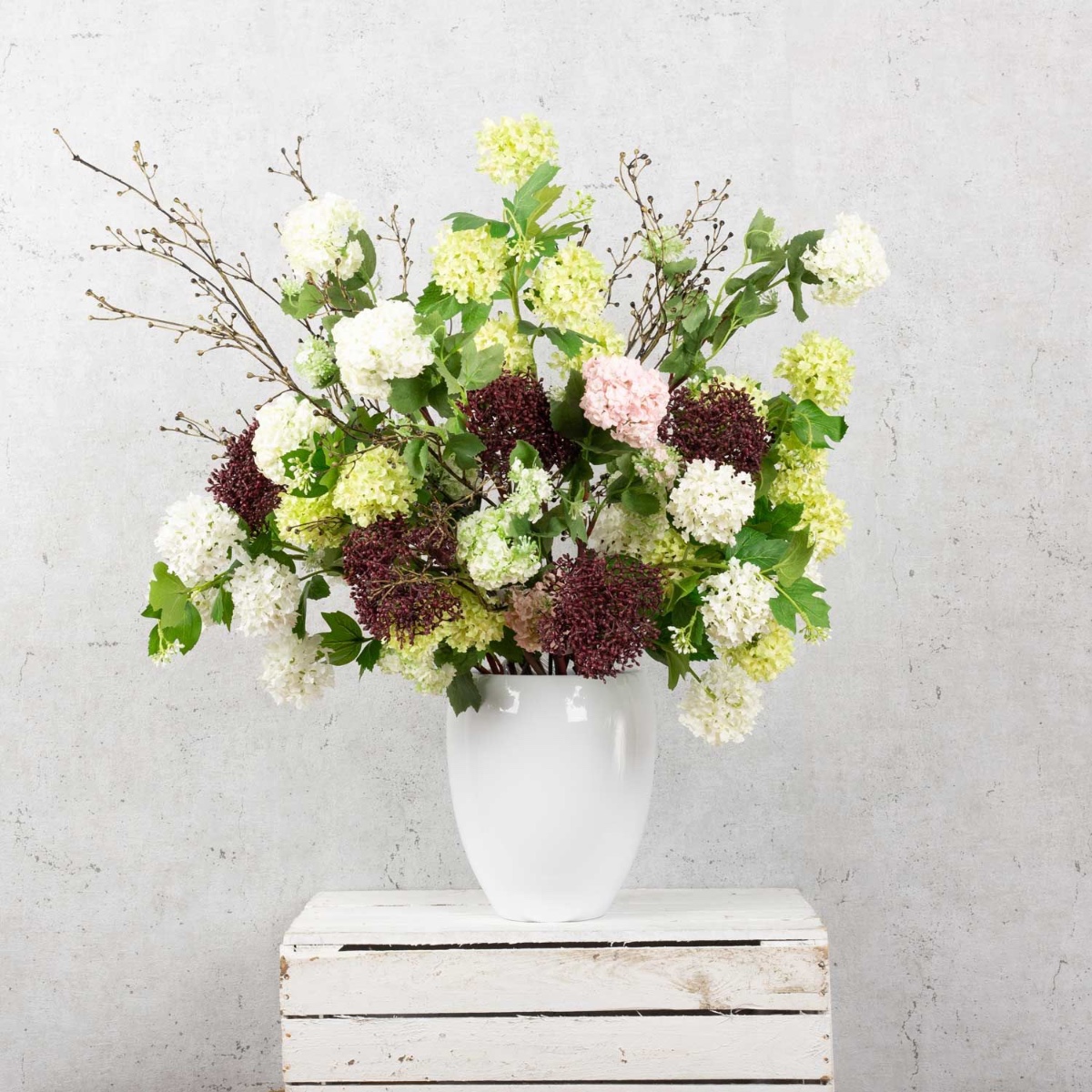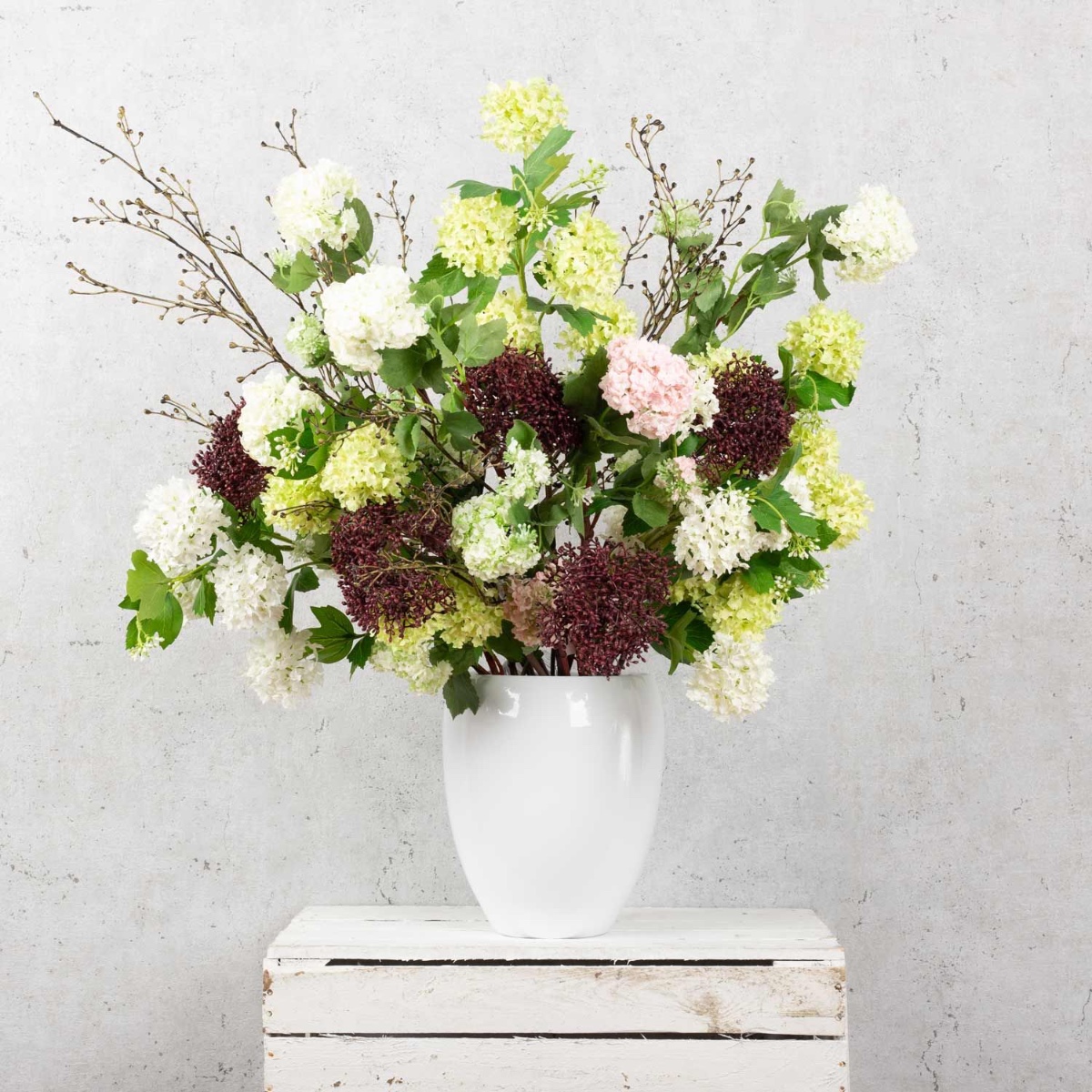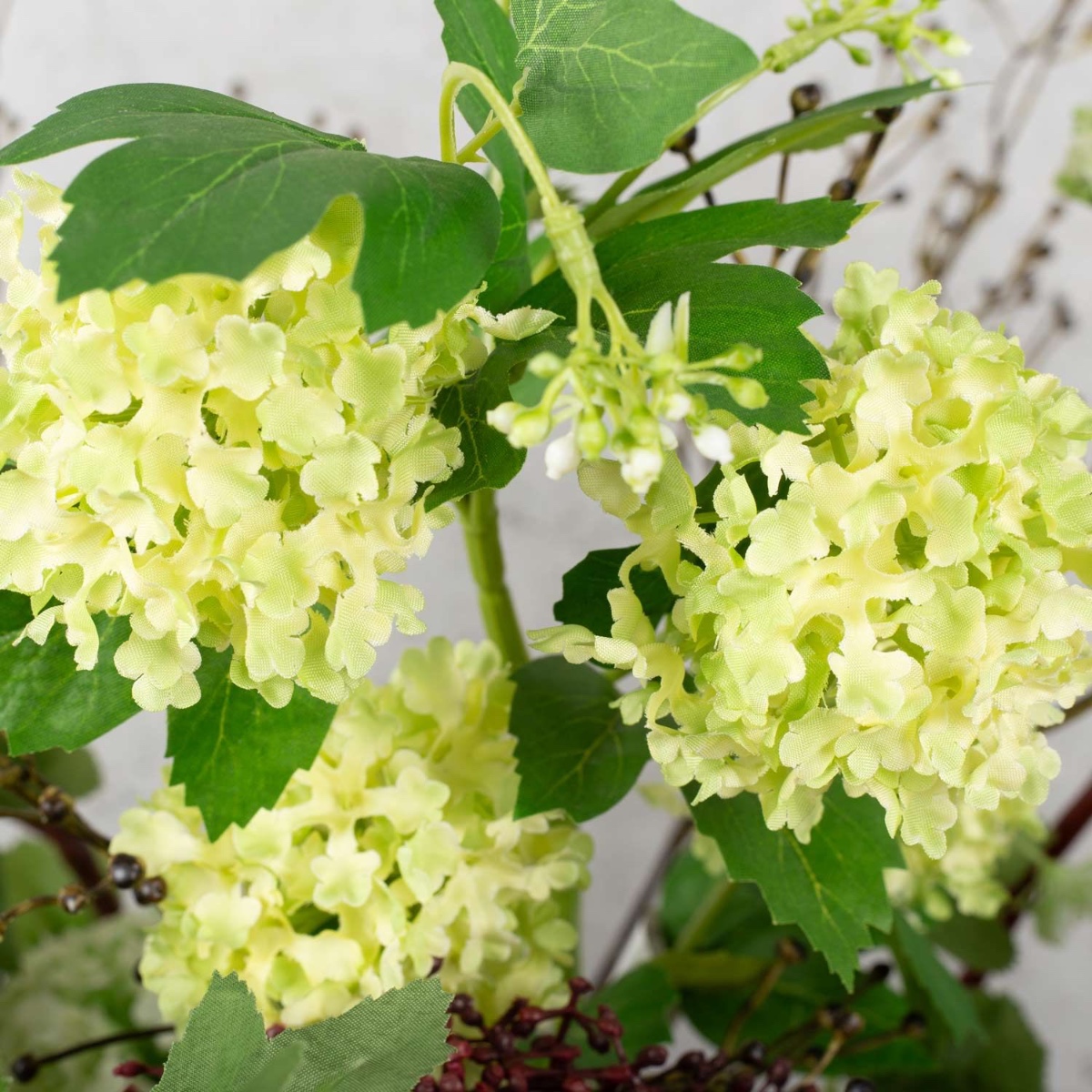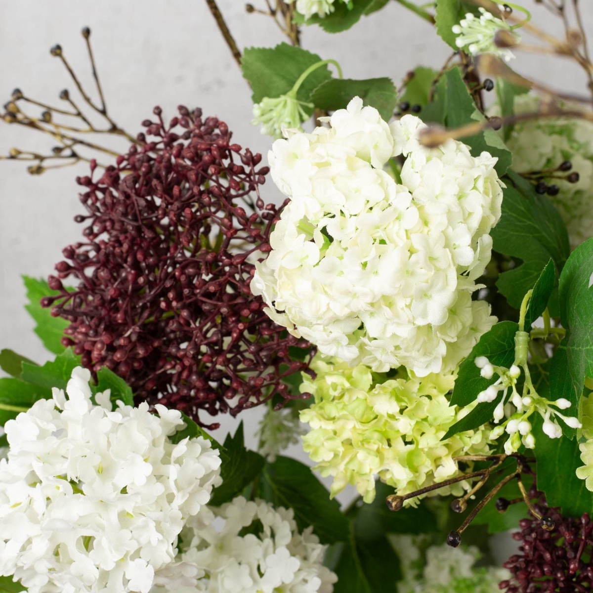 ¡Blanco, verde y burdeos! Las flores de viburnum son realmente extraordinarias. Muchas flores pequeñas se convierten en una flor grande con forma de bola que parece una bola de nieve. Esta apariencia se creó a partir de diferentes colores e inflorescencias del viburnum creado y muestra cuán exuberantes e impresionantes son estas flores ¡Compra el look!