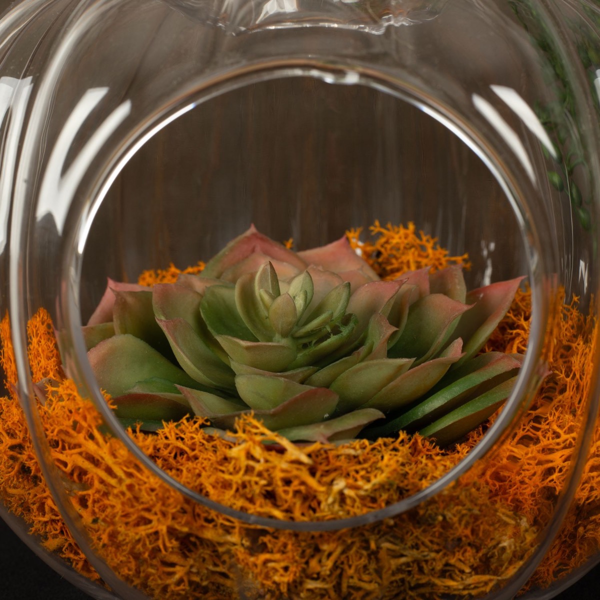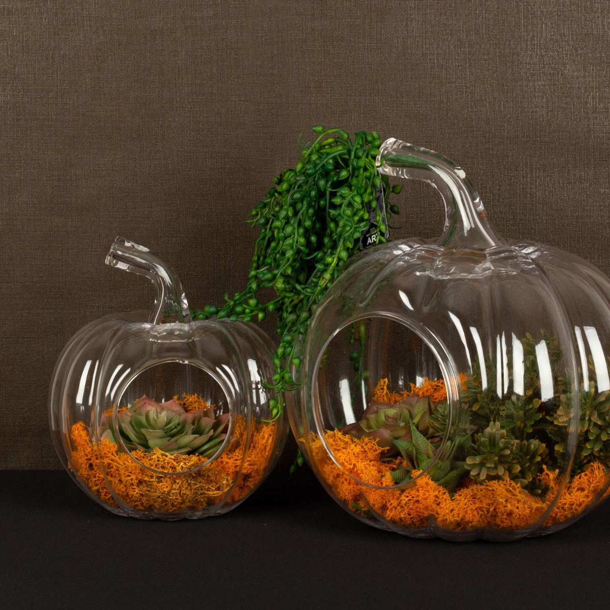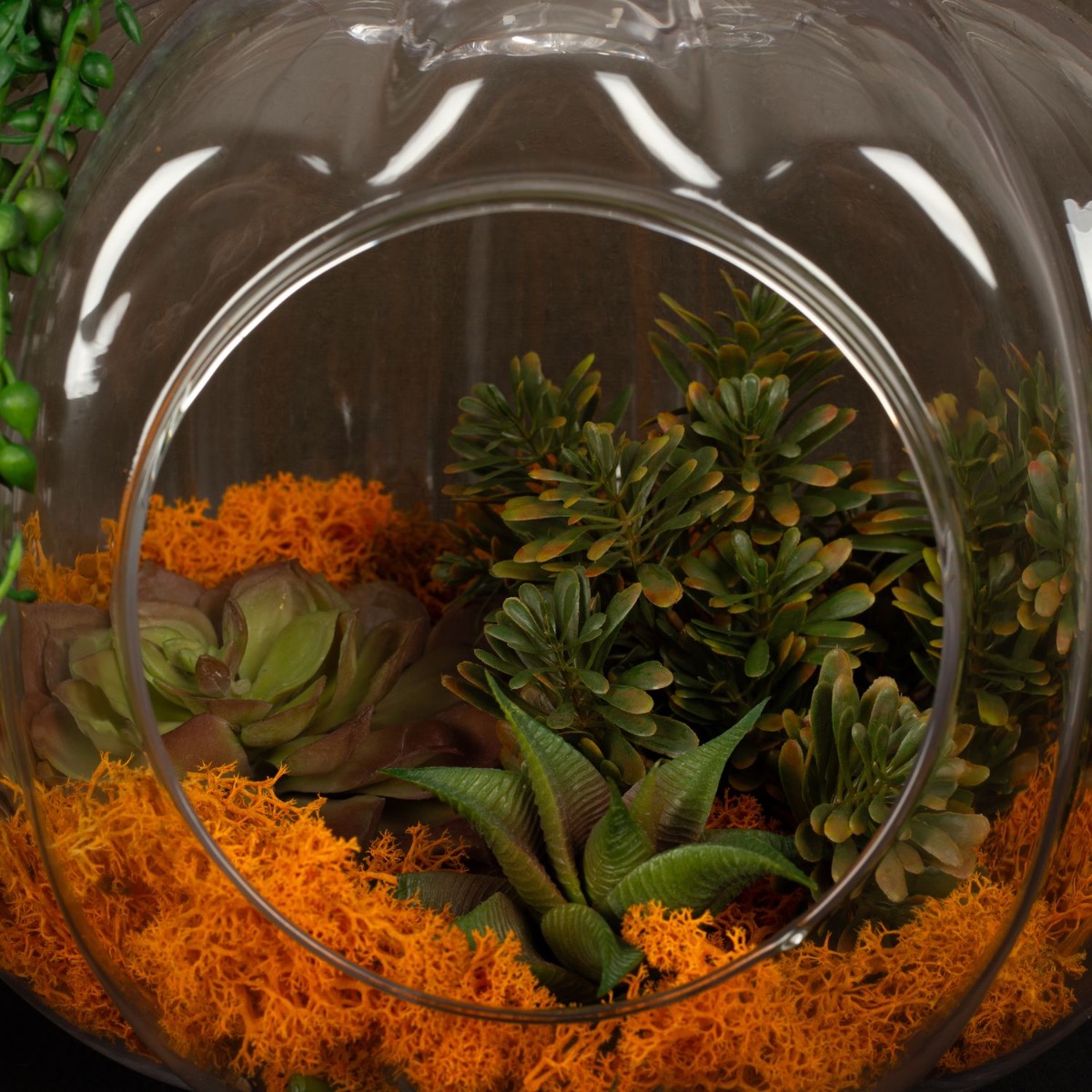 ¡Vidrio y musgo! Una combinación que siempre queda bien. Hemos diseñado este look otoñal de Halloween de forma muy discreta para que esta vez nadie tenga que asustarse. El musgo natural naranja en el cristal y las calabazas brillan simple y maravillosamente. Las suculentas son perfectas para terrarios de plantas. Una gran decoración para el otoño. ¡Compra el look!