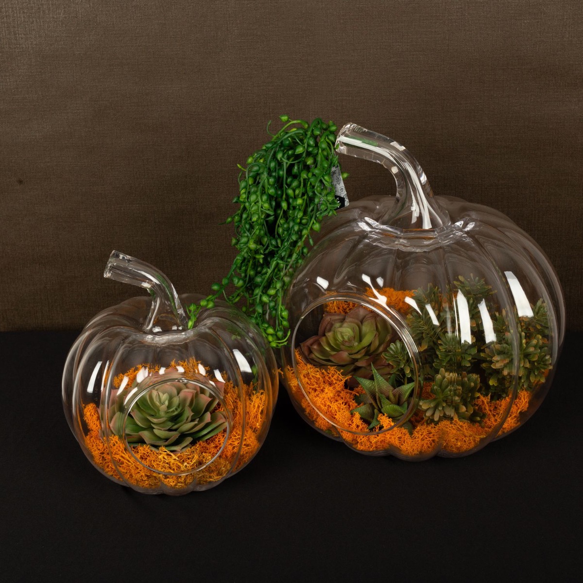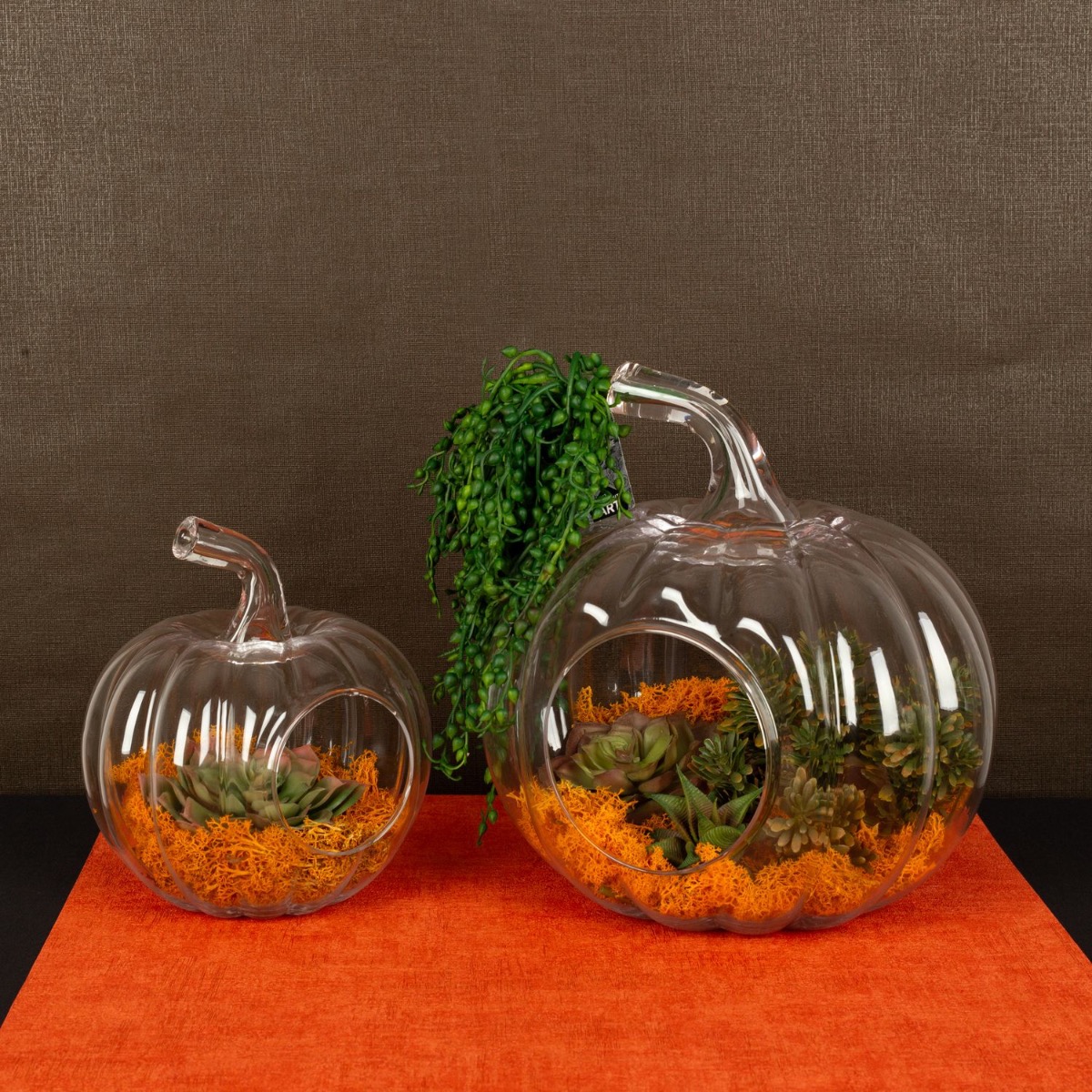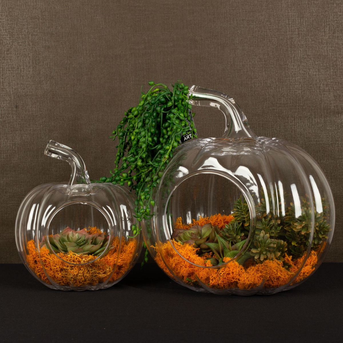 ¡Vidrio y musgo! Una combinación que siempre queda bien. Hemos diseñado este look otoñal de Halloween de forma muy discreta para que esta vez nadie tenga que asustarse. El musgo natural naranja en el cristal y las calabazas brillan simple y maravillosamente. Las suculentas son perfectas para terrarios de plantas. Una gran decoración para el otoño. ¡Compra el look!