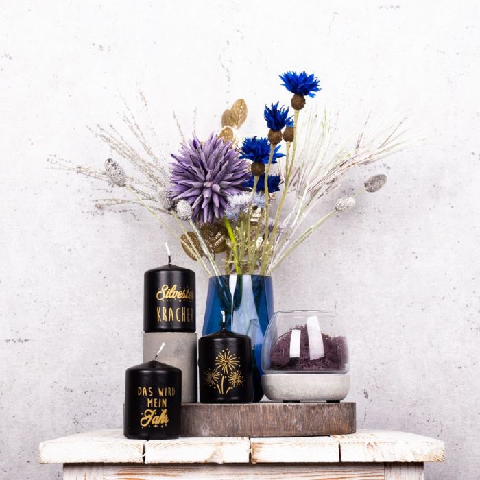 Lila y azul! Una combinación de colores atípica que crea un ambiente invernal fresco y colorido. Con las velas de Nochevieja, este look es perfecto para una fiesta de fin de año para despedir el año todos juntos. El pequeño ramo de acianos azules y un allium de color lila ya parece un pequeño fuego artificial, que queda subrayado por las ramas de pino congeladas y la rama de pino brillante. Rellenamos el tarro de velas con una base de hormigón con musgo natural en un color a juego. Que empiece la fiesta. Compra el look!