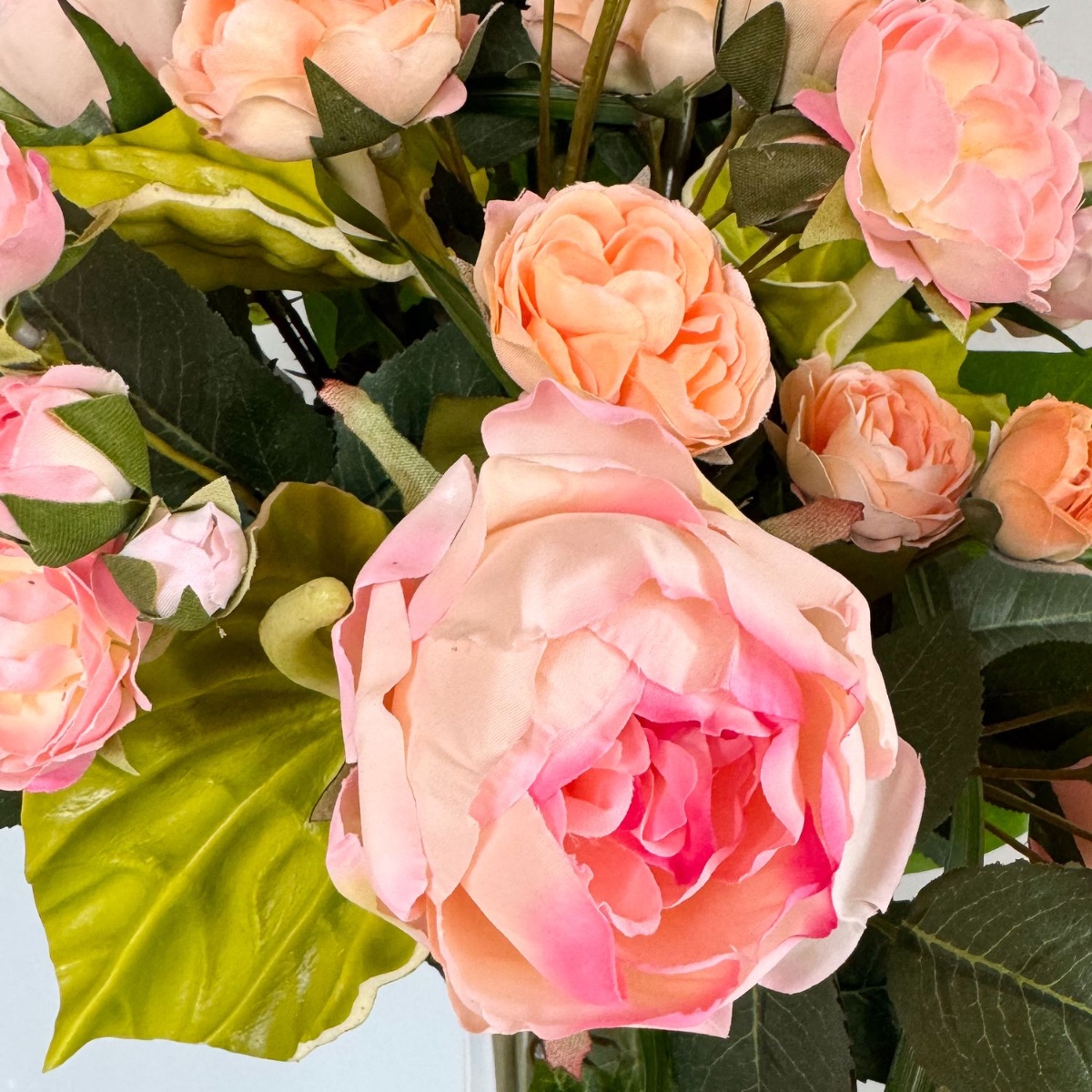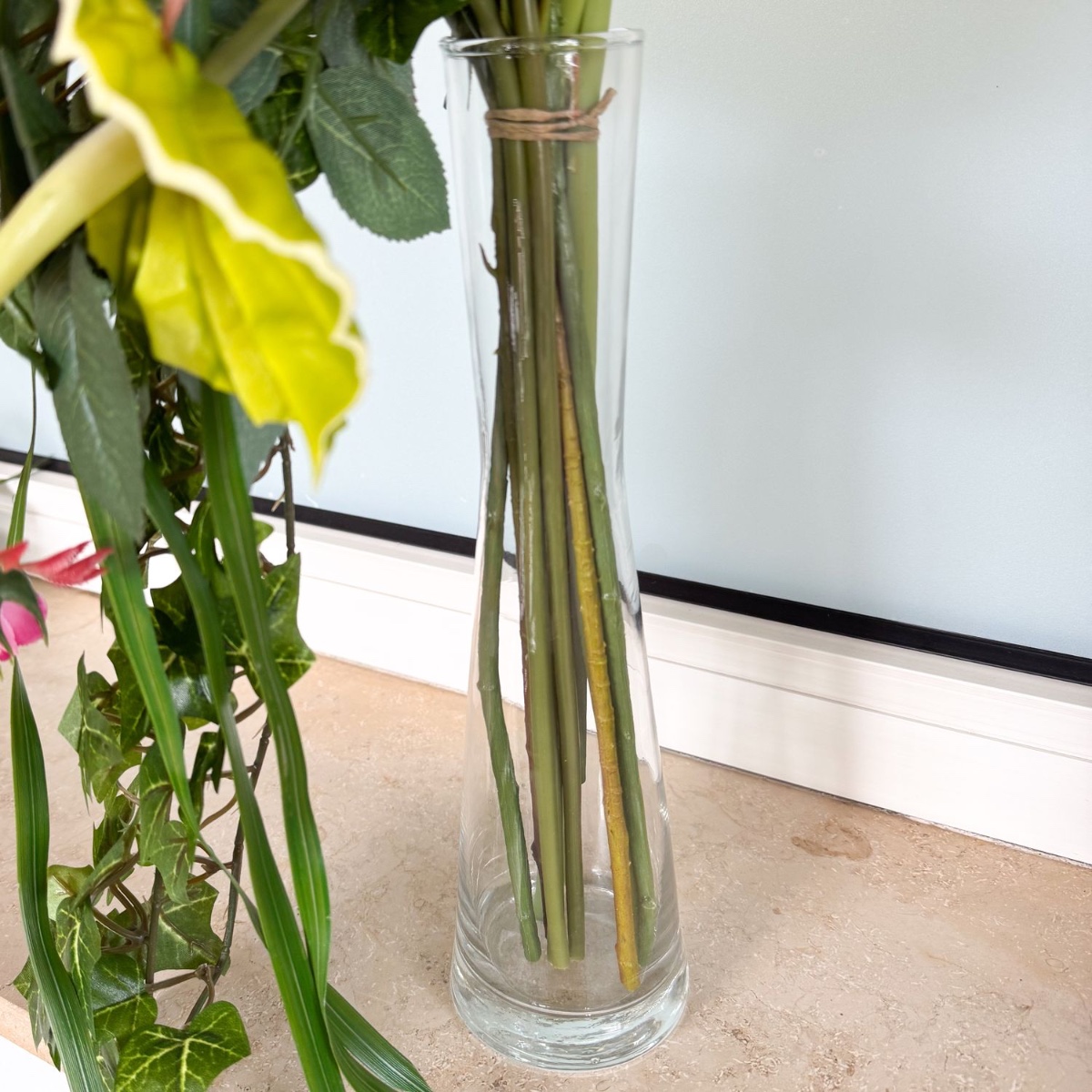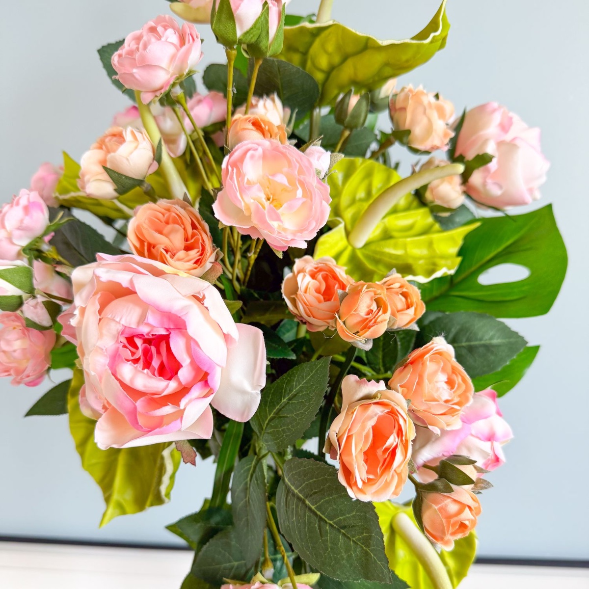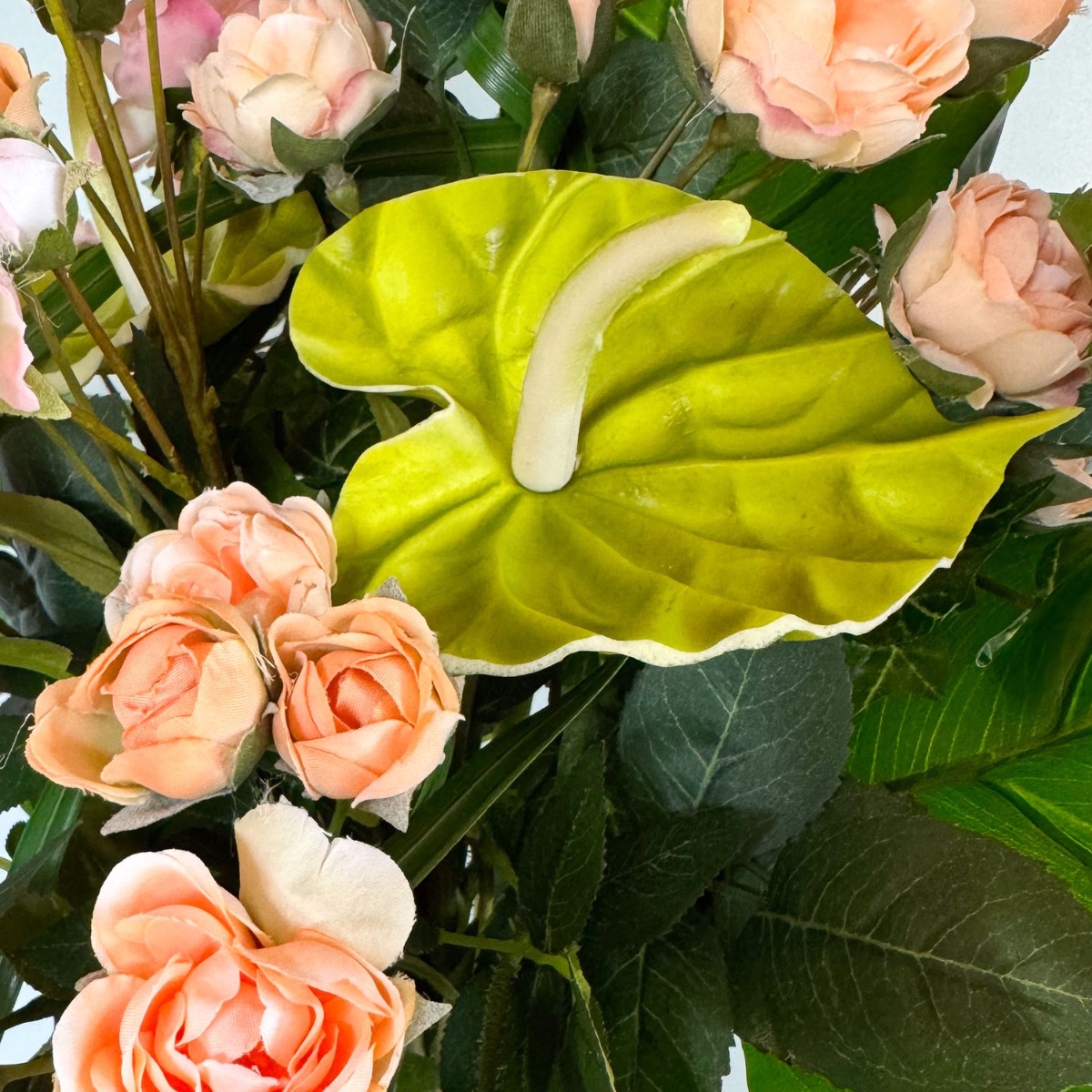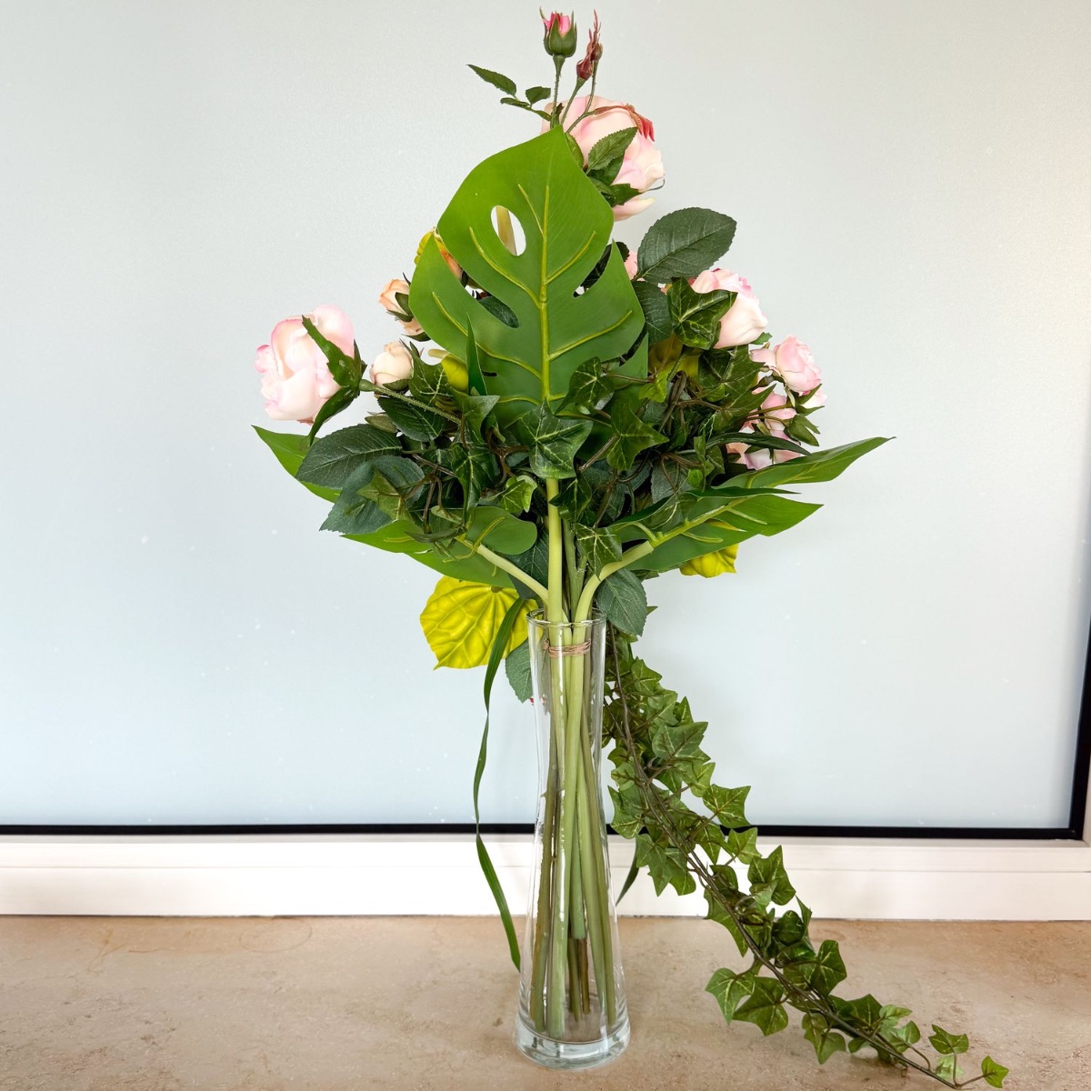 ¡Renovación de los votos matrimoniales! Holger se puso en contacto con nosotros por teléfono para contarnos su petición. Él y su mujer querían una réplica de su ramo de novia artificial de hace 25 años, ya que empezaba a estar viejo. Sin embargo, tuvimos que decirles enseguida que no era posible una réplica exacta debido al tiempo y al color. Esto no supuso ningún problema para el cliente. El ramo original es albaricoque-anaranjado claro con matices verdes, tuve que cambiar esta combinación de colores a rosa-verde. Así que busqué rosas de color rosa claro con cabezas de flores de diferentes tamaños, así como una flor de color verde rosado con una forma de flor inusual, aquí encontré una flor de anturio que combinaba muy bien con las rosas. Como era un ramo en cascada, añadí hiedra, briznas de hierba y un manguito de hojas de Philodendron Monstera Deliciosa. Una vez terminado el ramo, enviamos a nuestro cliente una primera propuesta del ramo de novia, que gustó mucho a Holger y a su mujer. Recogió el ramo directamente de nuestro local. ¿También quieres un ramo de novia decorativo? ¡Compre el look!