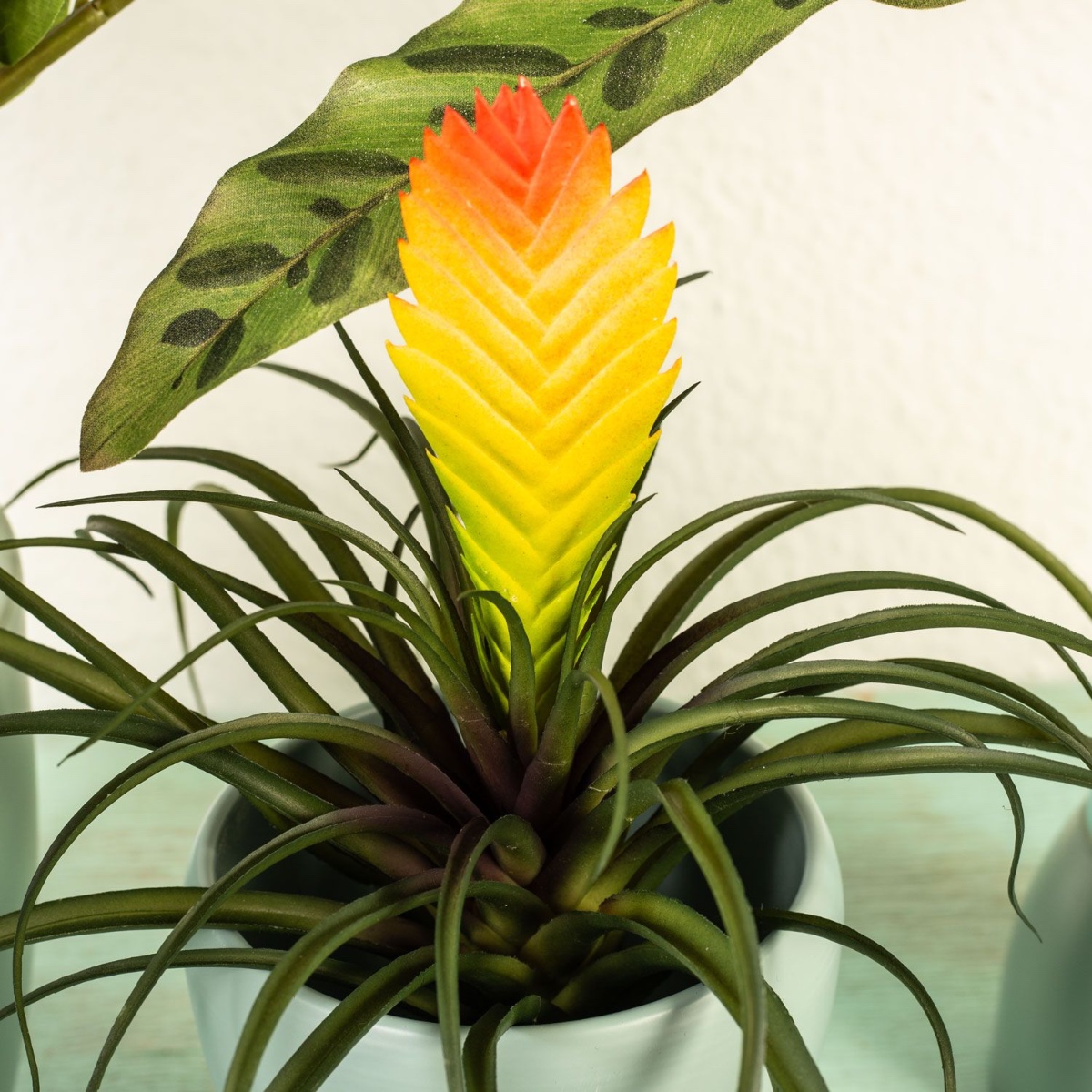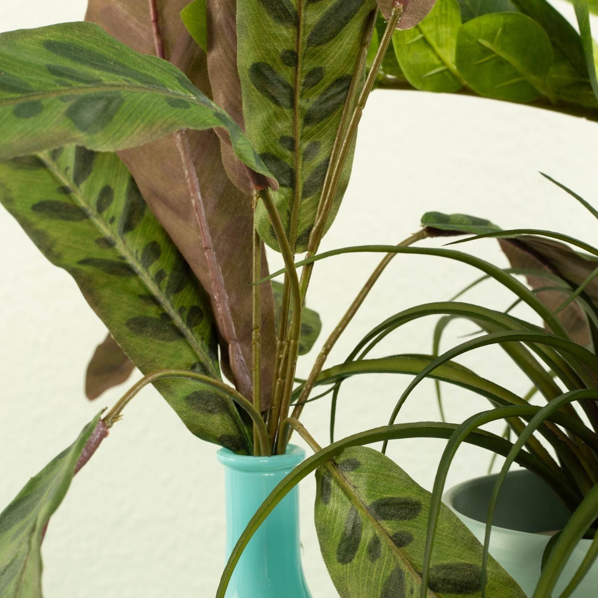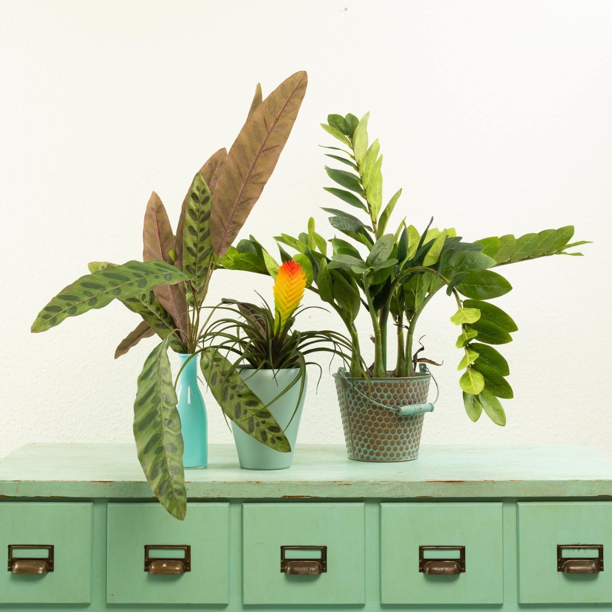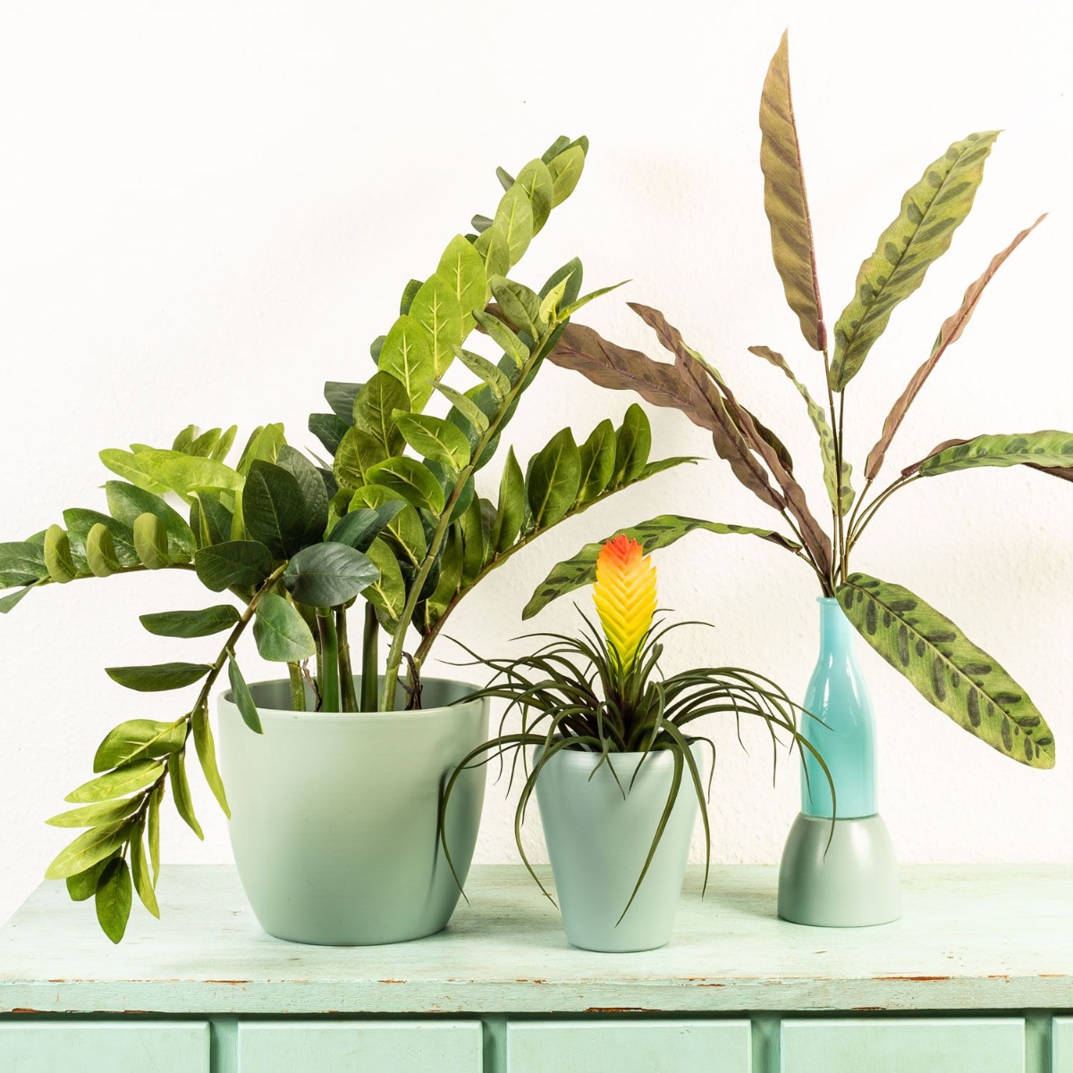 Consejo de diseño: Simplemente coloca la pluma de la suerte en la maceta y la varilla de la Calathea en la botella y coloca la varilla de la Vriesea en la maceta alta para orquídeas y llénala con gránulos de corcho. Dobla todas las plantas al tamaño adecuado.