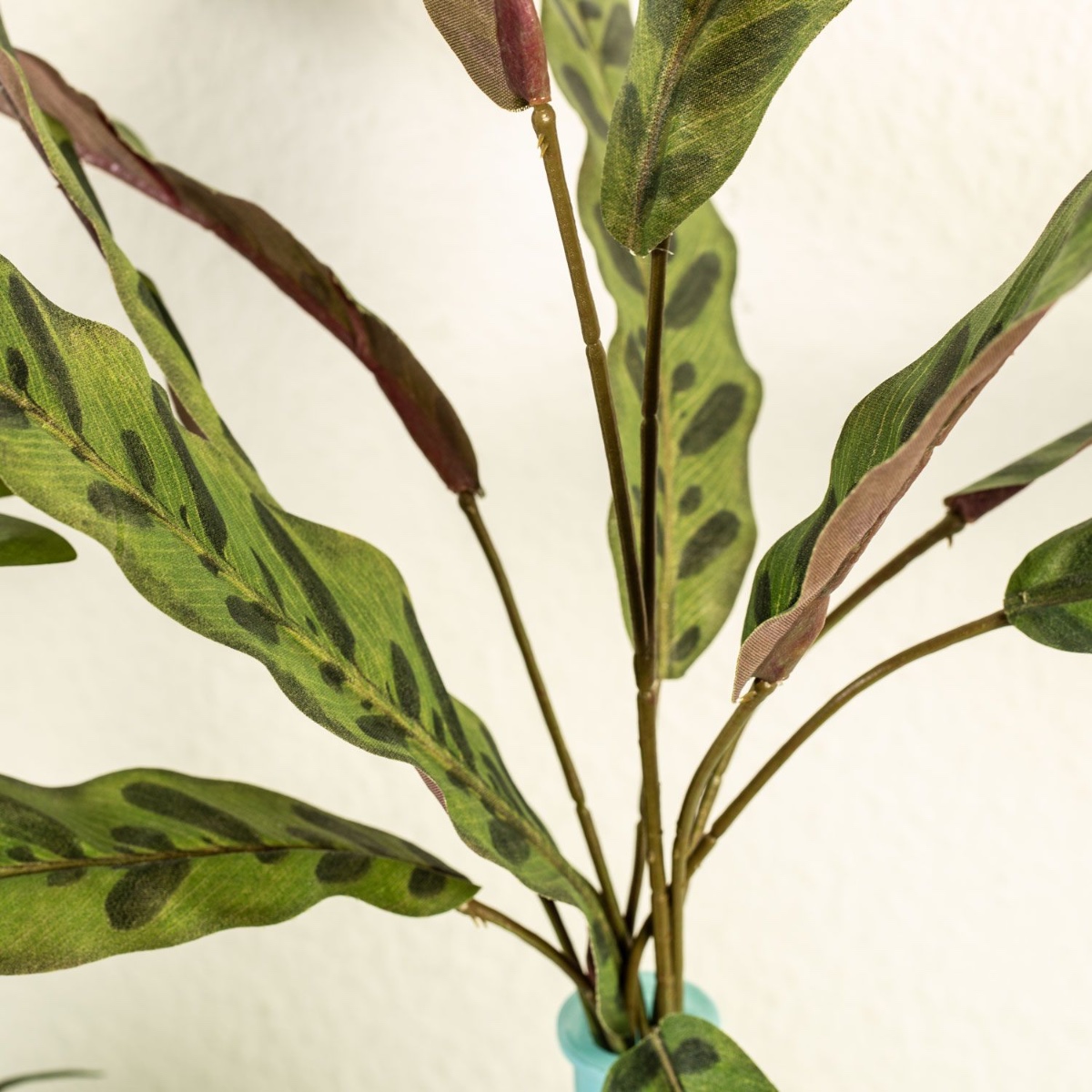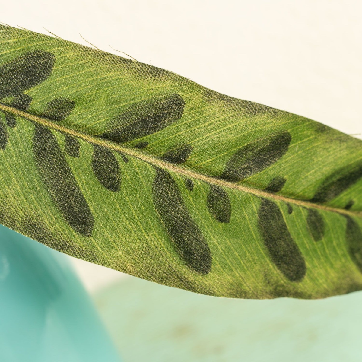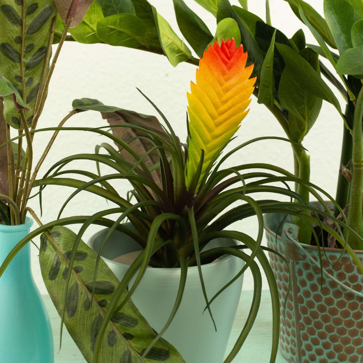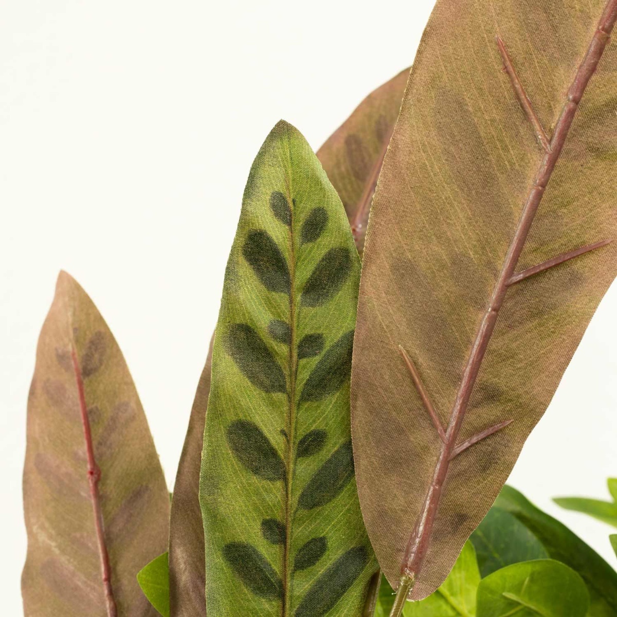 Consejo de diseño: Simplemente coloca la pluma de la suerte en la maceta y la varilla de la Calathea en la botella y coloca la varilla de la Vriesea en la maceta alta para orquídeas y llénala con gránulos de corcho. Dobla todas las plantas al tamaño adecuado.