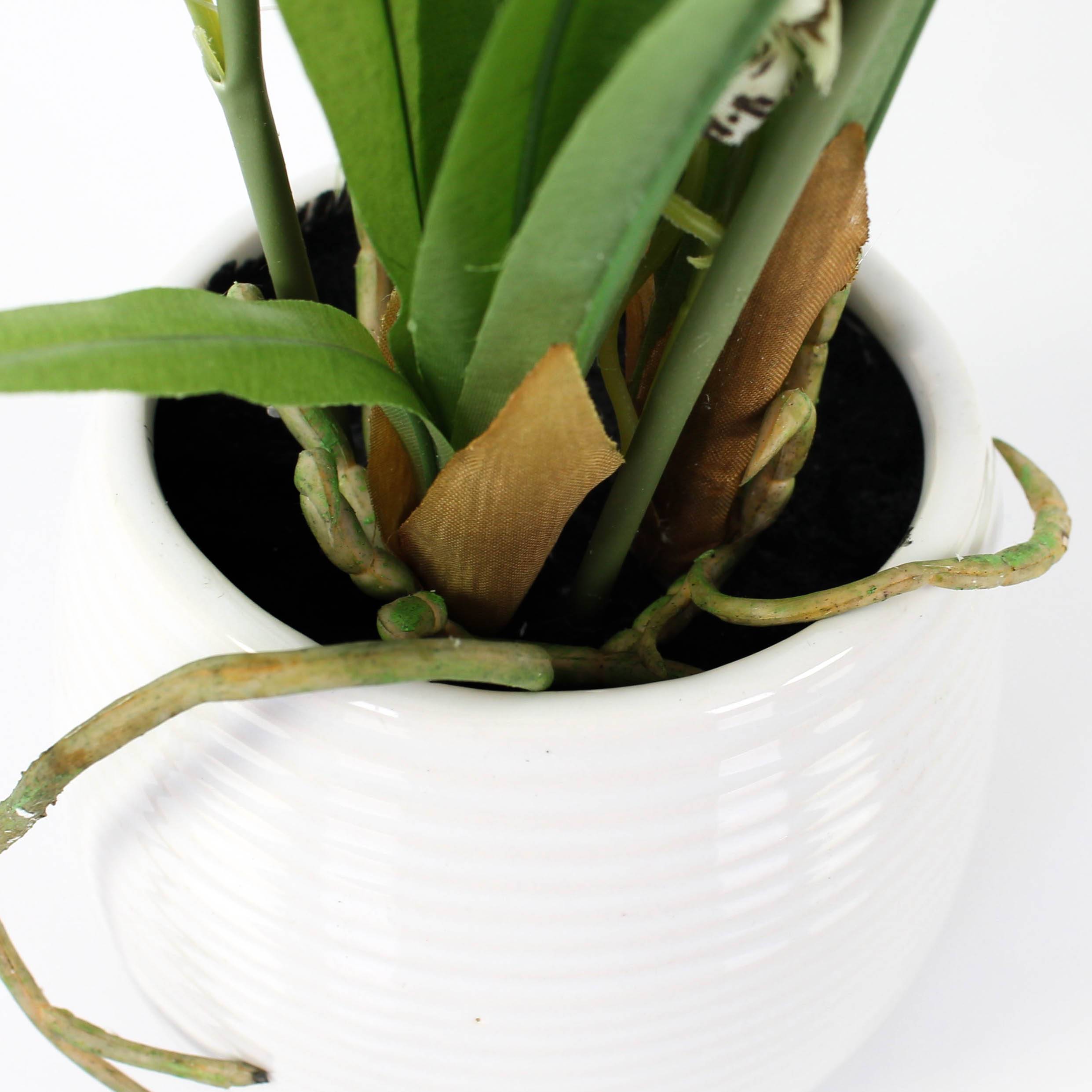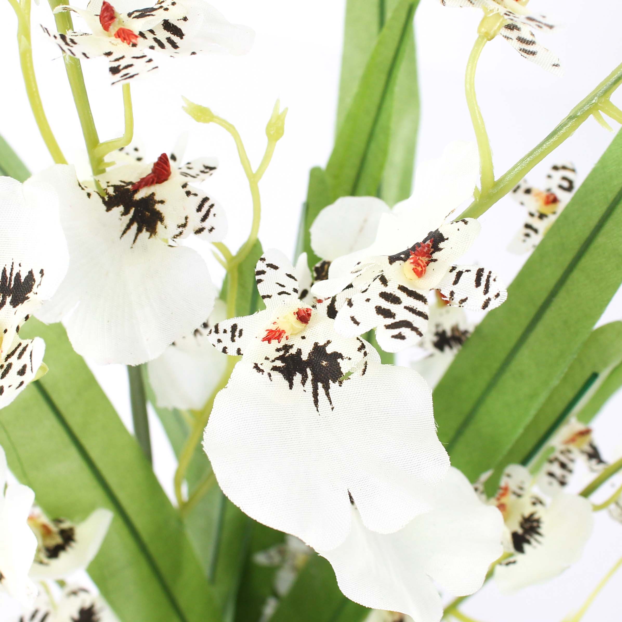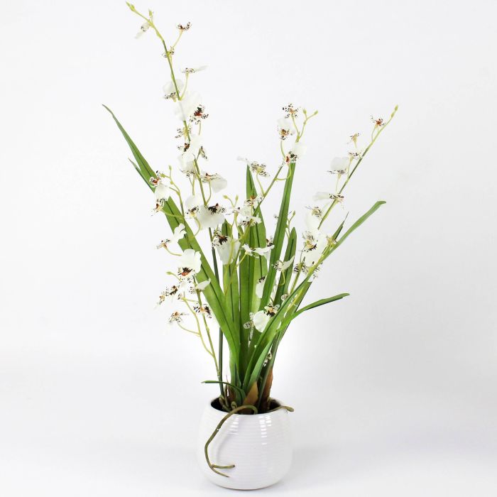 Pequeña y fina orquídea Oncidium con flores de color blanco y marrón en dos ramas. La planta artificial viene en un tiesto de cerámica y mide una altura aproximada de 50 cm en total.