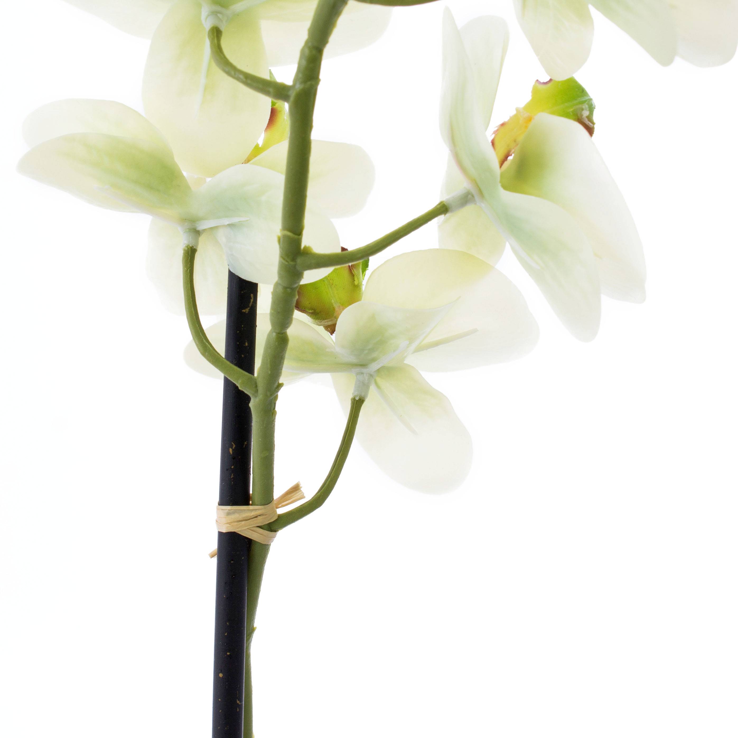 - Con 7 flores (de tacto real) en color verde crema y 4 capullos; con tierra decorativa negra y raíces aéreas, todo firmemente pegado