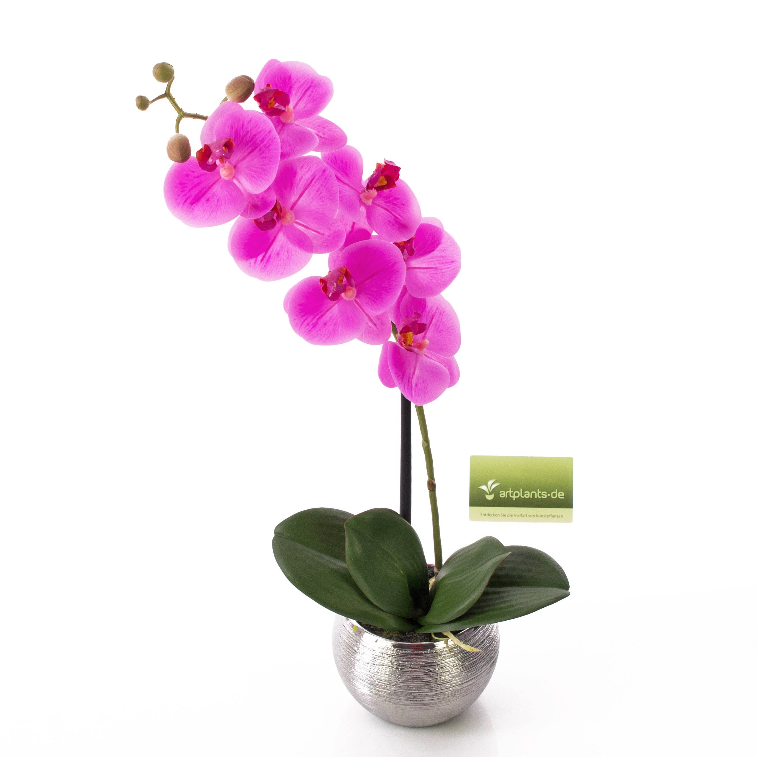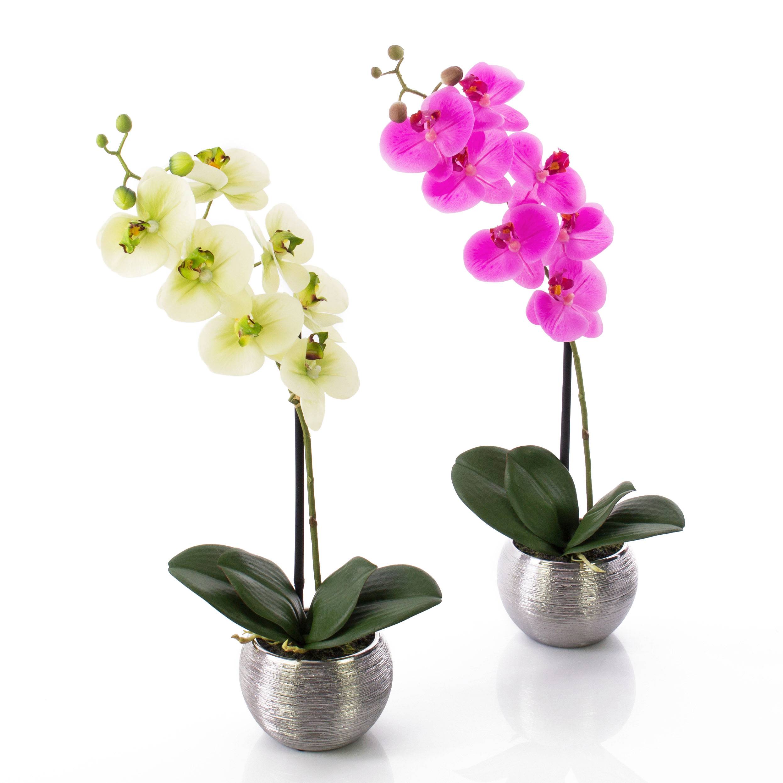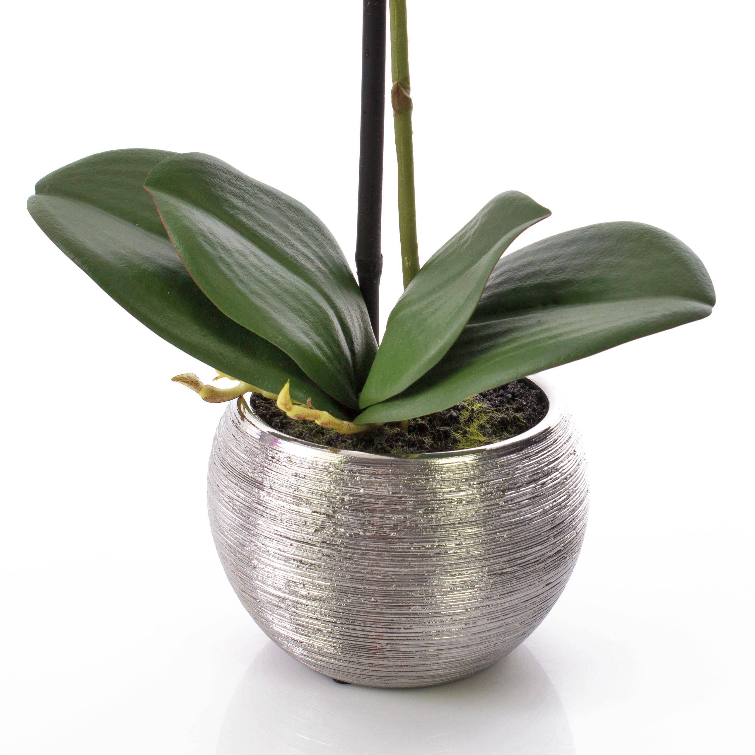 Orquídea de plástico EMILIA en una elegante maceta de color plateado con superficie texturizada. Con una altura de aprox. 45 cm, la flor falsa es ideal para regalar o para decorar la estantería de la pared y muchas otras ideas.