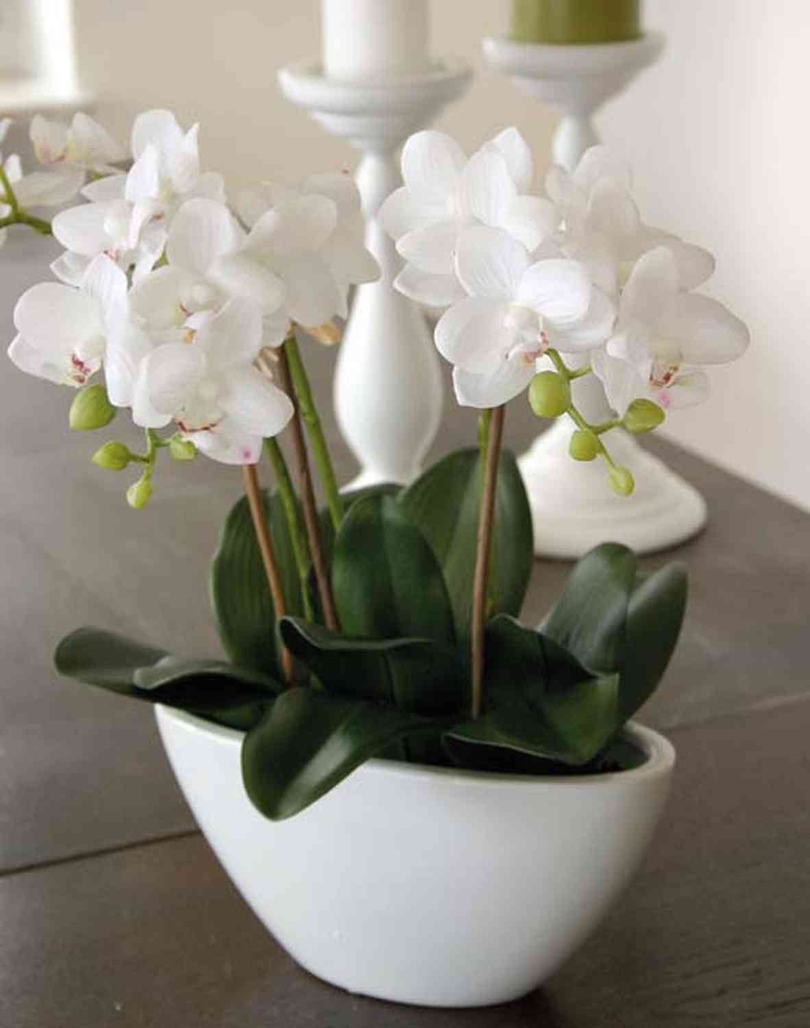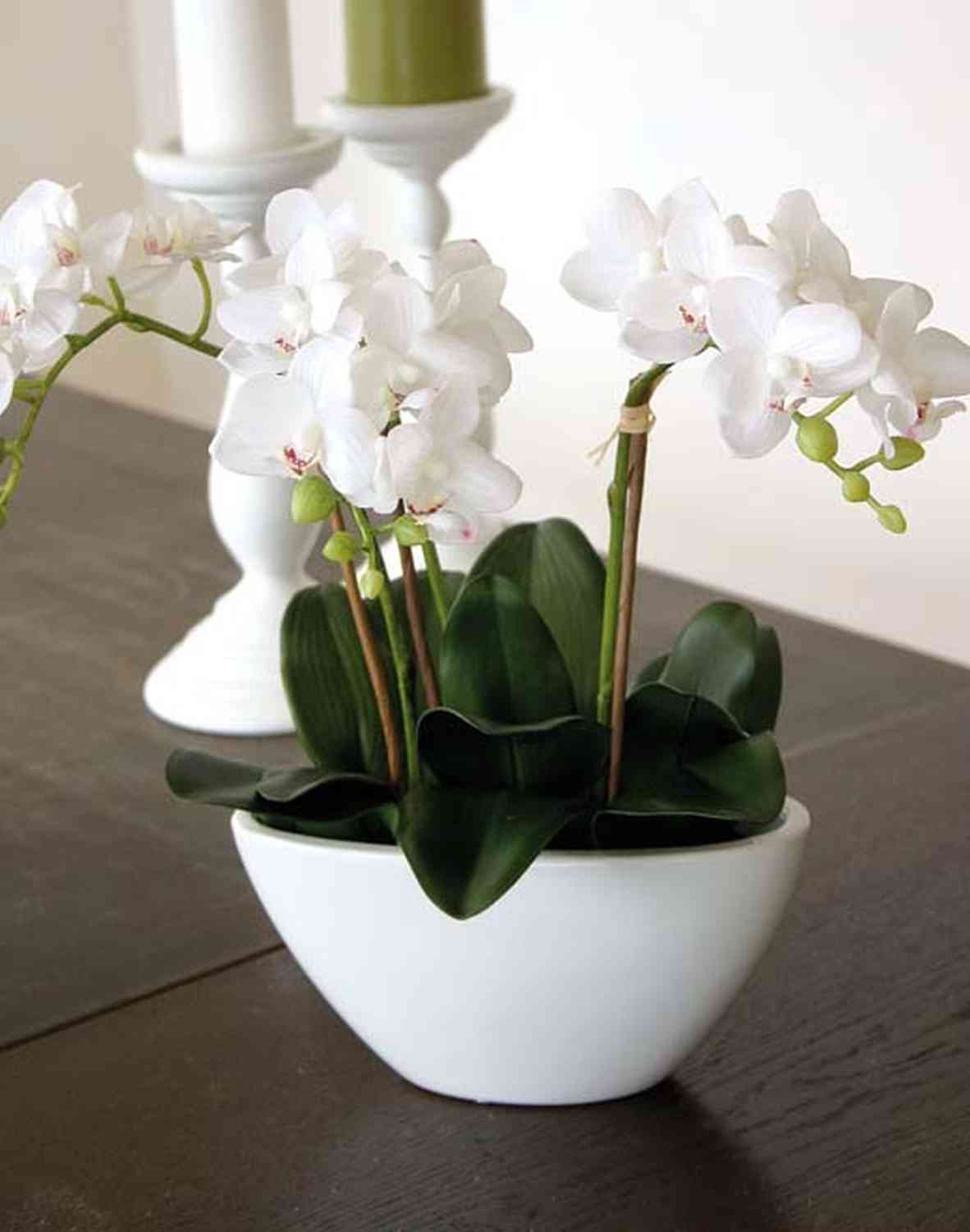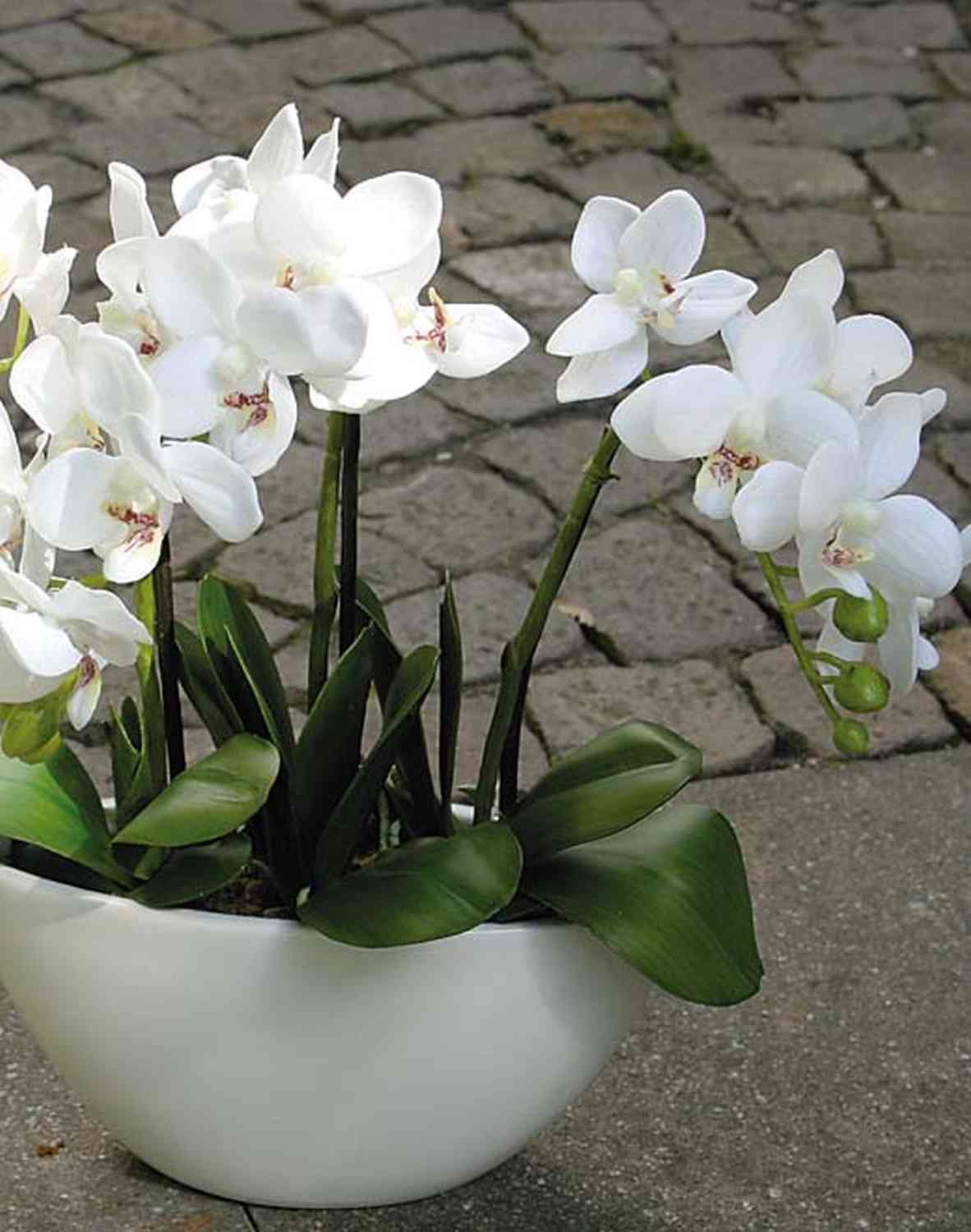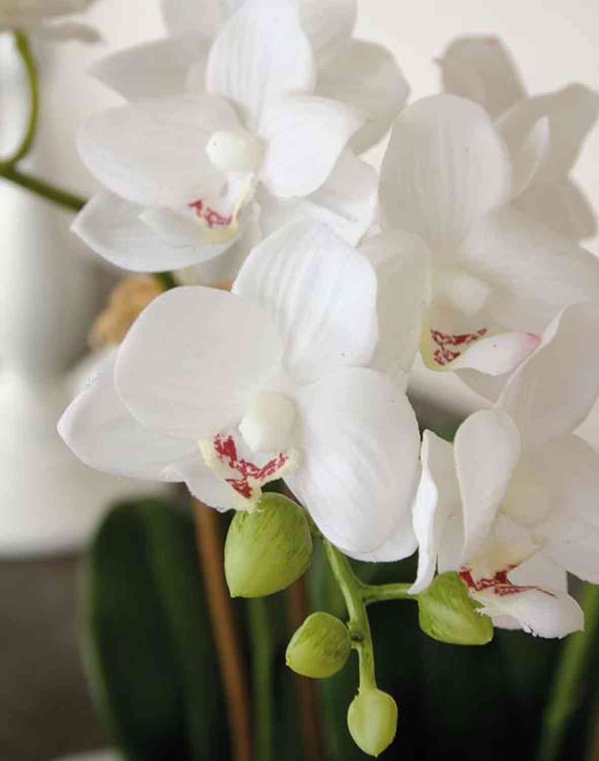 Orquídea artificial Phalaenopsis JASMIN en una hermosa maceta de cerámica. Las flores de aspecto real de la orquídea sintética son de color blanco. Con una altura total de unos 40 cm, la falsa orquídea cabe en cualquier alféizar.