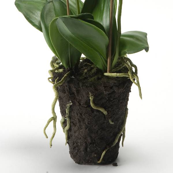 - Con un fardo de tierra artificial en la base (cerca de 12 cm de alto, diámetro superior de aprox. 12 cm, diámetro inferior de aprox. 8,5 cm) con muchas raíces aéreas, todo pegado sólidamente