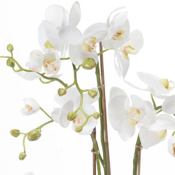 Orquídea Phalaenopsis PABLA de color blanco y amarillo con 4 ramas. La planta artificial consta de un fardo de tierra en la base con raíces aéreas y mide unos 80 cm de alto en total.