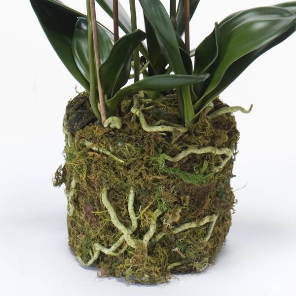 - Con un fardo de tierra artificial en la base (cerca de 14 cm de alto, diámetro superior de aprox. 20 cm, diámetro inferior de aprox. 15 cm) con musgo y muchas raíces aéreas, todo pegado sólidamente