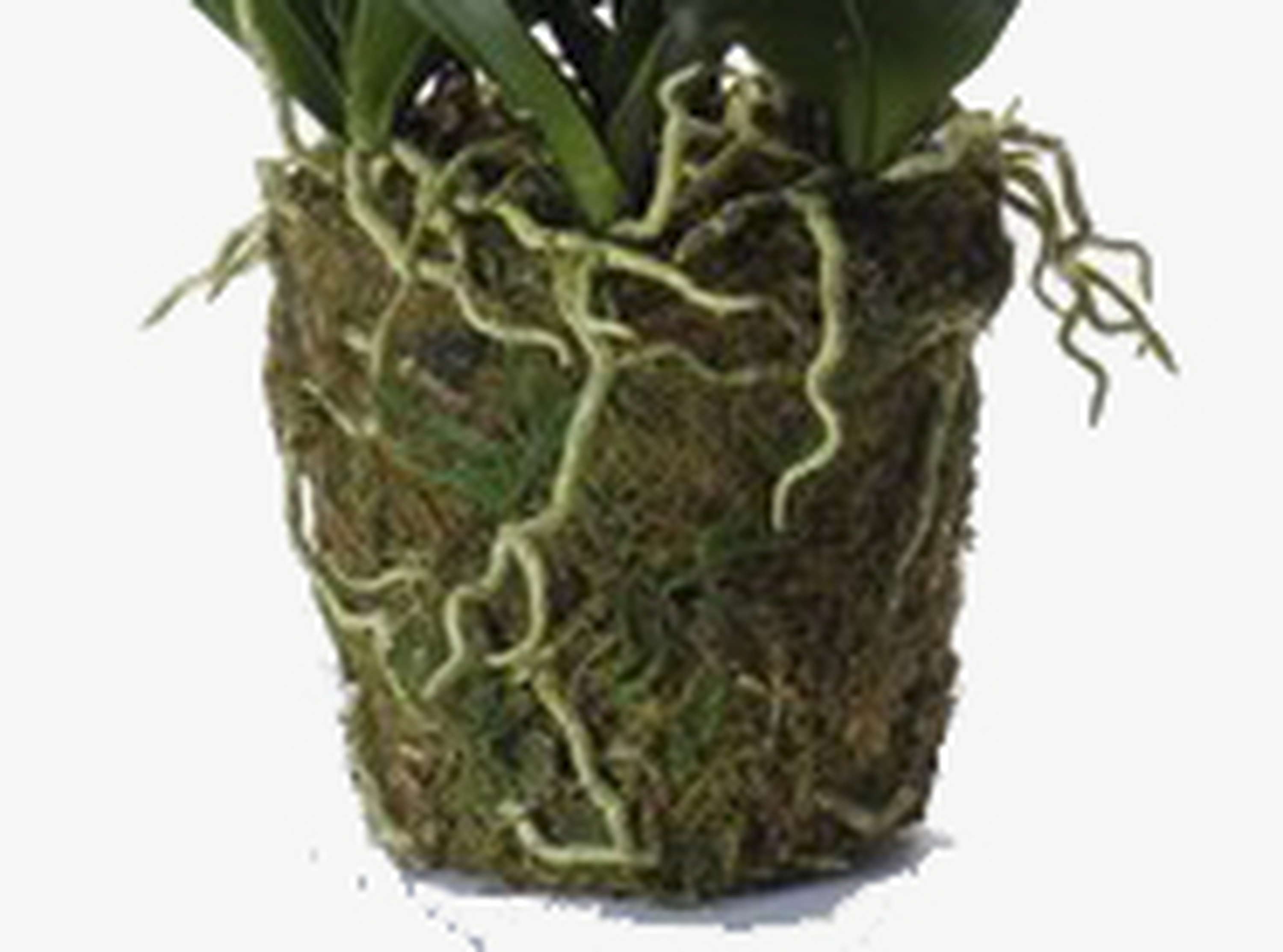 - Con un fardo de tierra artificial en la base (cerca de 20 cm de alto, diámetro superior de aprox. 22 cm, diámetro inferior de aprox. 18 cm) con musgo y muchas raíces aéreas, todo pegado sólidamente