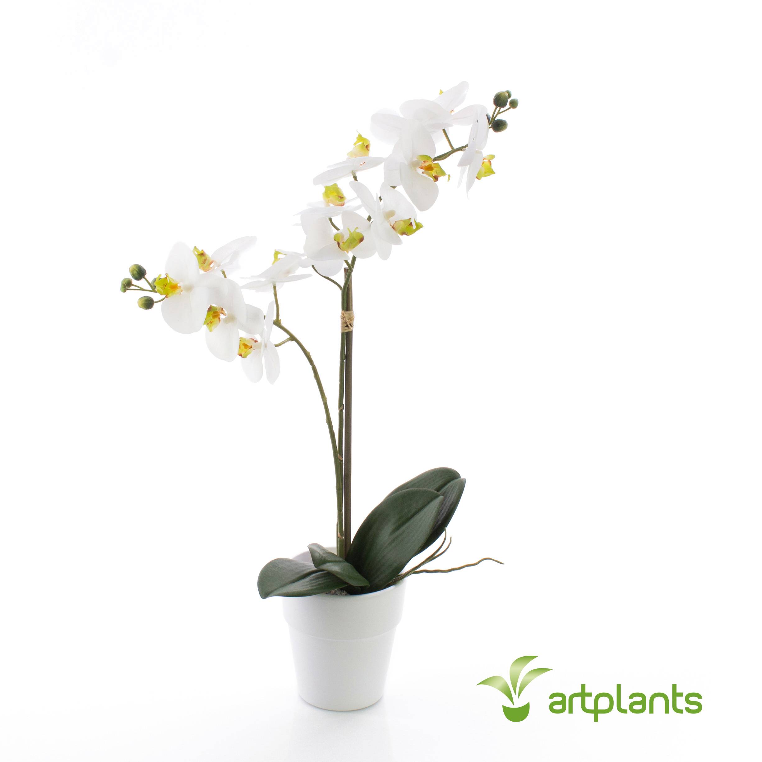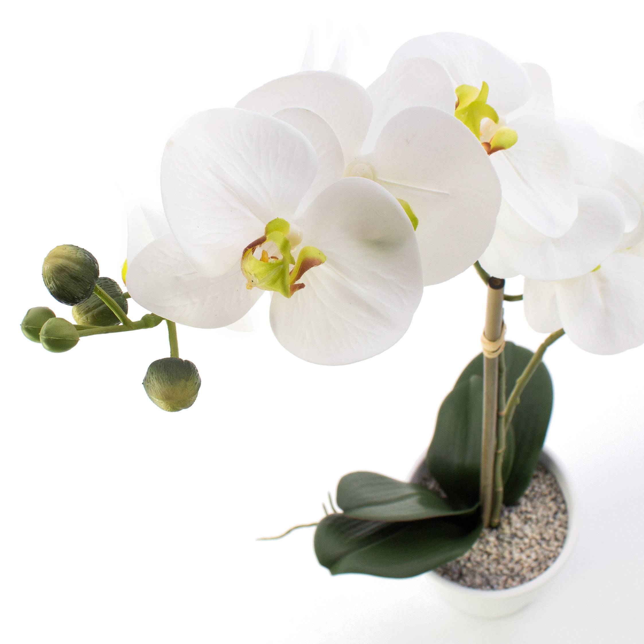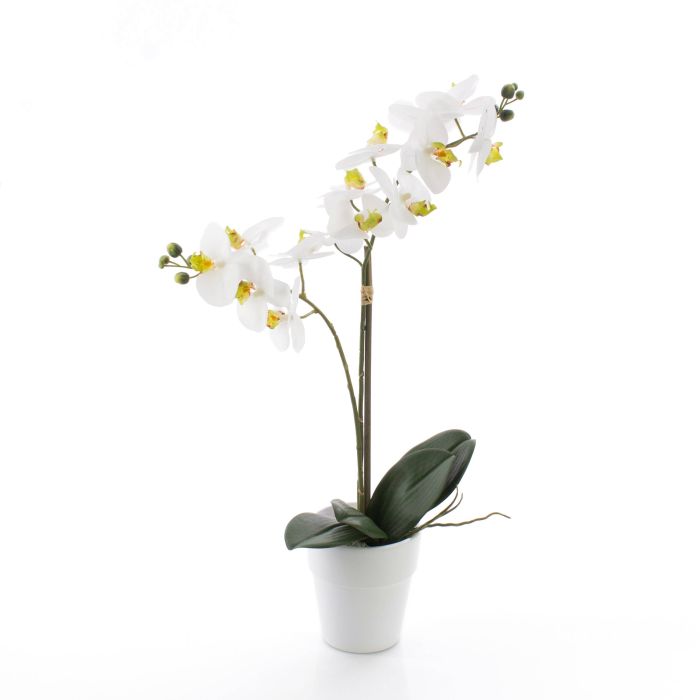 La orquídea artificial phalaenopsis CANDIDA con dos ramas en color verde y flores en color blanco es ideal para decoraciones en salas de estar, dormitorios o comedores.