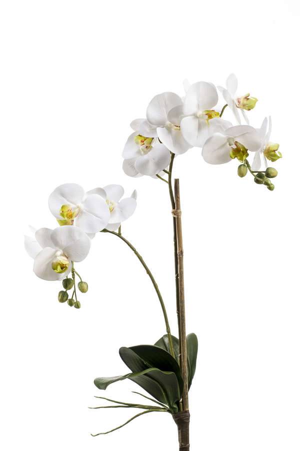 La orquídea artificial phalaenopsis CANDIDA con dos ramas en color verde y flores en color blanco es ideal para decoraciones en salas de estar, dormitorios o comedores.