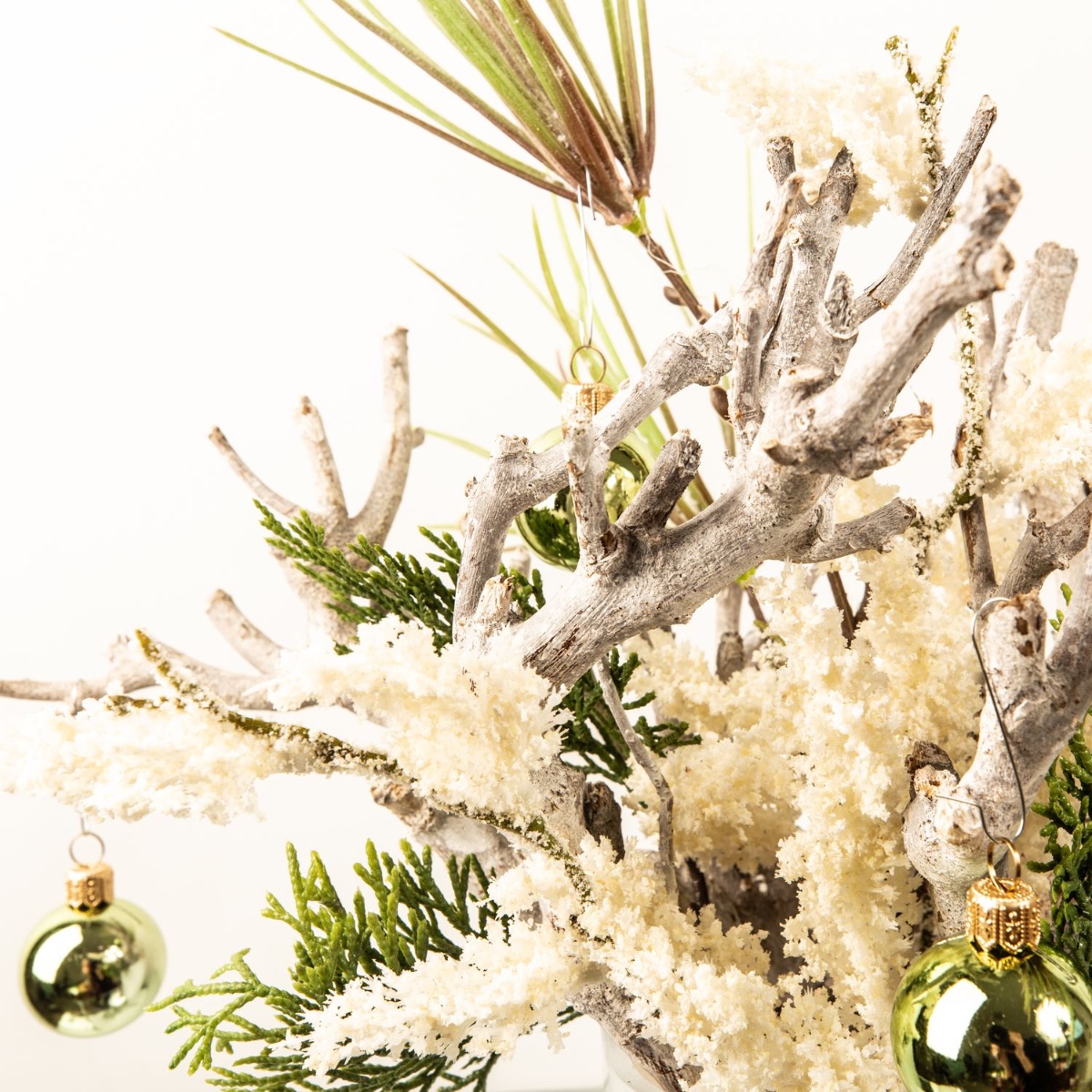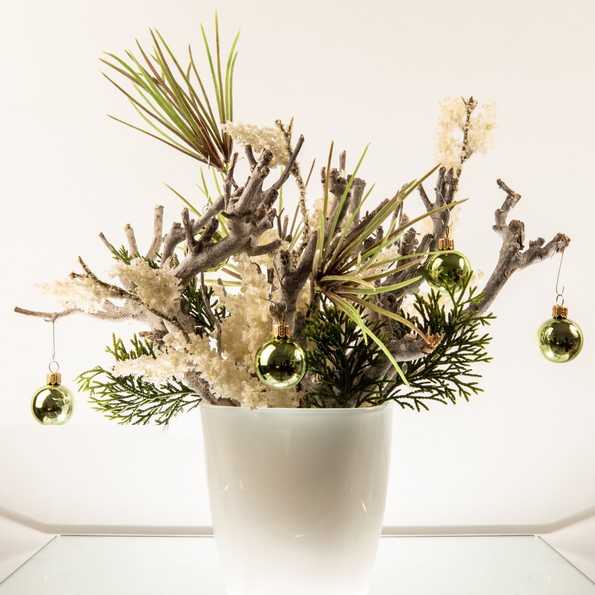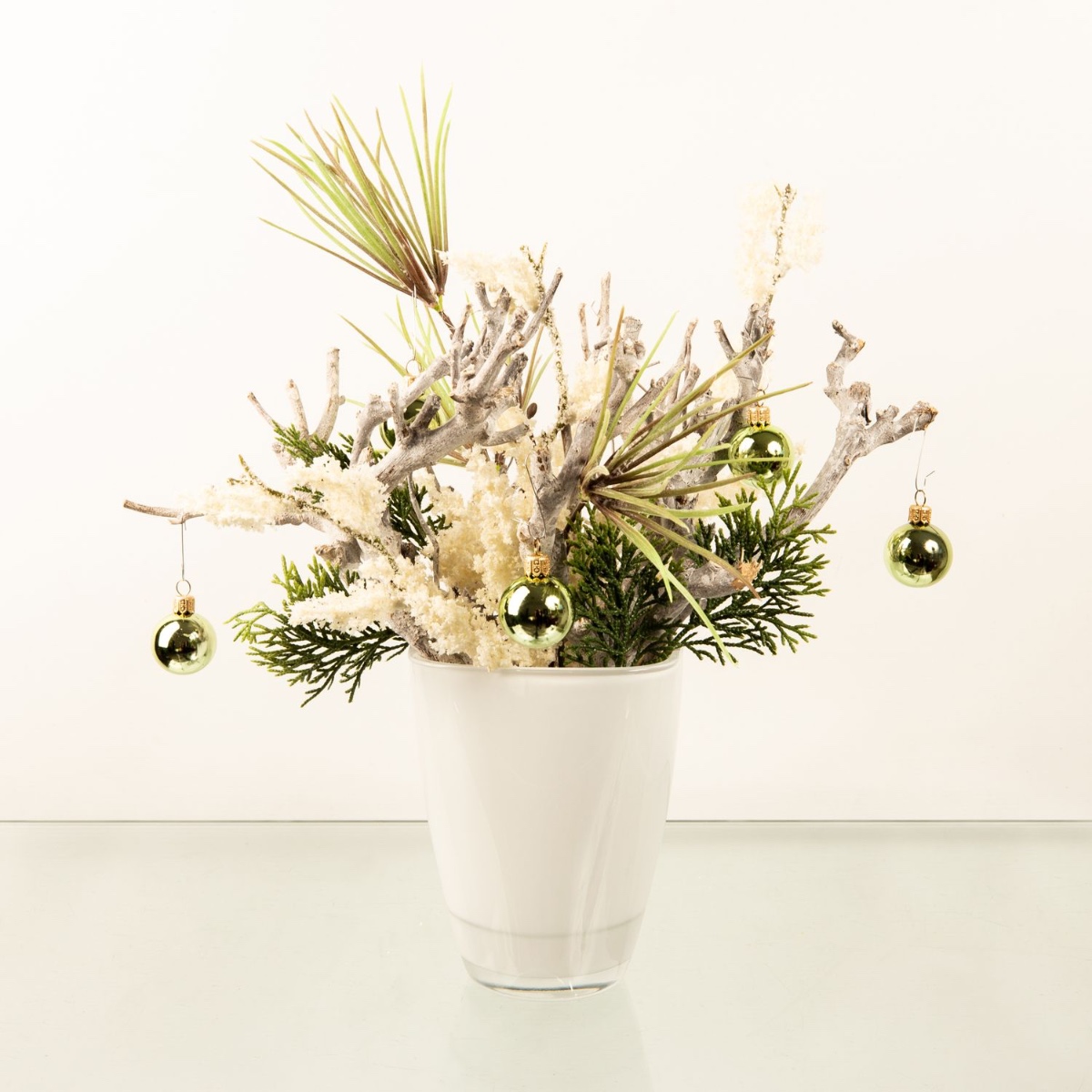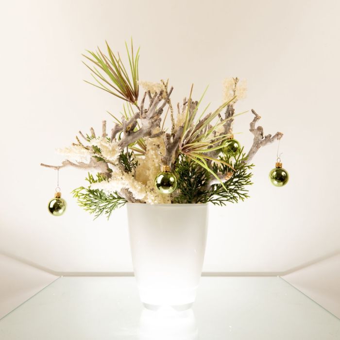 ¡Blanco y verde! Como base se utilizaron ramas encaladas, que se combinaron con una rama de pino y otra de cedro para crear un bonito arreglo. Una maceta blanca para orquídeas es perfecta para las ramas cortas de madera. La rama de brezo blanco, que parece como si acabara de caer la primera nevada, llama especialmente la atención. Las bolas verdes crean el ambiente navideño. ¡Compra el look!