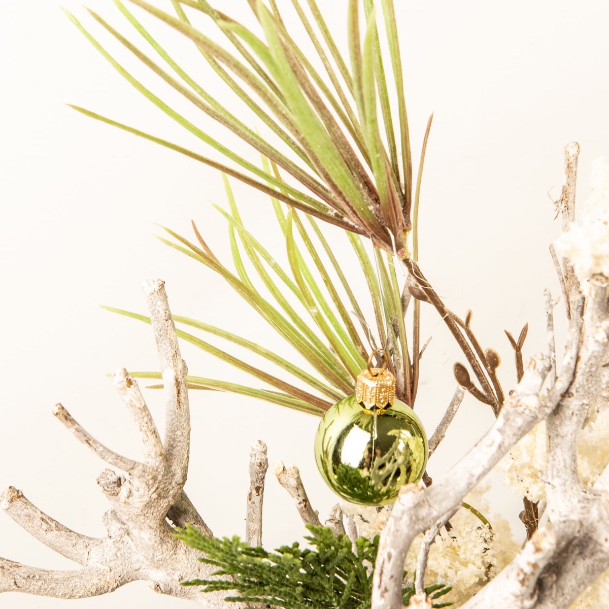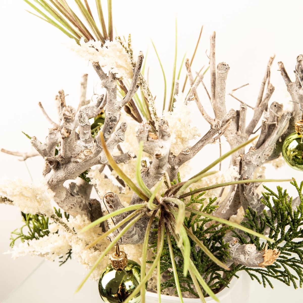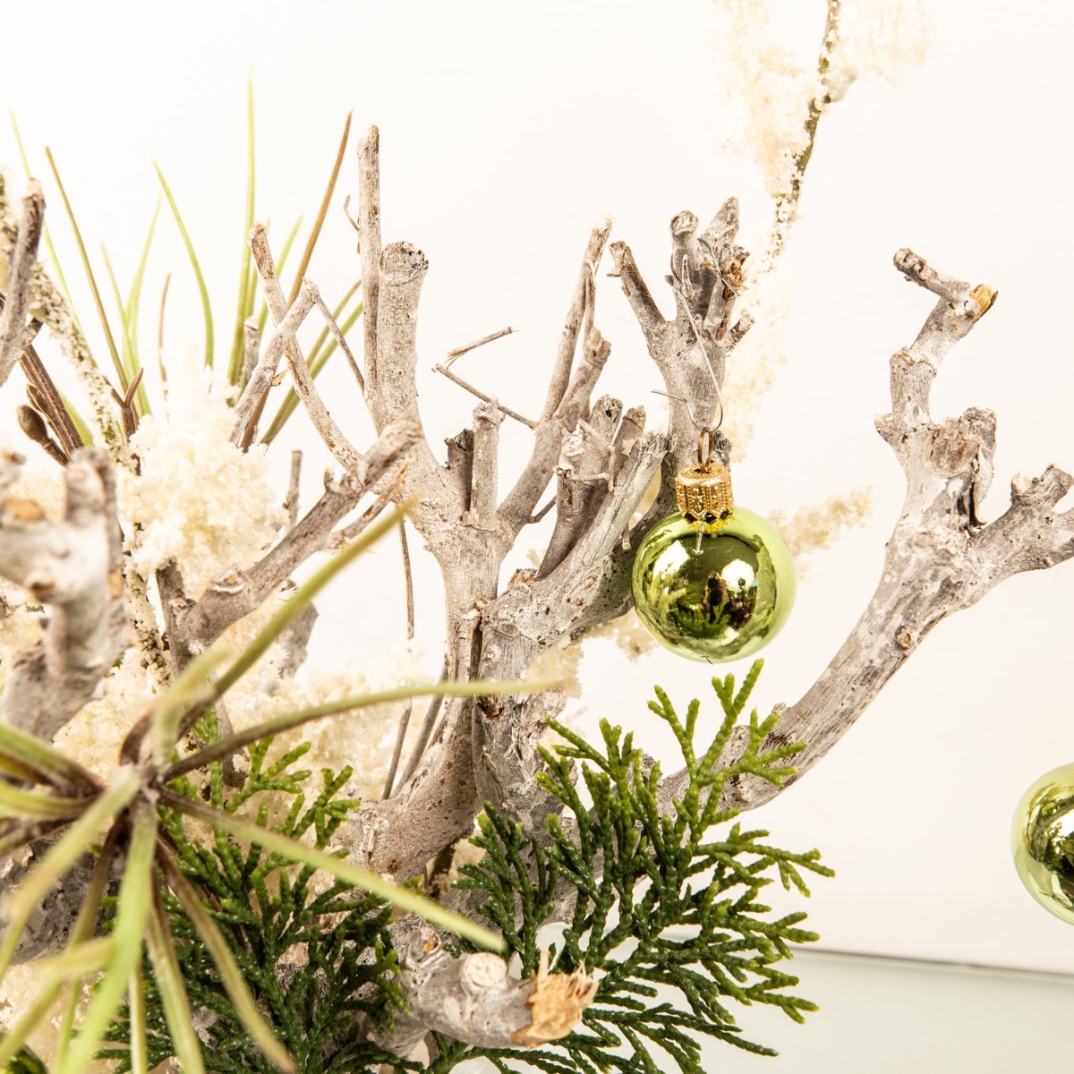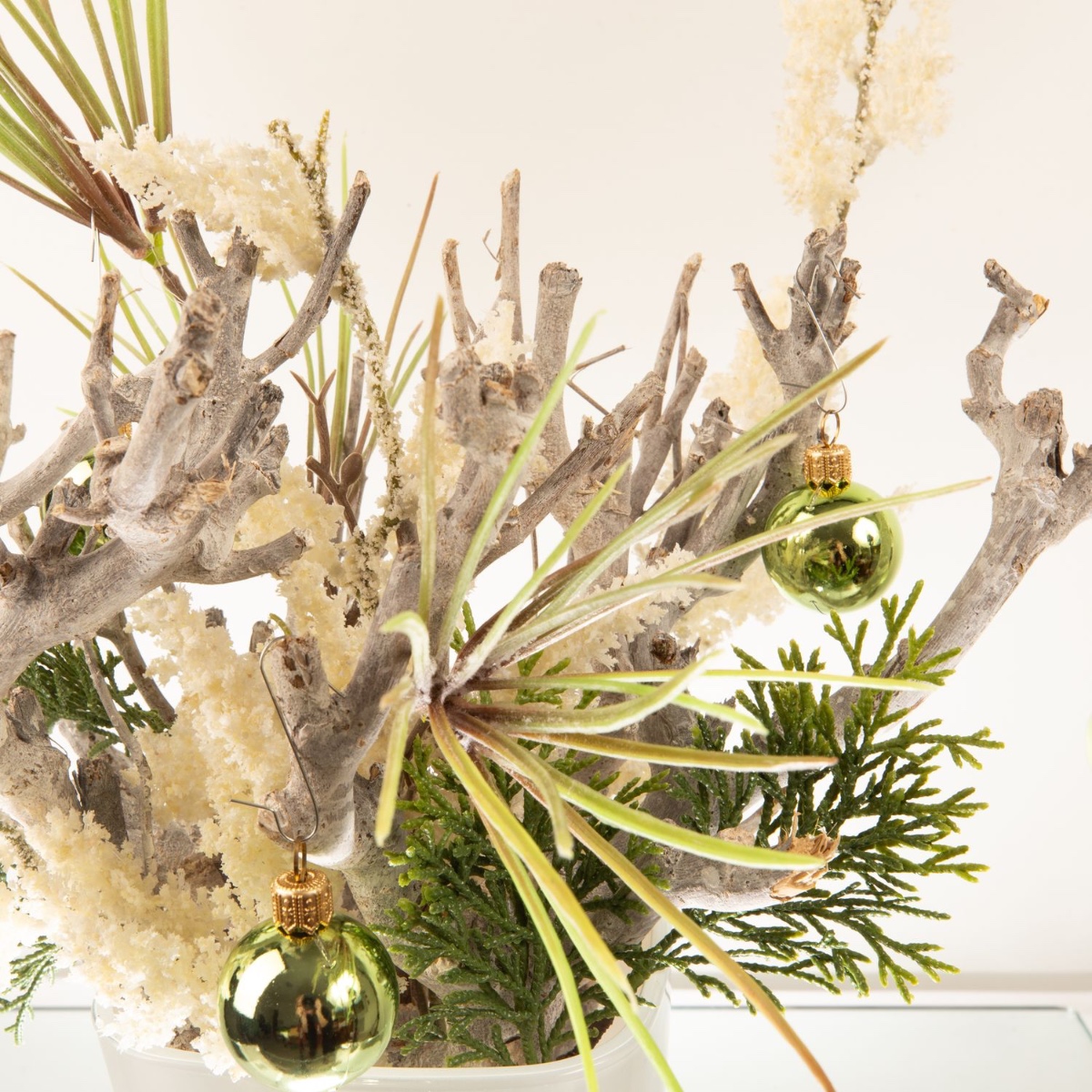 ¡Blanco y verde! Como base se utilizaron ramas encaladas, que se combinaron con una rama de pino y otra de cedro para crear un bonito arreglo. Una maceta blanca para orquídeas es perfecta para las ramas cortas de madera. La rama de brezo blanco, que parece como si acabara de caer la primera nevada, llama especialmente la atención. Las bolas verdes crean el ambiente navideño. ¡Compra el look!