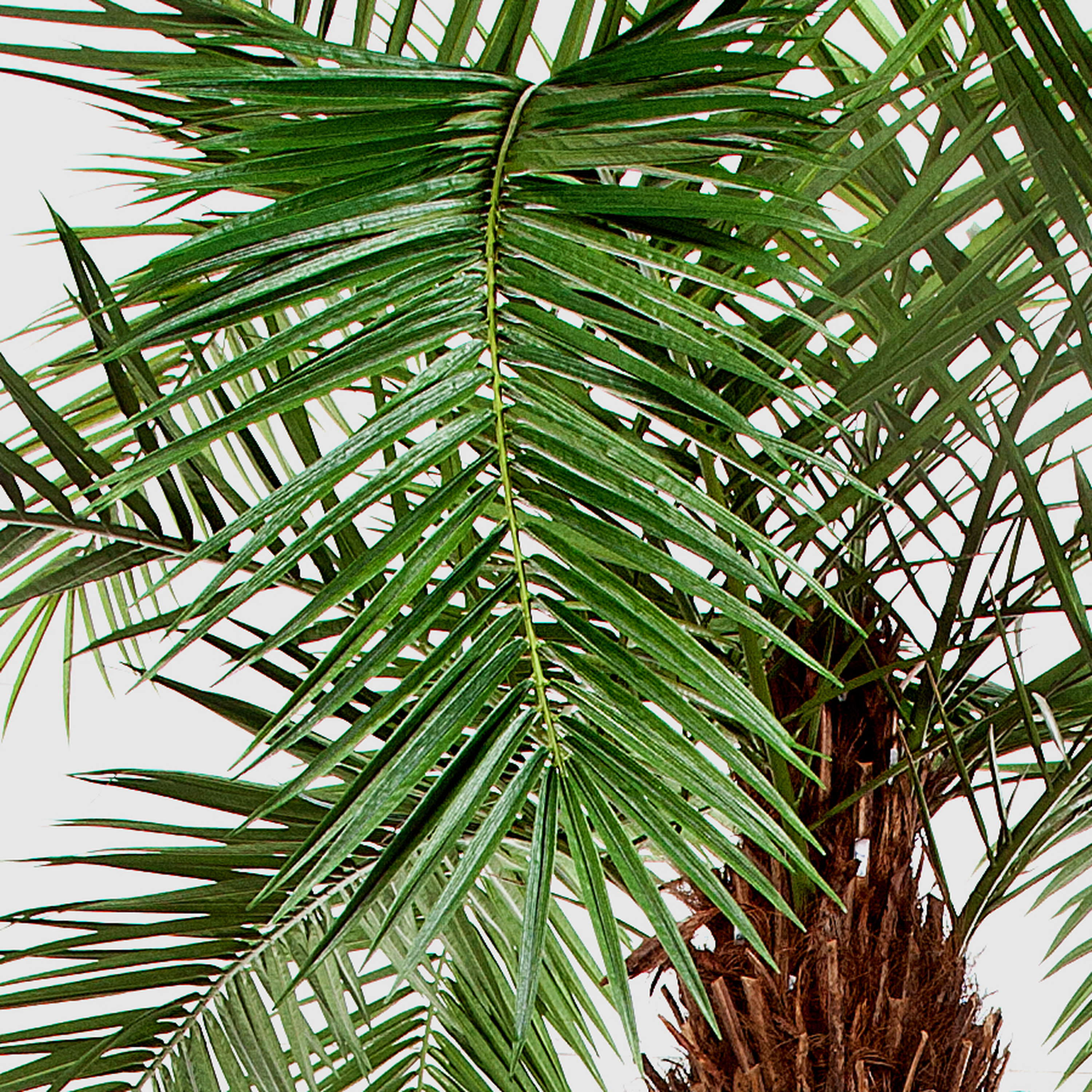 Bonita palmera fénix artificial con tronco curvo. La palmera tiene una altura total aproximada de 360 cm.