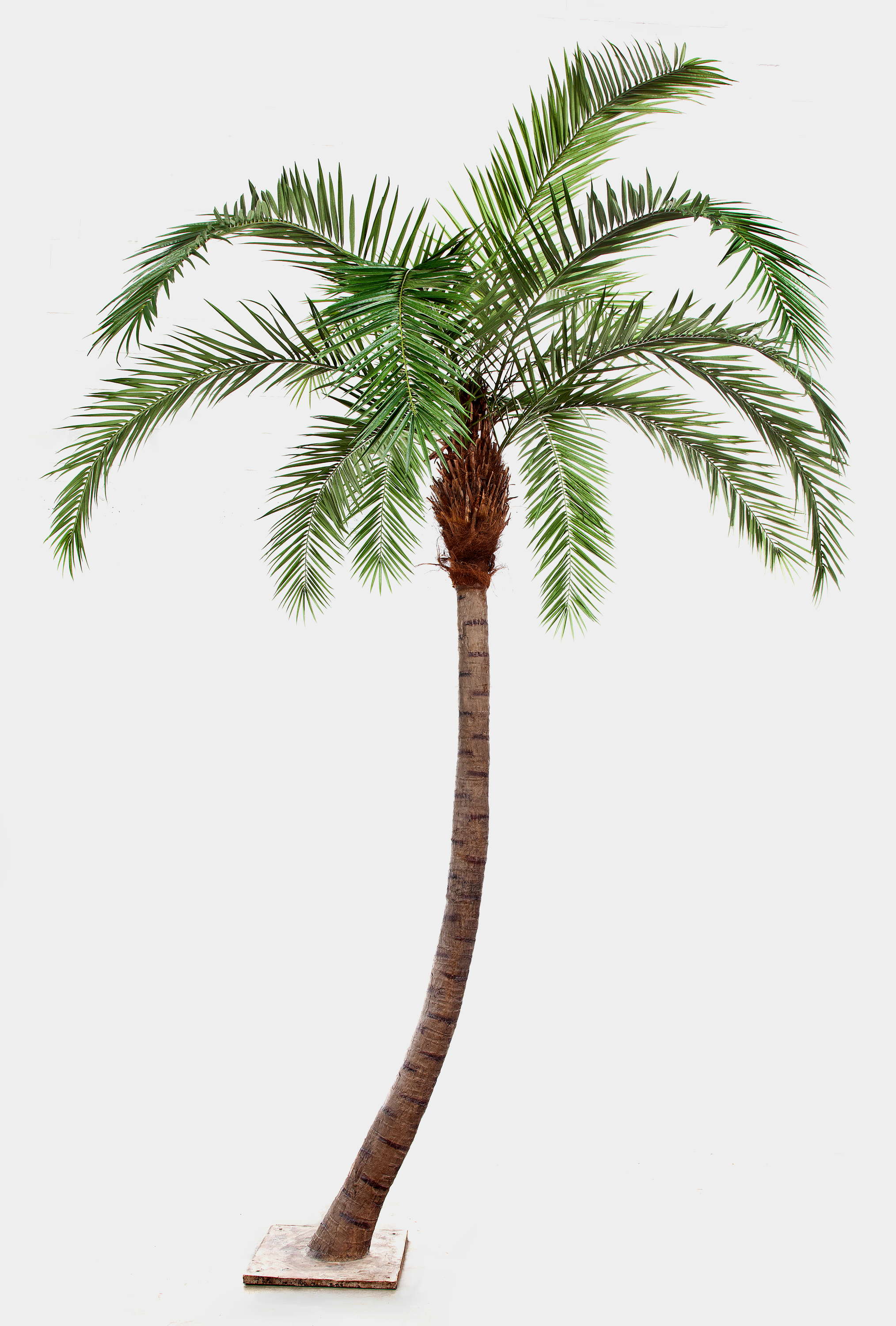 Bonita palmera fénix artificial con tronco curvo. La palmera tiene una altura total aproximada de 390 cm.