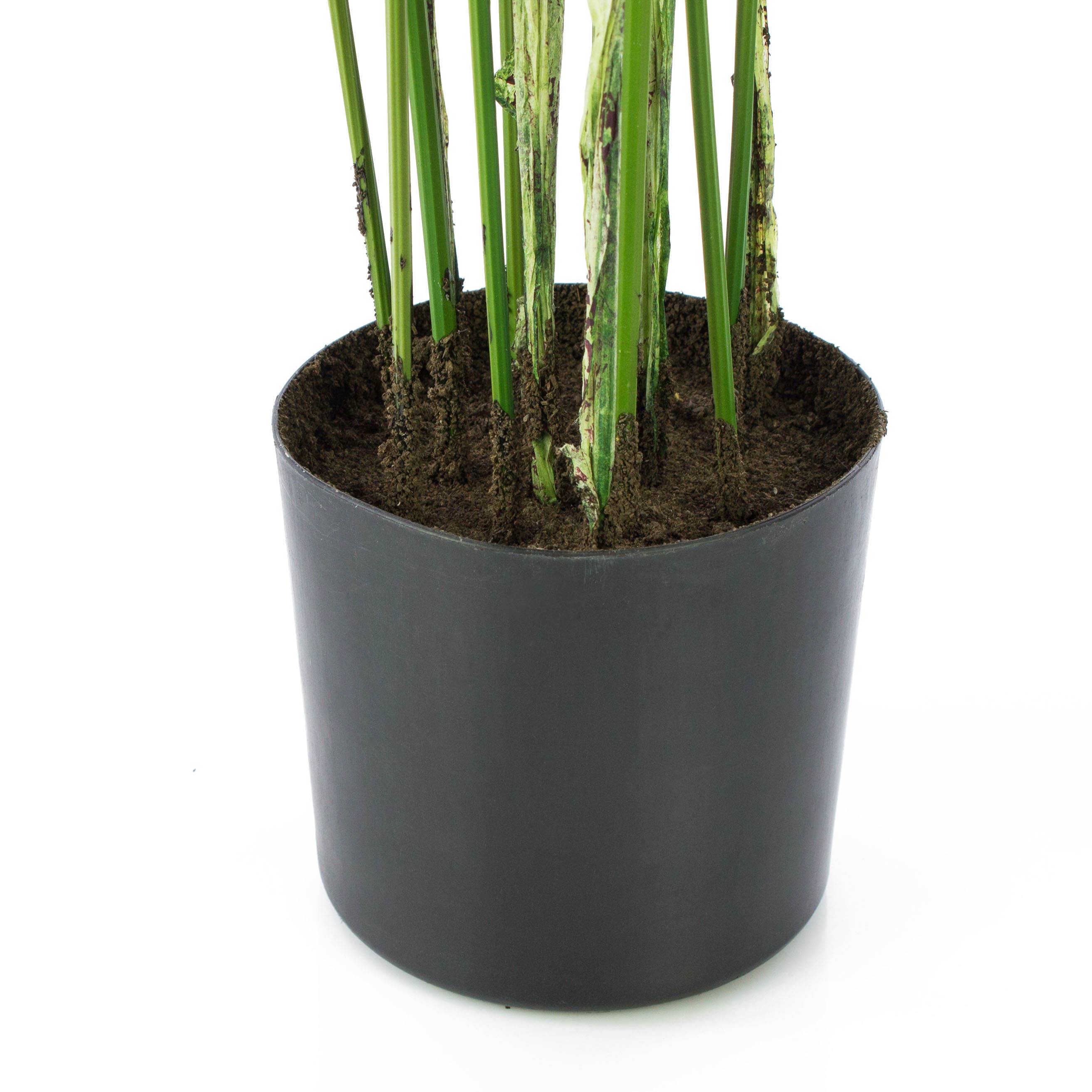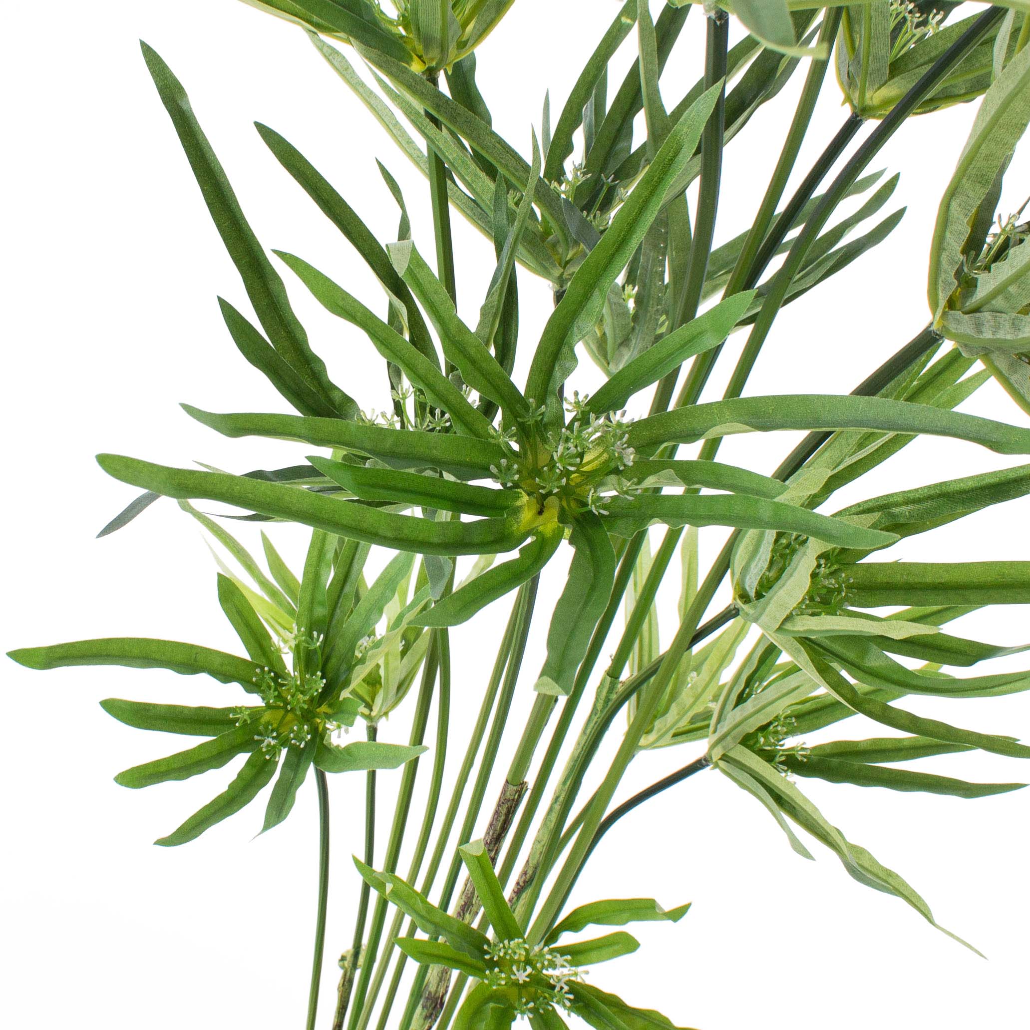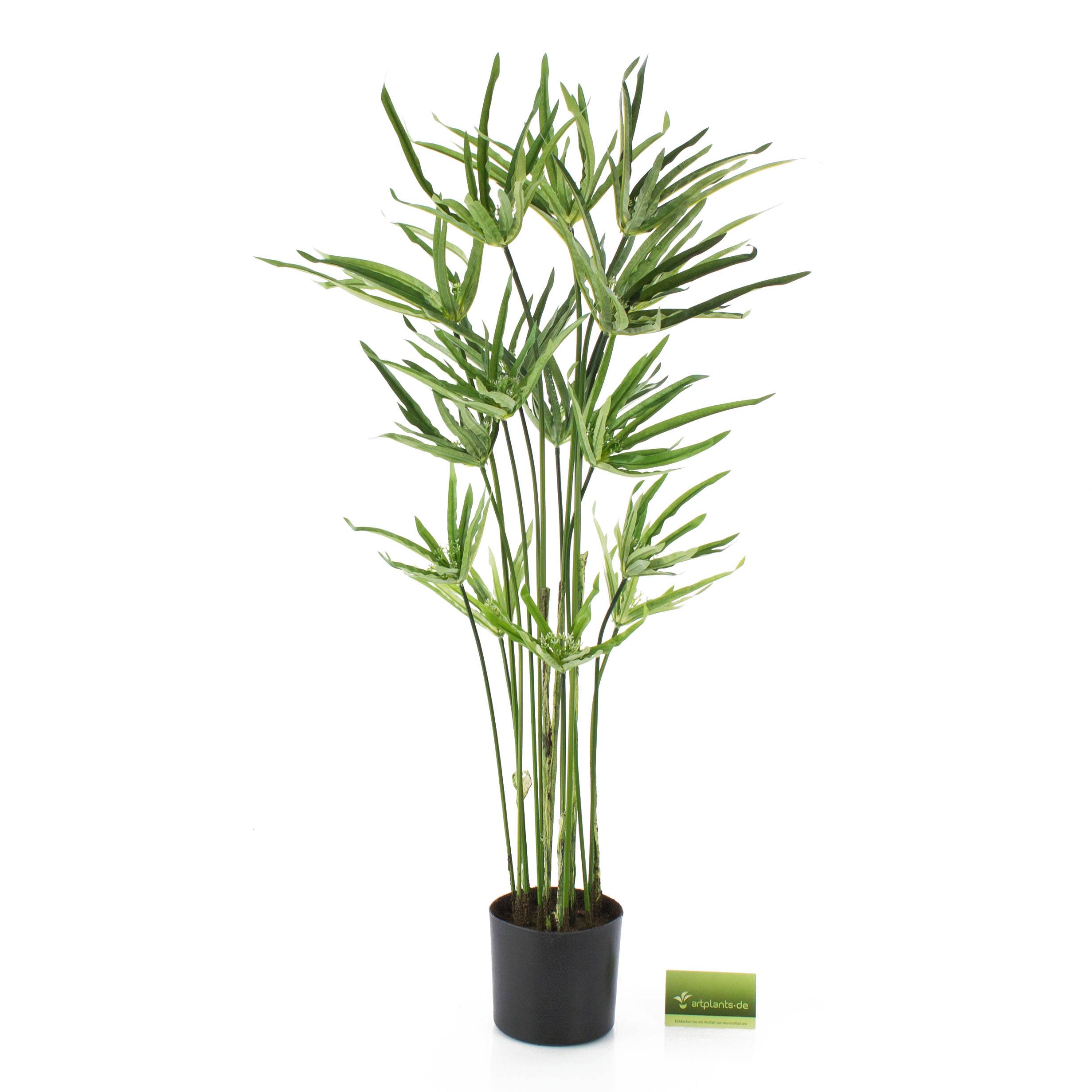Césped artificial de la especie Cyperus con varios tallos. La hierba artificial de 80 cm de alto destaca por sus muchas hojas, que forman un tupido manto.
