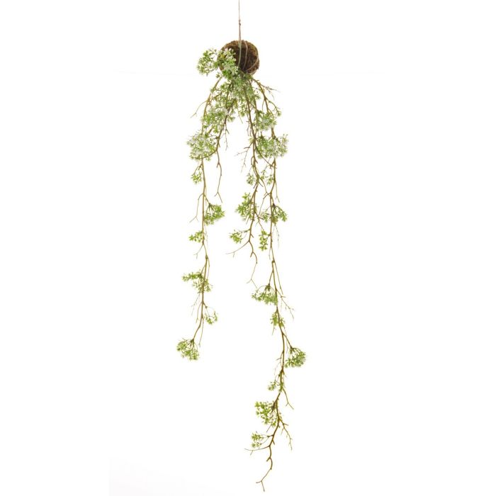 La planta sintética SIRIA de color blanco posee una dimensión total de aprox. 90 cm y se encuentra fijada a una bola de musgo.