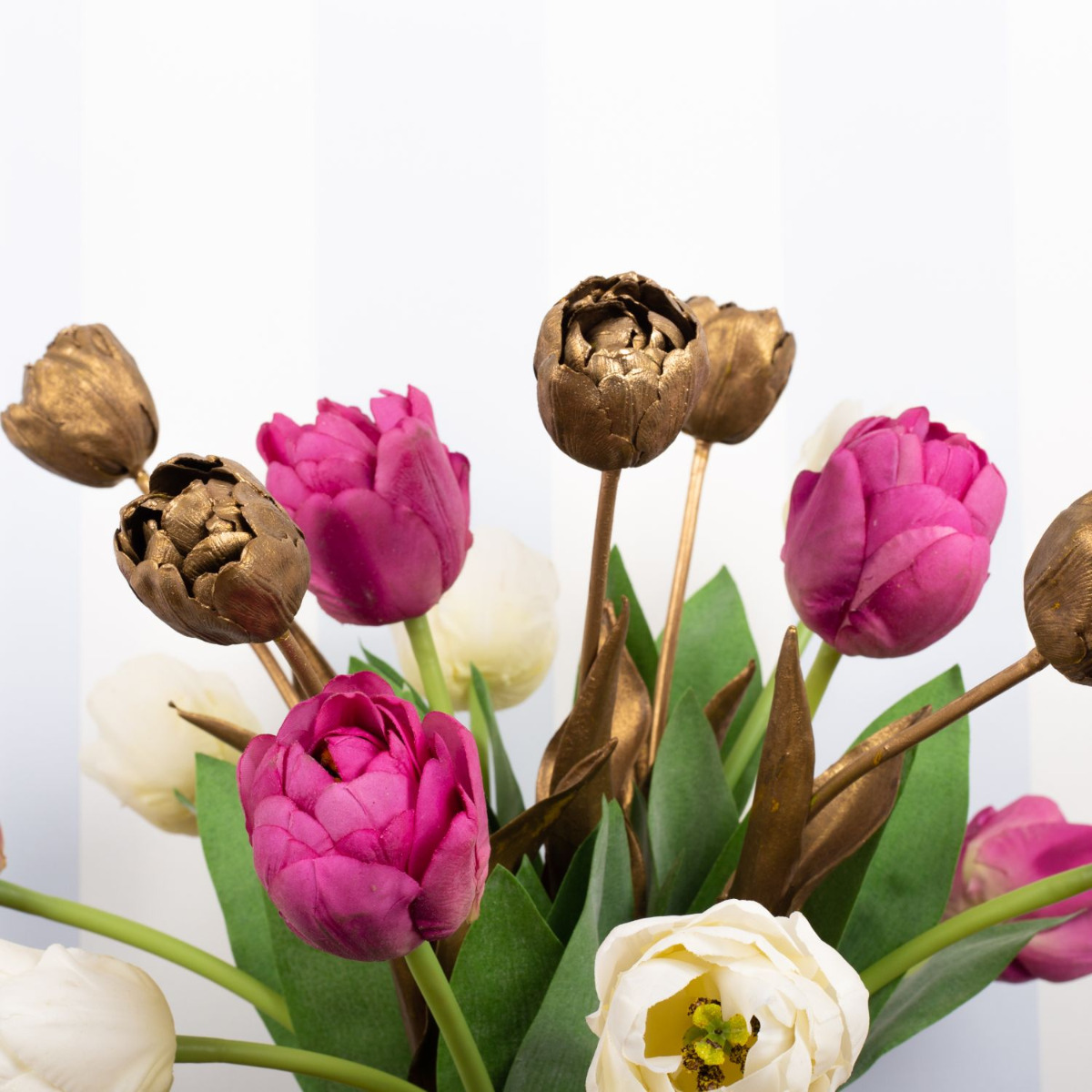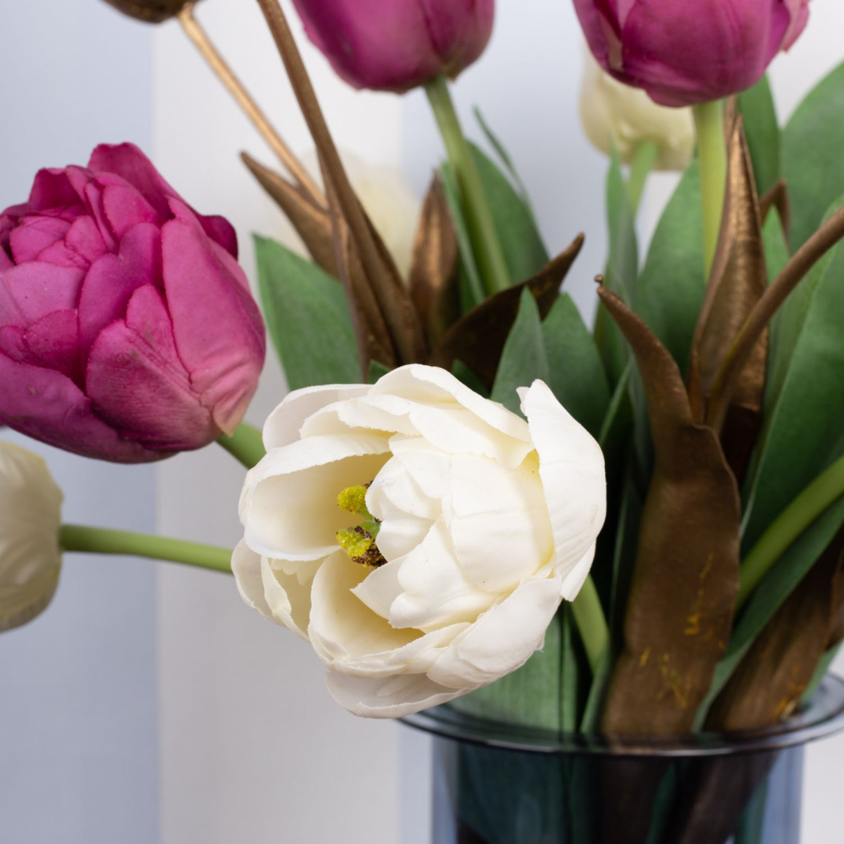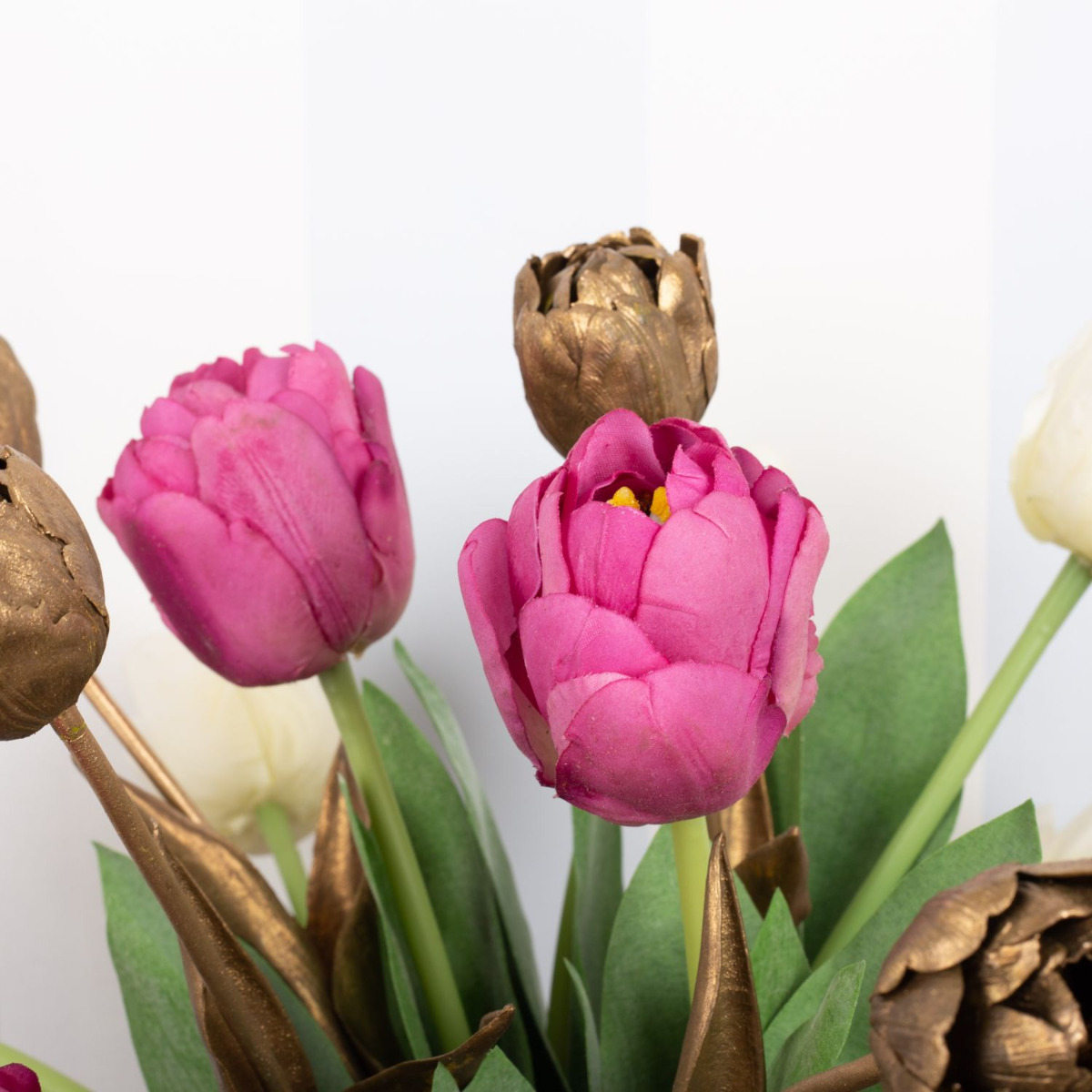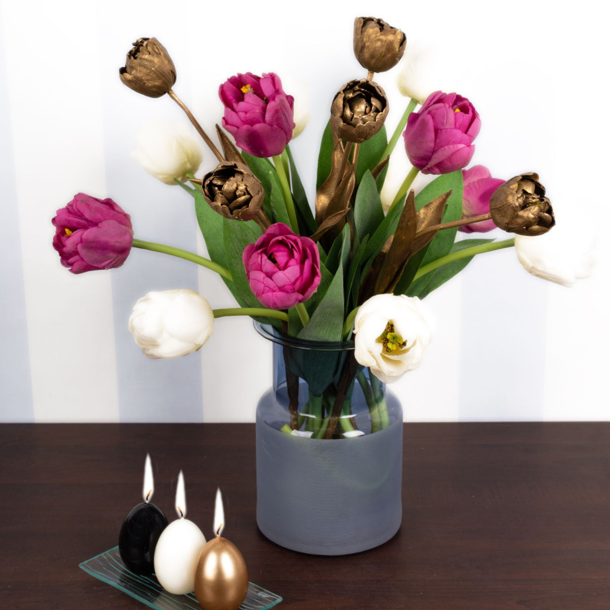Piensa en rosa!¡Por fin llega la primavera! Después de un largo invierno, ¡estás literalmente esperando unos rayos de sol y la primavera que los acompaña! Pero incluso antes de que los tulipanes empiecen a florecer en la naturaleza, podemos traer la colorida estación a nuestros hogares. Nuestros tulipanes rosas y blancos parecen tan reales que hay que mirar dos veces para darse cuenta de que son flores artificiales. Los tulipanes dorados le dan un aspecto especialmente moderno y único. Quien piense que con el frío se acabó el tiempo de las velas, se equivoca. A la gente también le gusta encender una vela en Pascua. Lleva la primavera a tu hogar. ¡Compra el look!