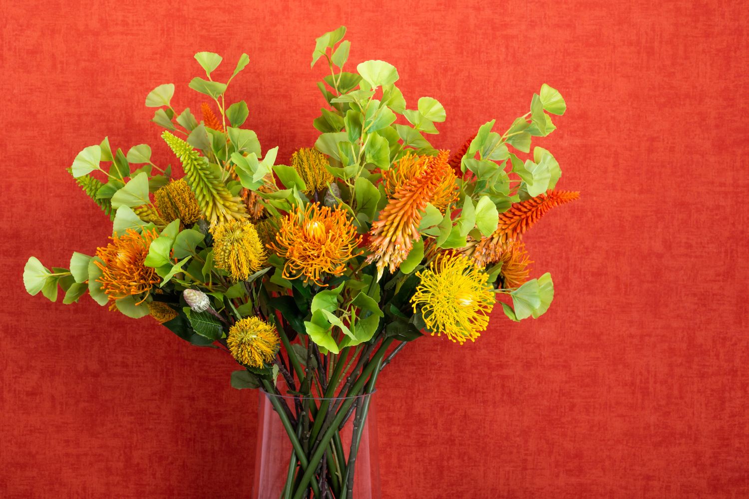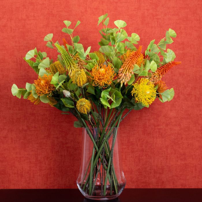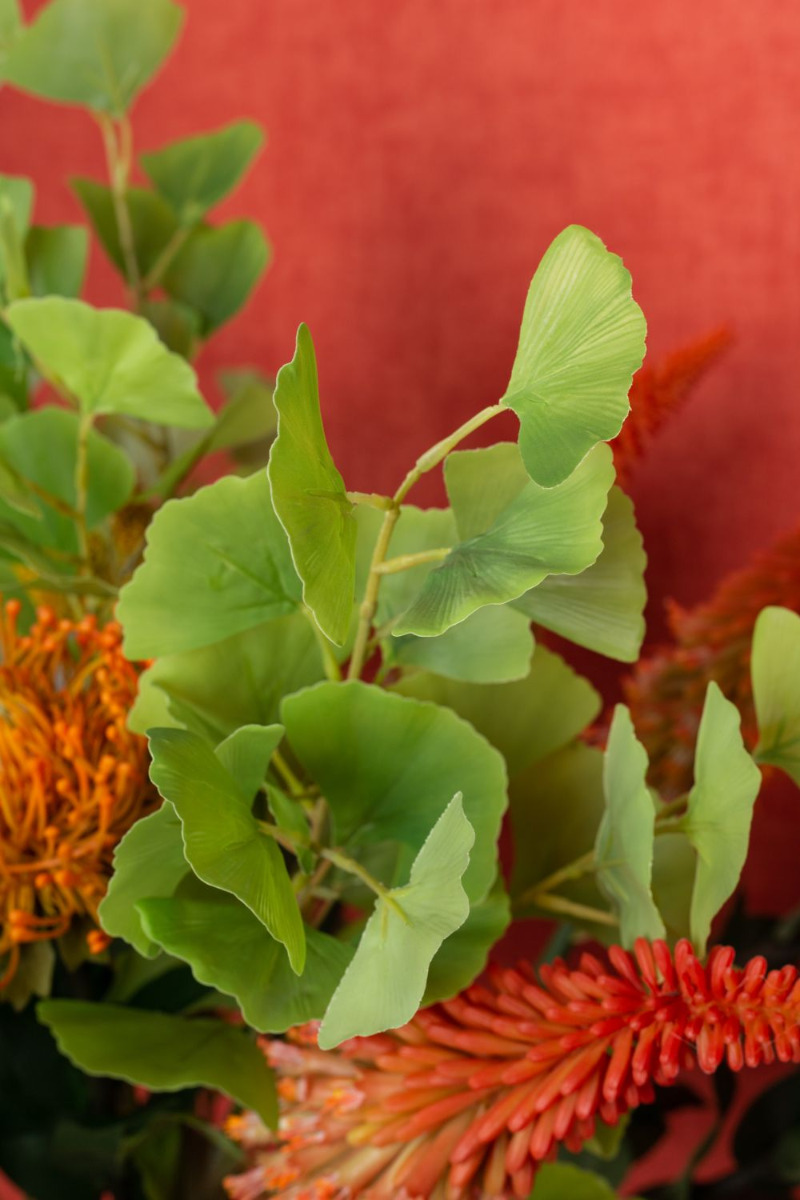 Consejo de diseño:Distribuye las flores uniformemente sobre el jarrón y aligéralas con las hojas de gingko.