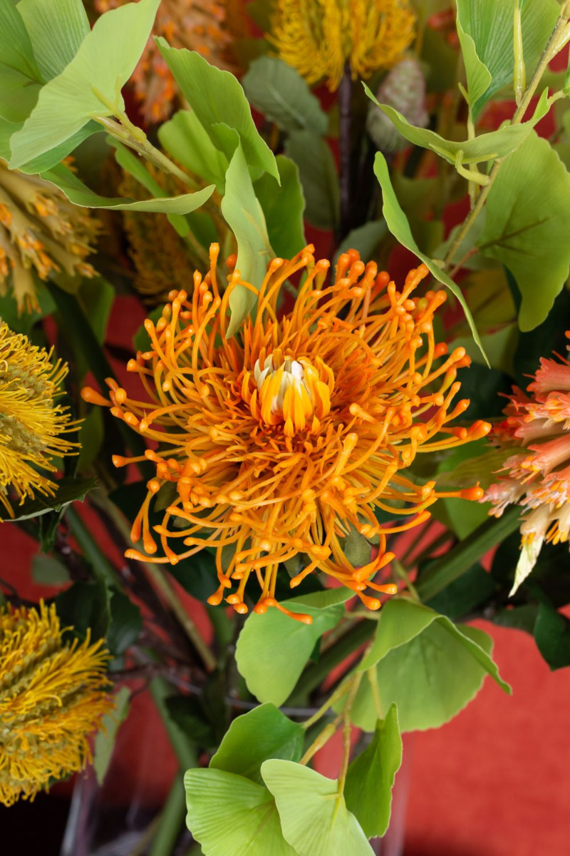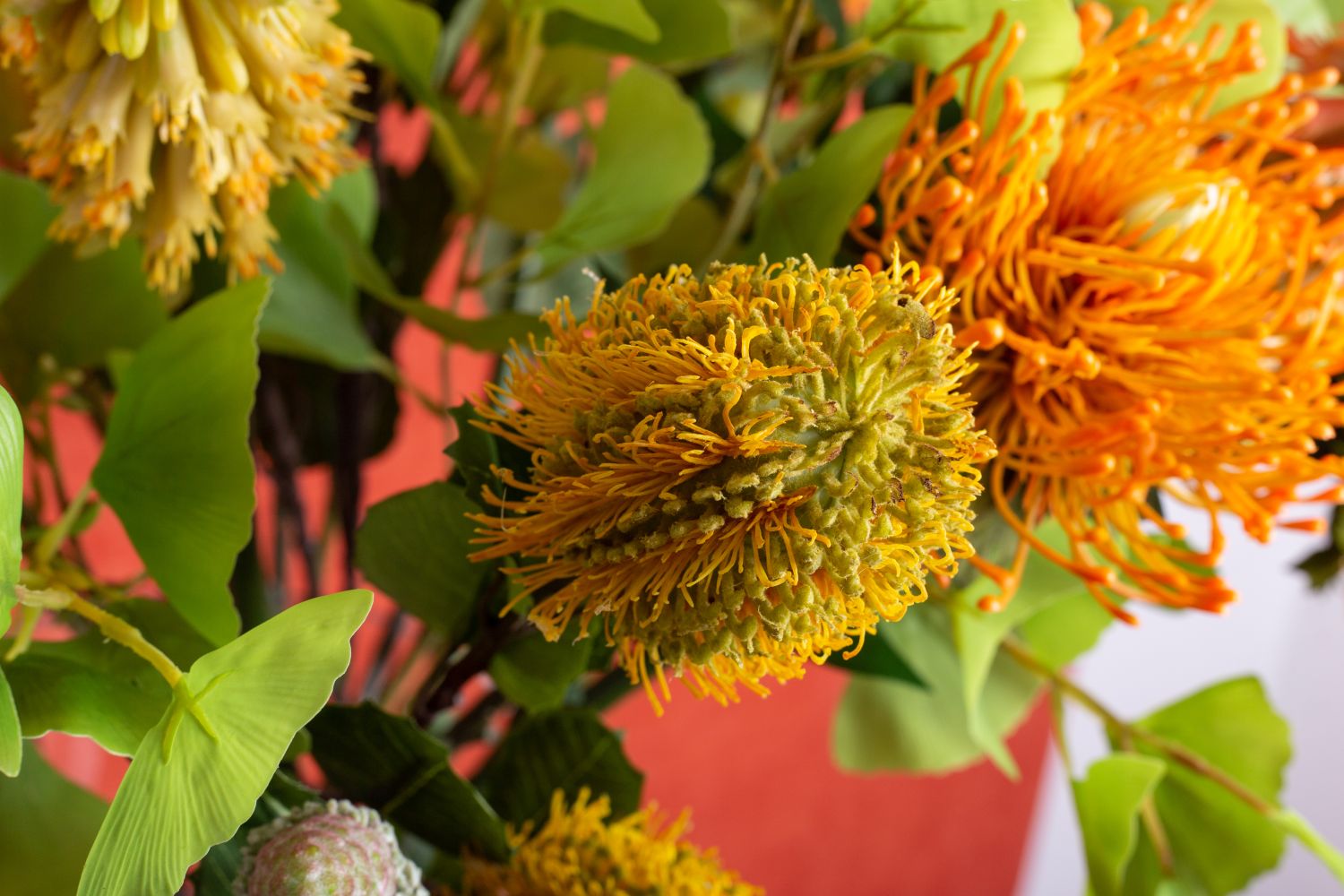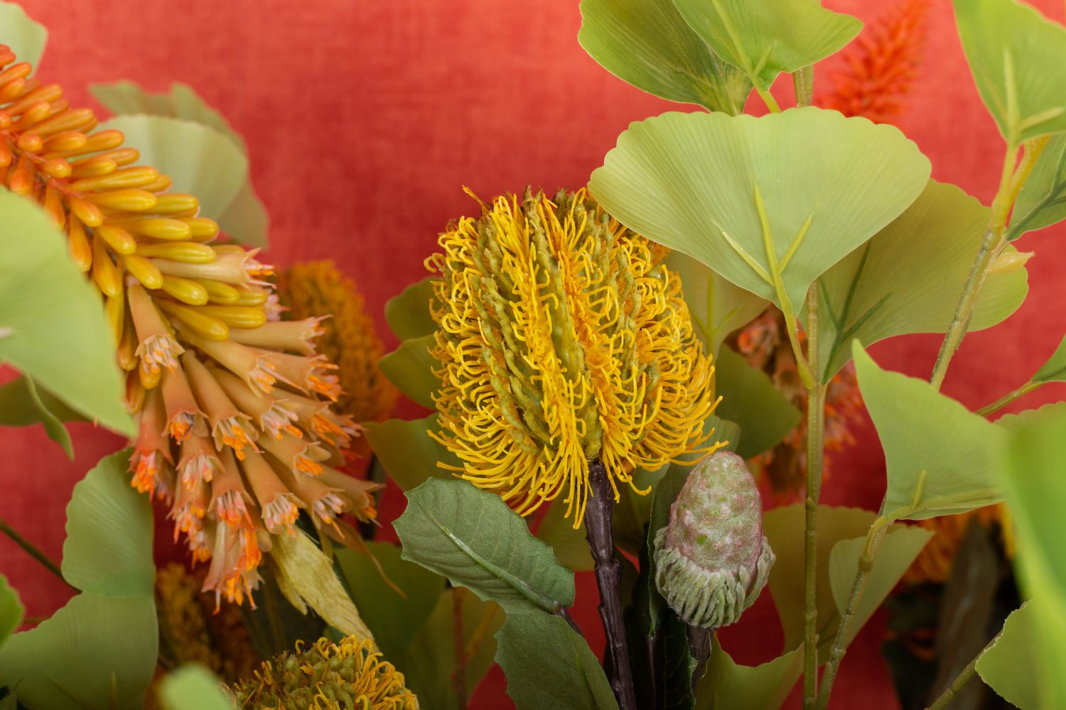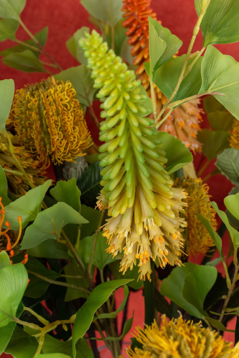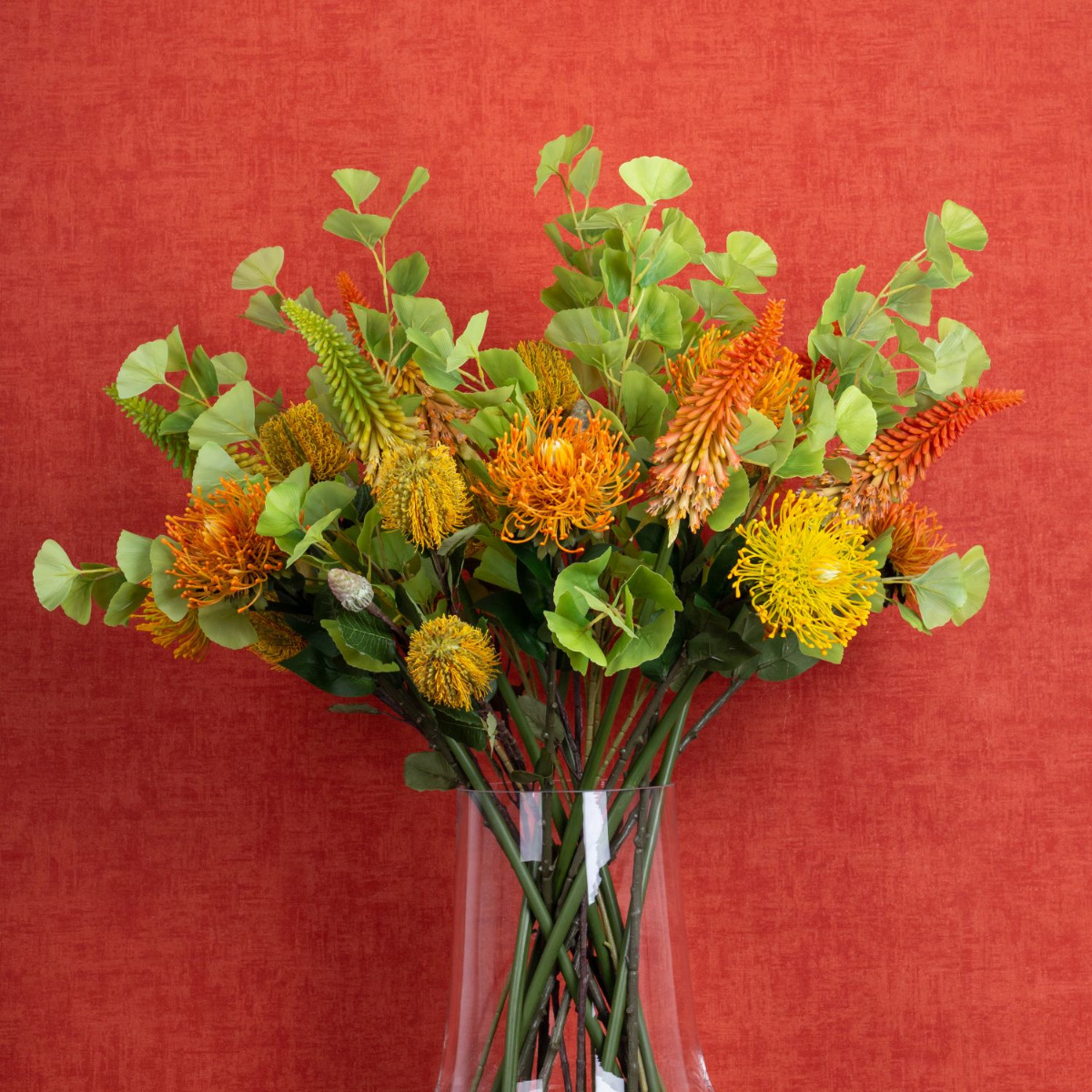 Amarillo y naranja! Los colores del optimismo, la alegría y la ligereza. Sí, ¡así se siente el verano! Mirar este ramo realmente te calienta el corazón porque vuelven los sentimientos veraniegos. Se han mezclado protea en amarillo y naranja con lirios kniphofia del mismo color para crear un ramo maravillosamente luminoso. Un regalo perfecto para un buen amigo ya que el naranja es el color de la amistad. ¡Compra el look!