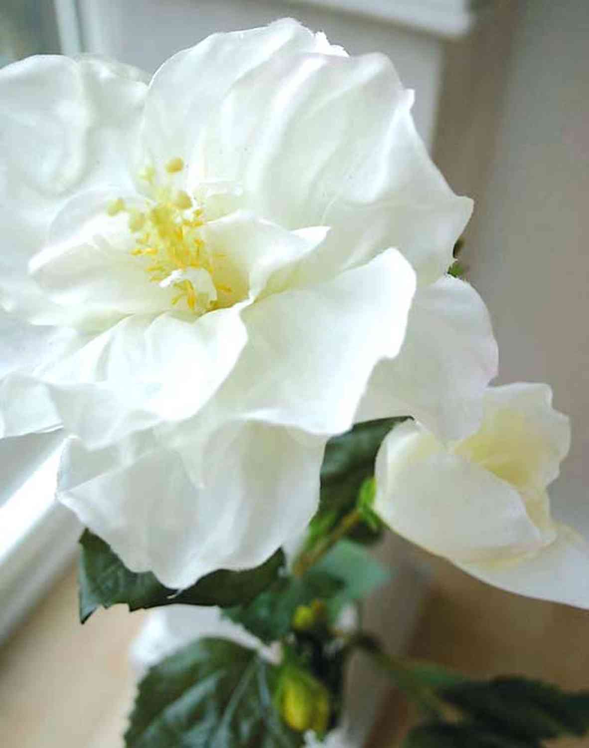 - Con dos flores blancas (Ø 13 y 16 cm) y 10 capullos de material textil y estigmas amarillos