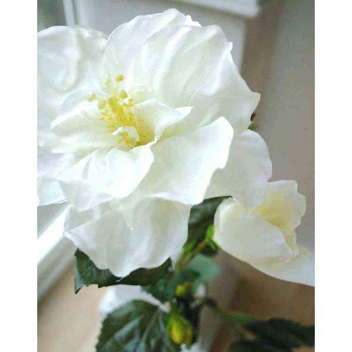 Rama de hibiscus falso XIANG con flores blancas. El hermoso hibisco de plástico con sus hojas vivas le da un toque alegre a su entorno.