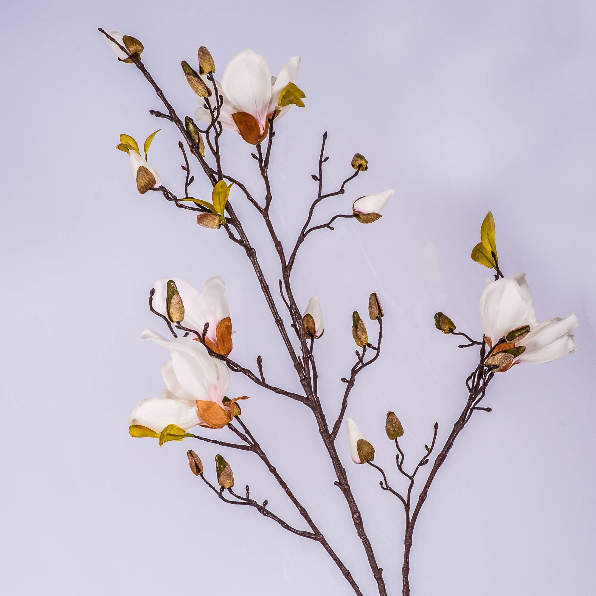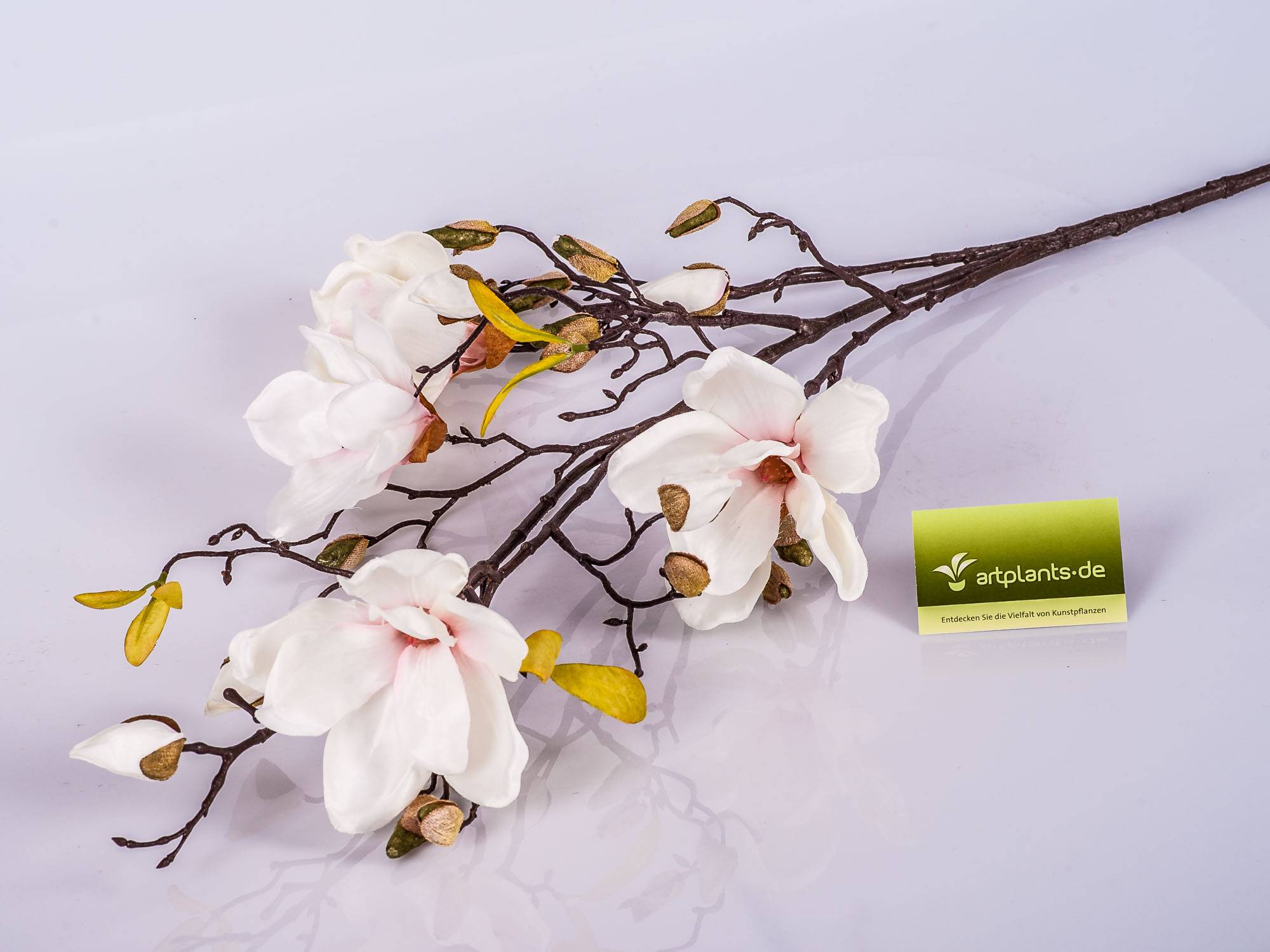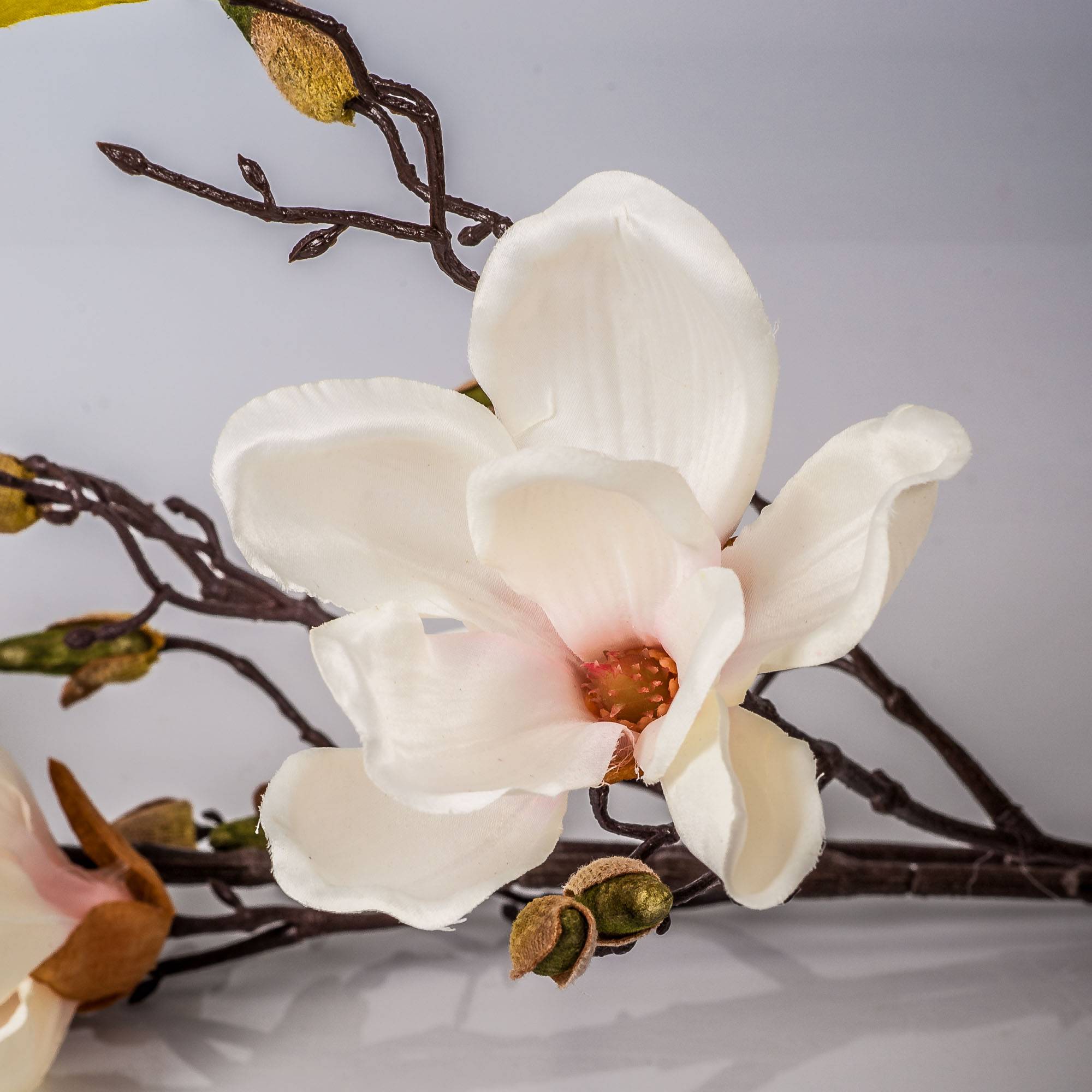 Rama artificial de magnolio LILO con 4 flores y capullos en color blanco y rosa con una longitud aproximada de 110 cm. La rama decorativa consta de muchas pequeñas hojas de textil.