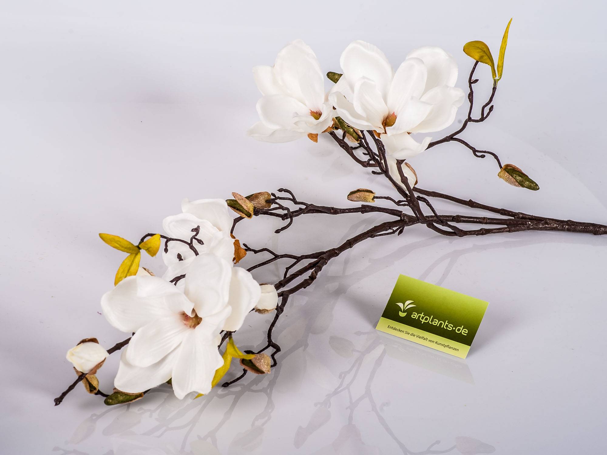 Rama artificial de magnolio LILO con 4 flores y capullos en color crema y blanco con una longitud aproximada de 110 cm. La rama decorativa consta de muchas pequeñas hojas de textil.