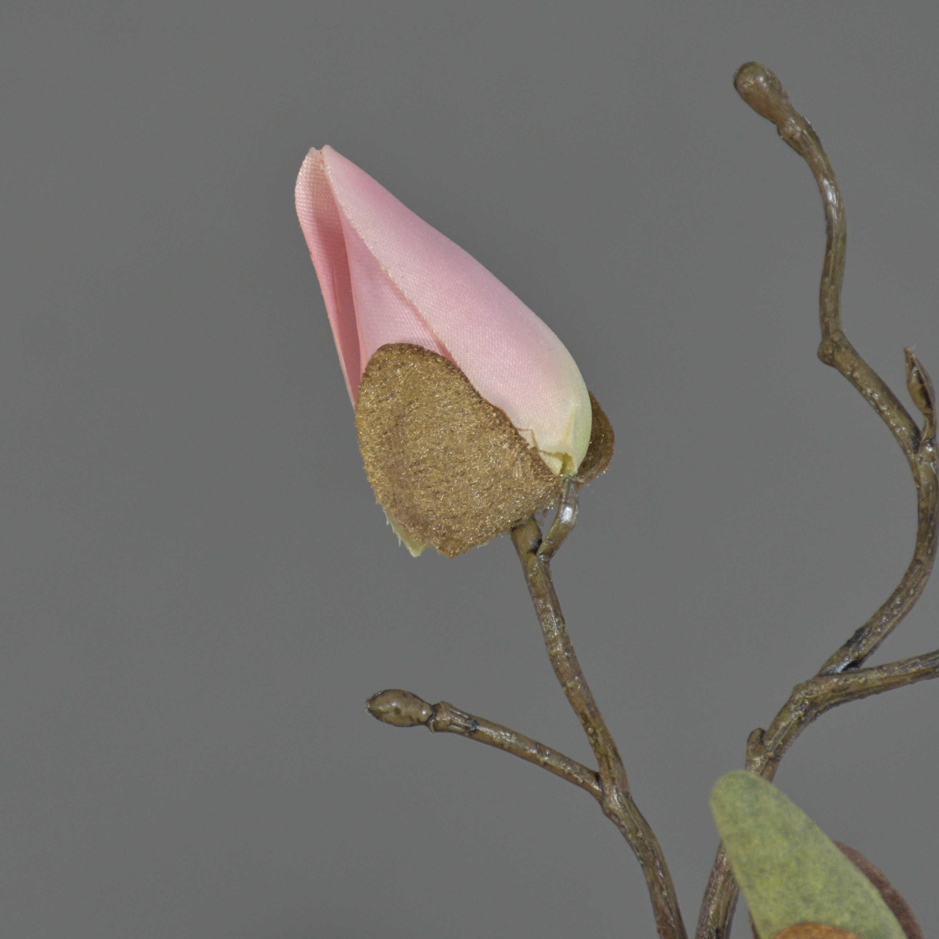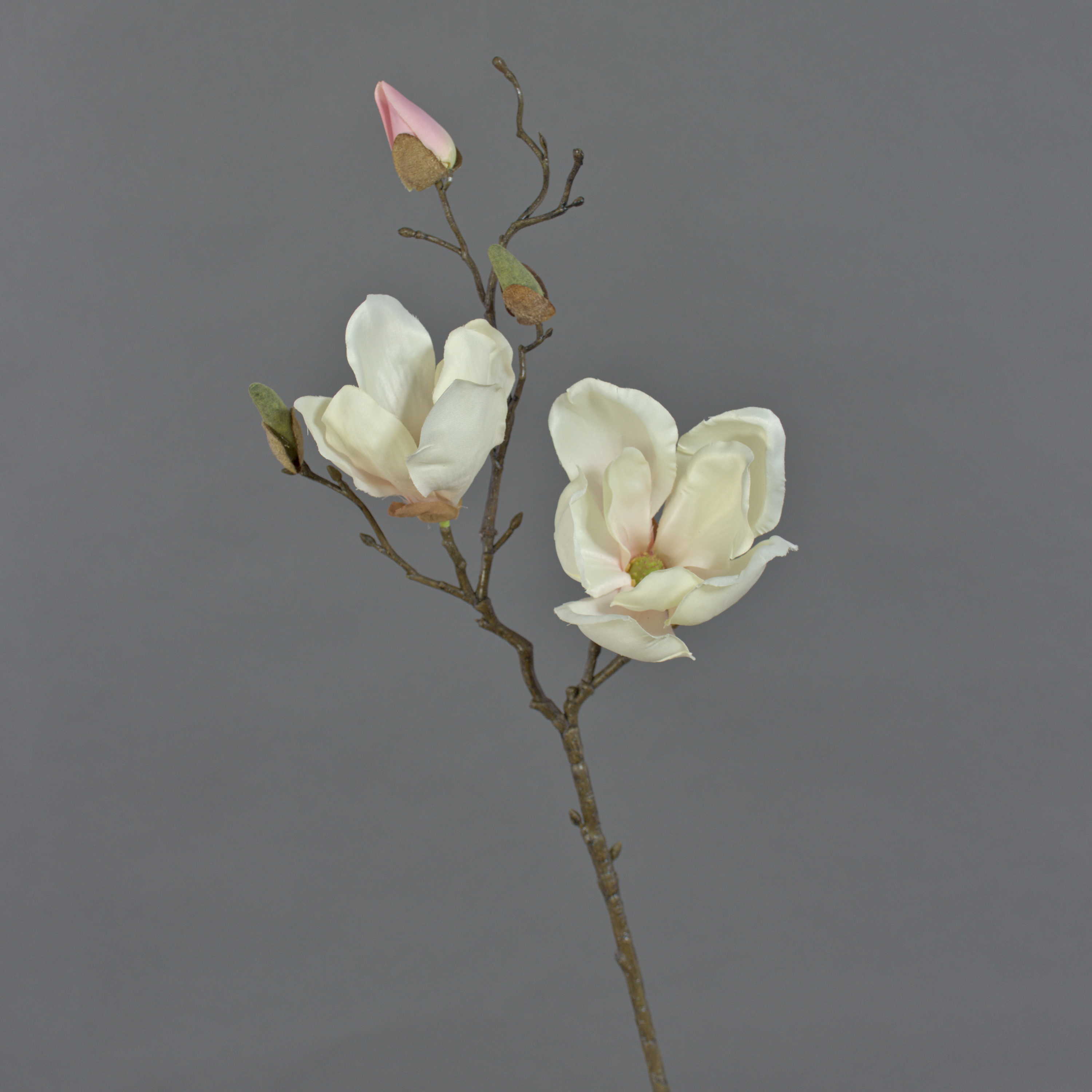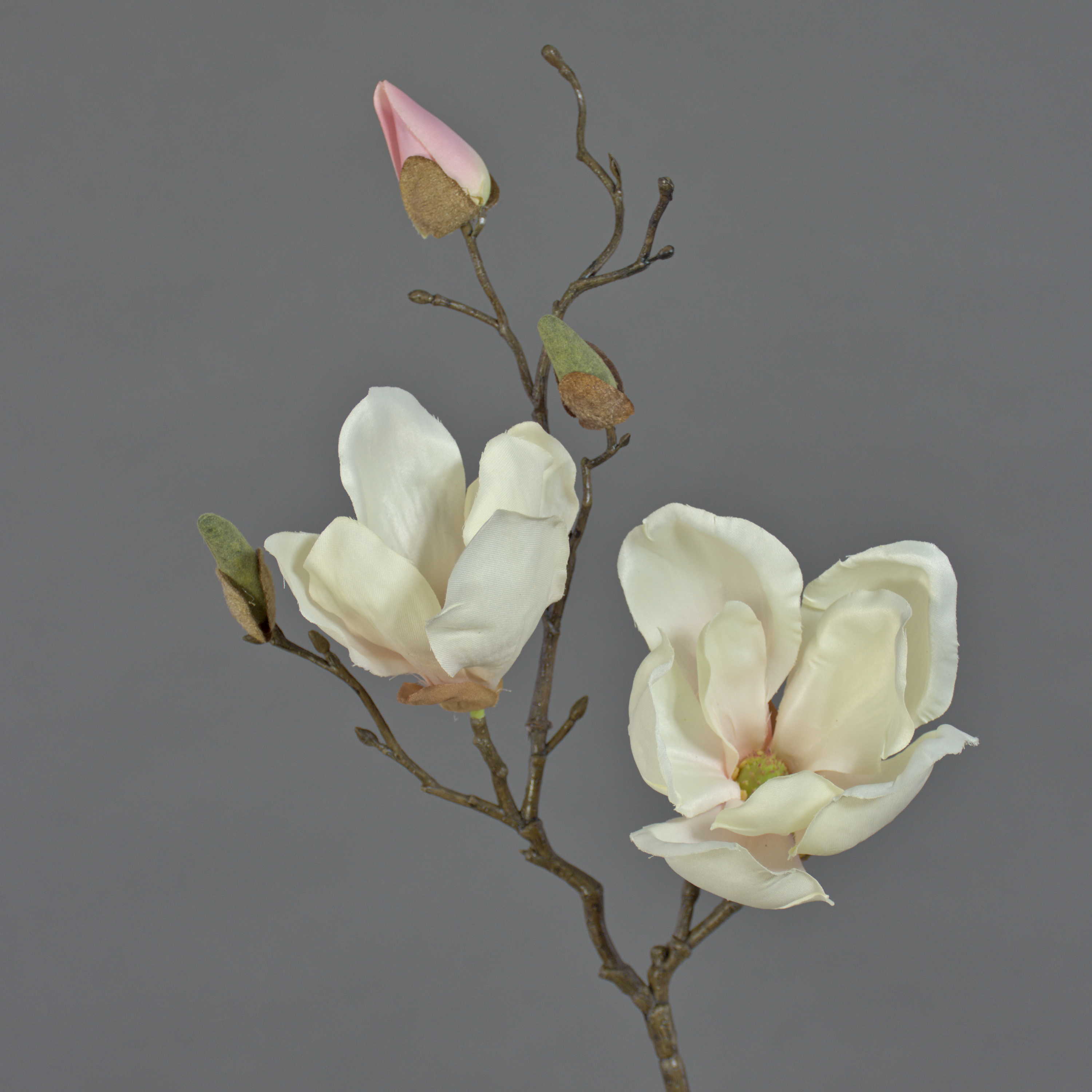 La rama de magnolia artificial MALBINE tiene una longitud total de unos 50 cm. La rama decorativa tiene 2 flores en blanco-rosa y 1 capullo en rosa.