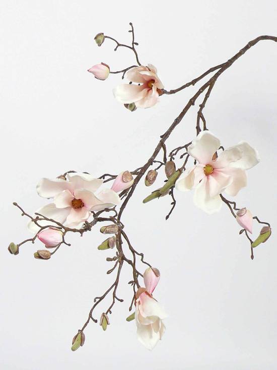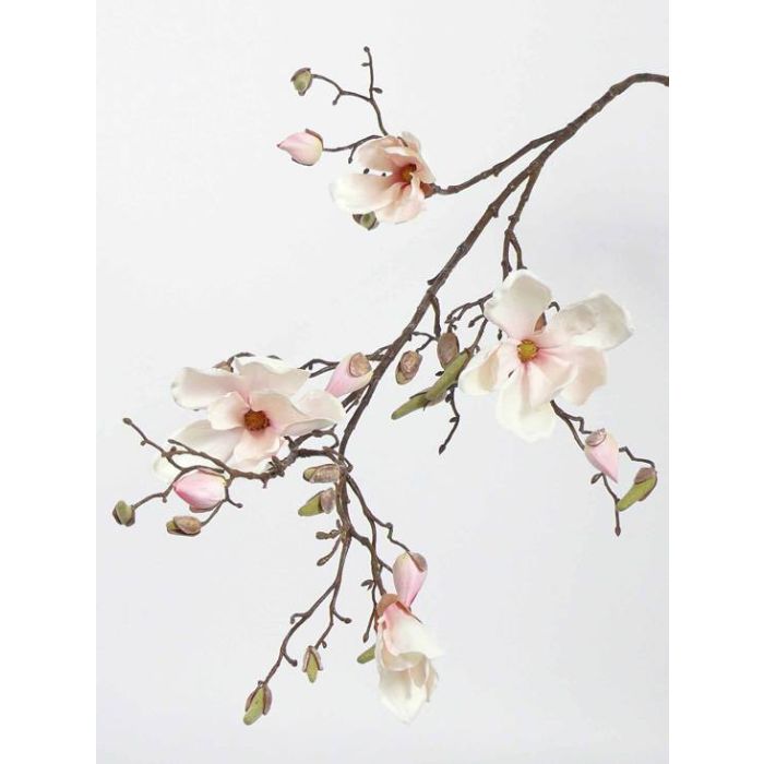 Rama artificial de magnolio LORA con 4 flores abiertas de color crema y rosa y 23 yemas. La rama decorativa mide una longitud aproximada de 110 cm.