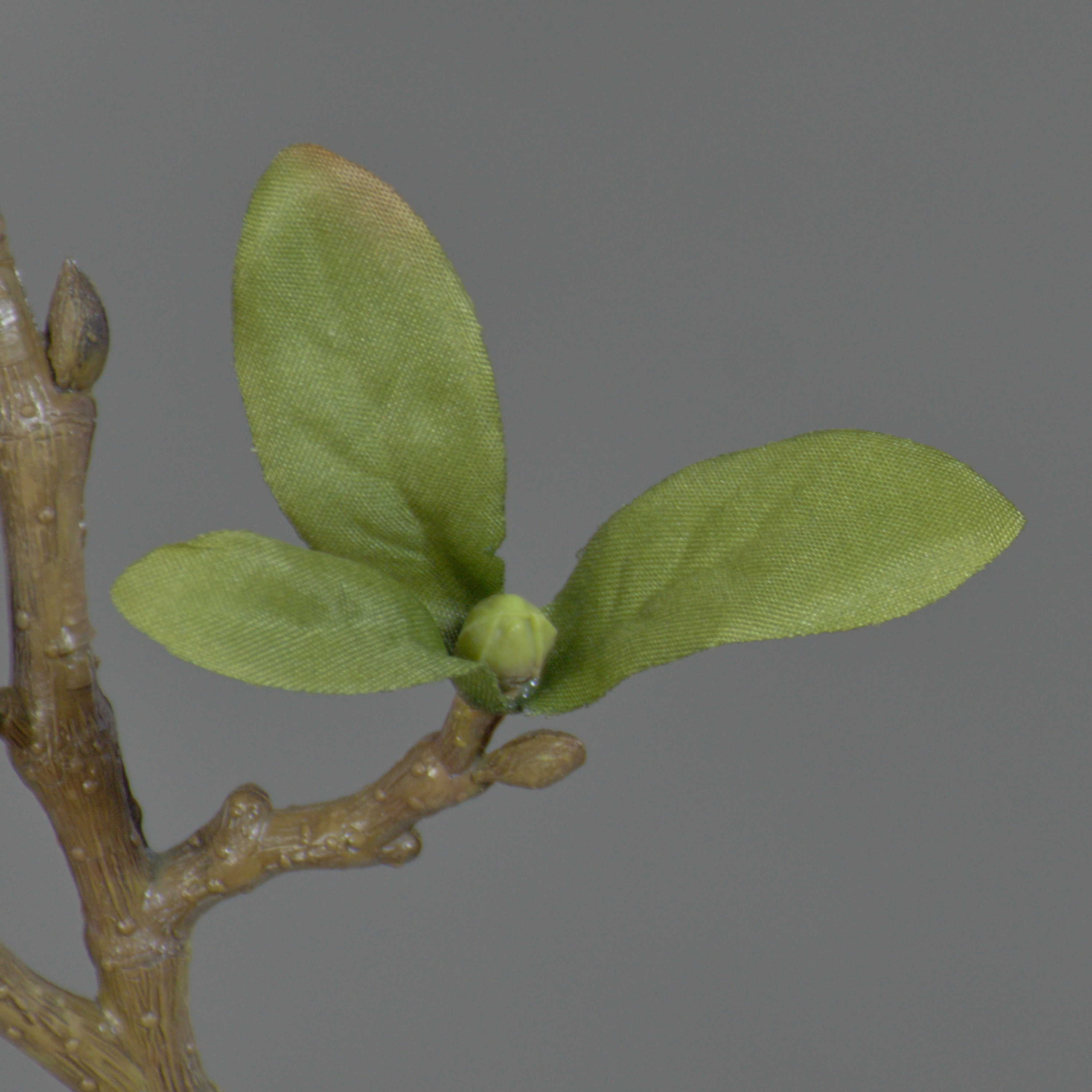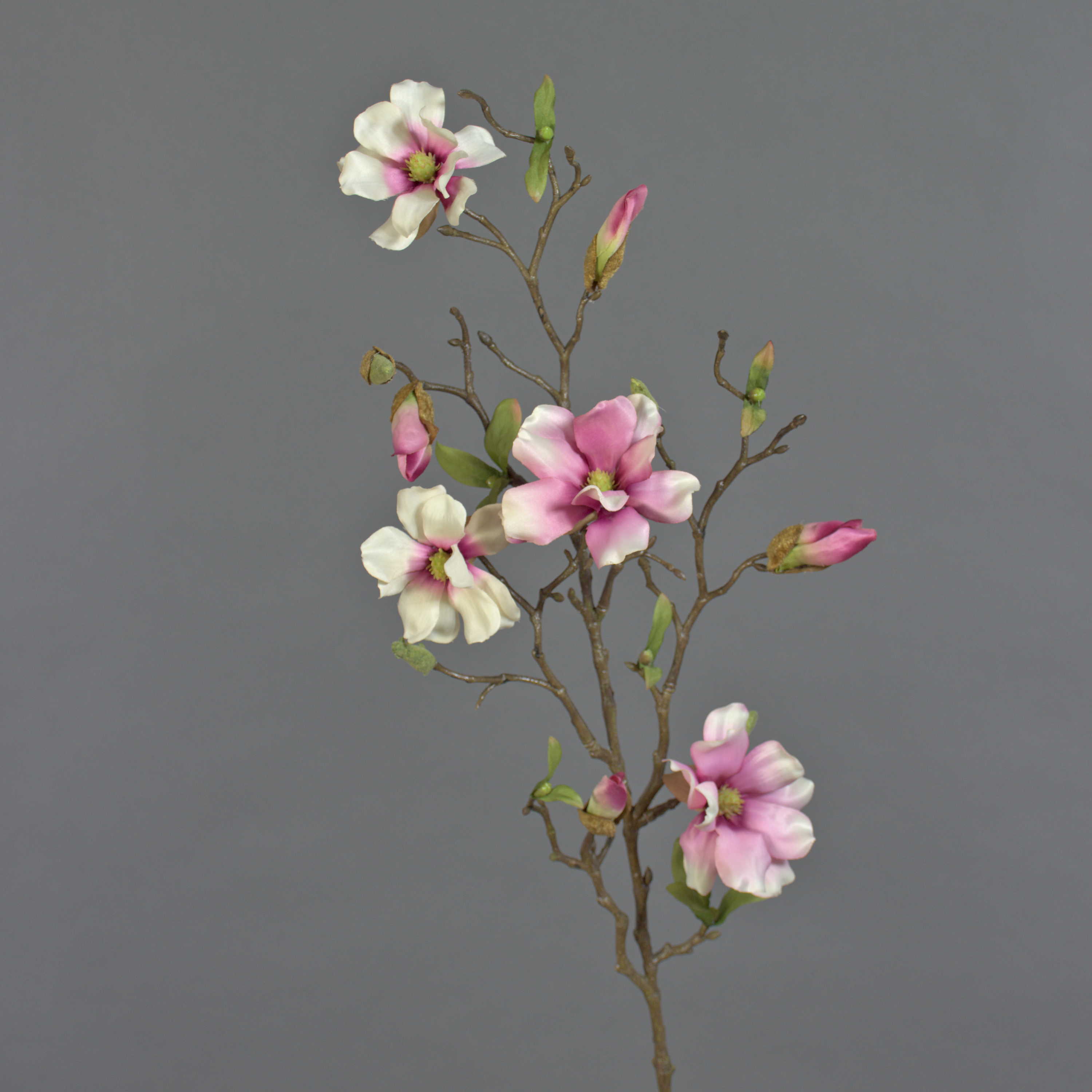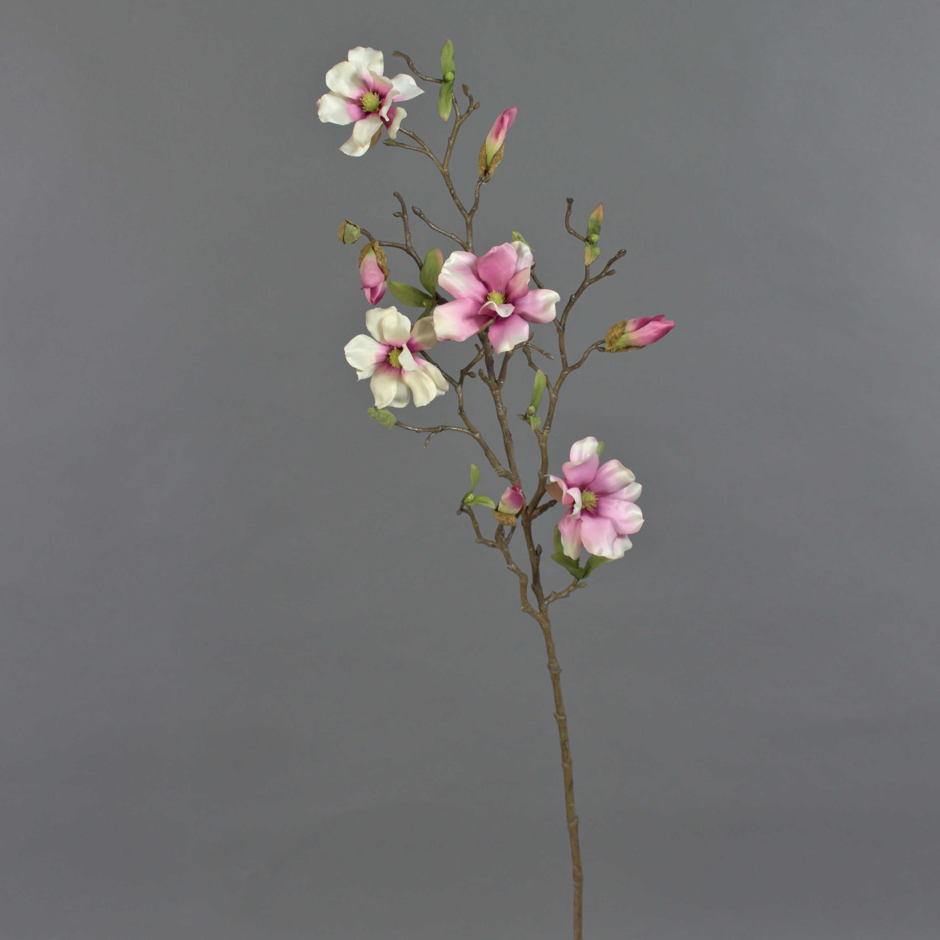 Rama de magnolio MARGA finamente elaborada con 4 flores de color blanco y fucsia y varios capullos. La rama artificial mide unos 80 cm de largo en total.