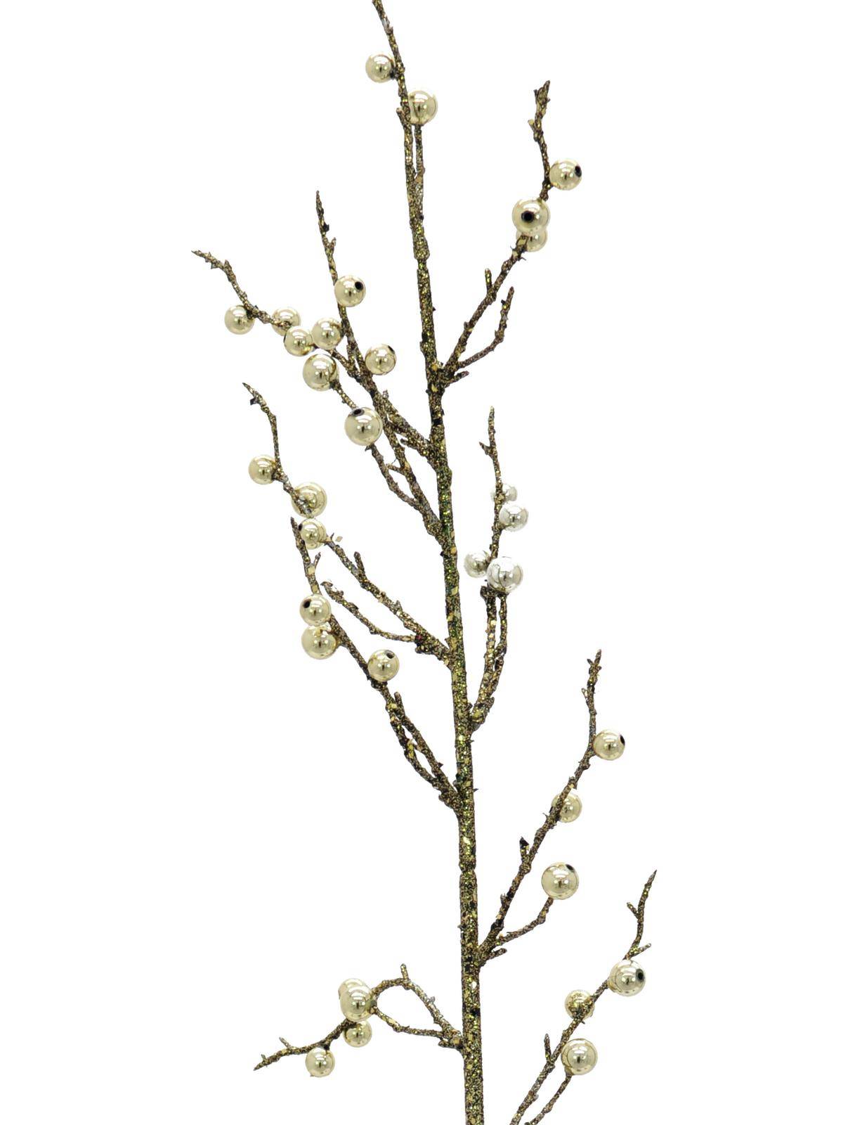 Decorativa rama artificial con bayas en brillante color dorado. La rama posee una longitud de 85 cm.