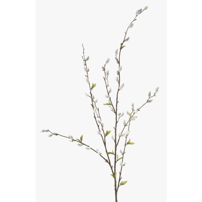 Rama con flores de sauce finamente elaborada con cerca de 120 flores grises. La rama posee una longitud aproximada de 120 cm y es una bonita idea decorativa para arreglos florales o floreros, especialmente en época primaveral.
