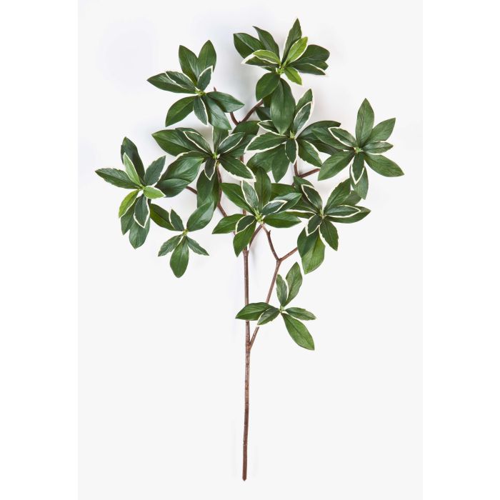 Huso japonés SACHIKO con hojas finamente elaboradas en distintos tonos de verde con bordes blancos que le otorgan una apariencia natural. La rama artificial de bonetero (Euonymus japanicus) mide 55 cm de largo, aproximadamente.