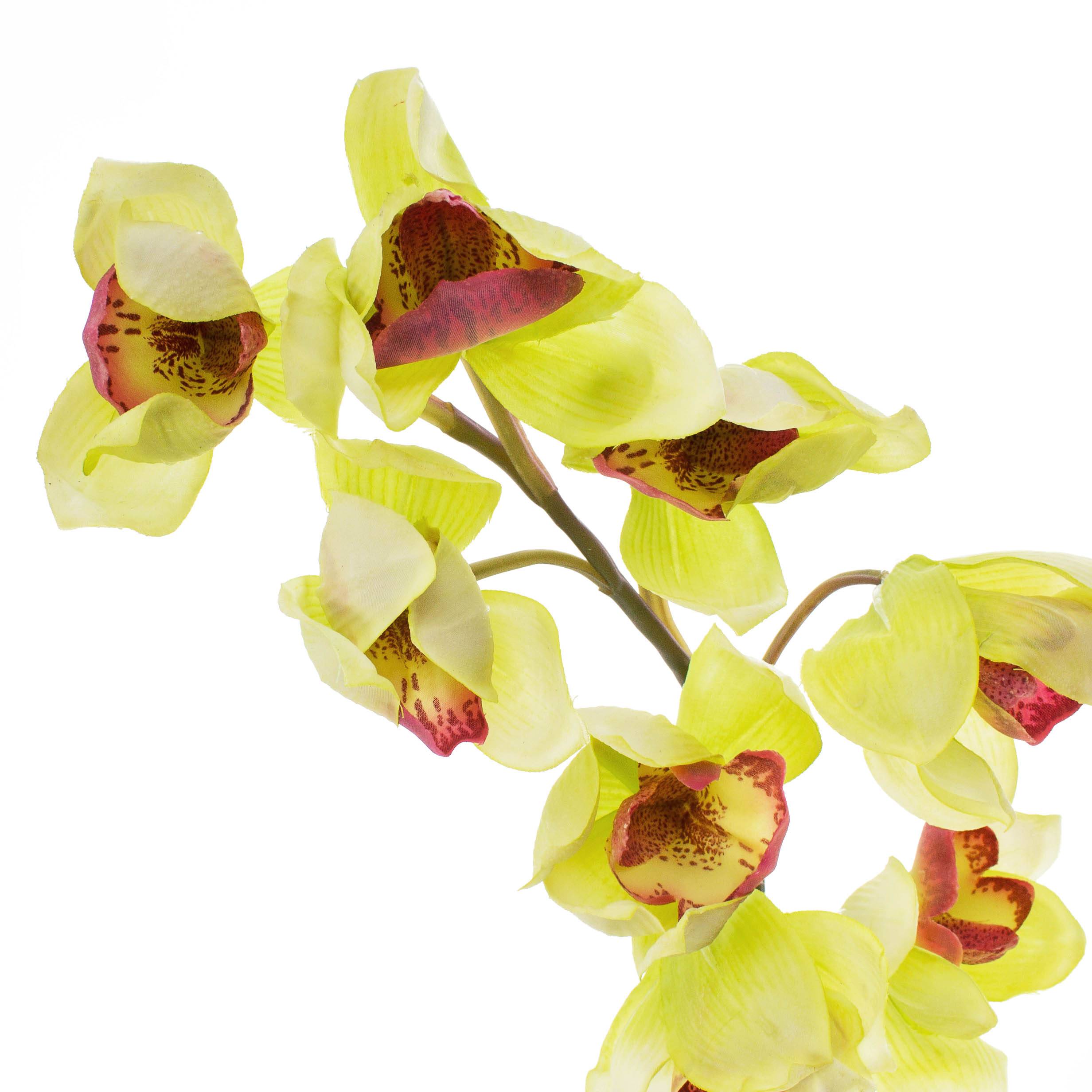 Rama de orquídea Cymbidium con 9 flores abiertas de color amarillo. La rama artificial mide una longitud total de aprox. 80 cm y tiene un aspecto muy auténtico.
