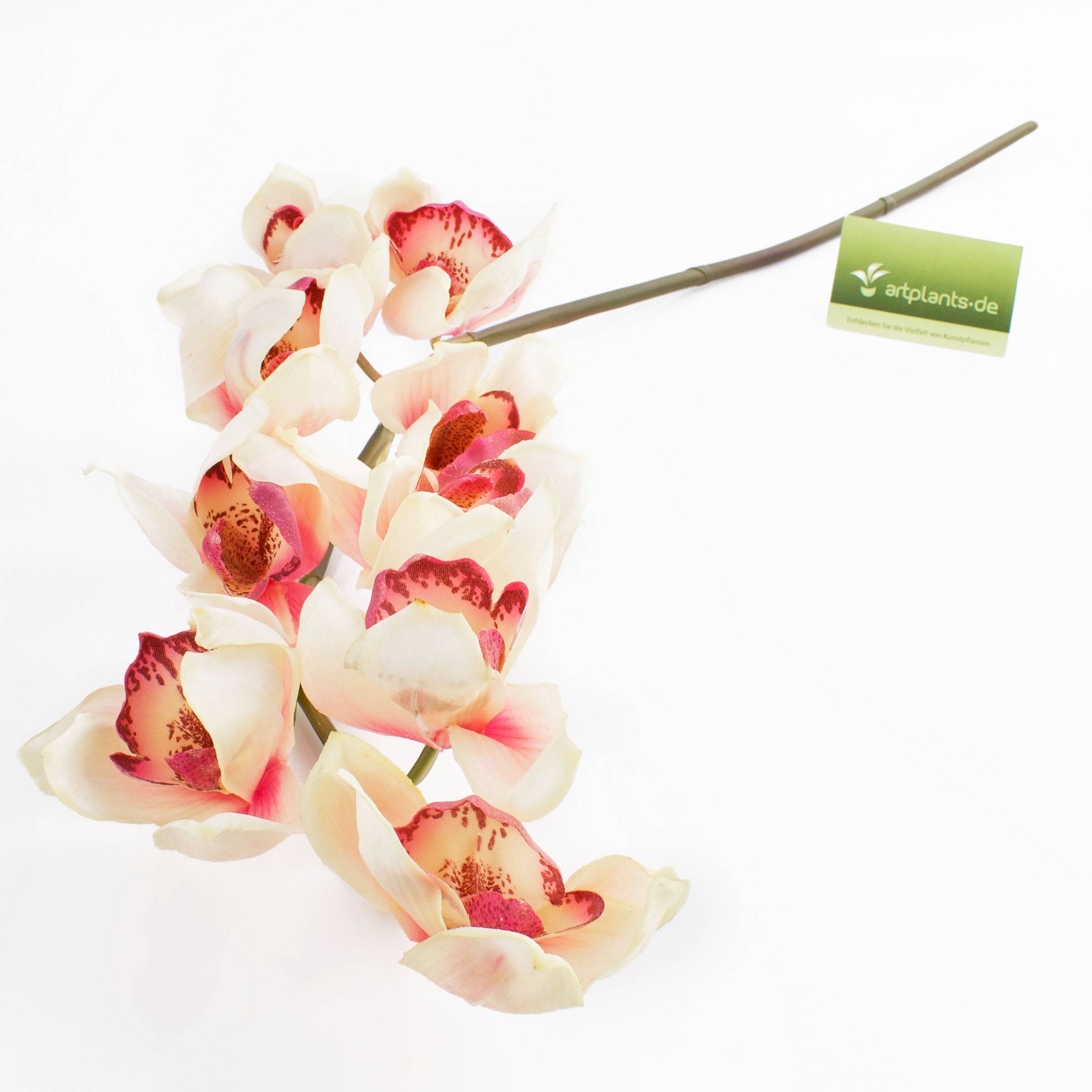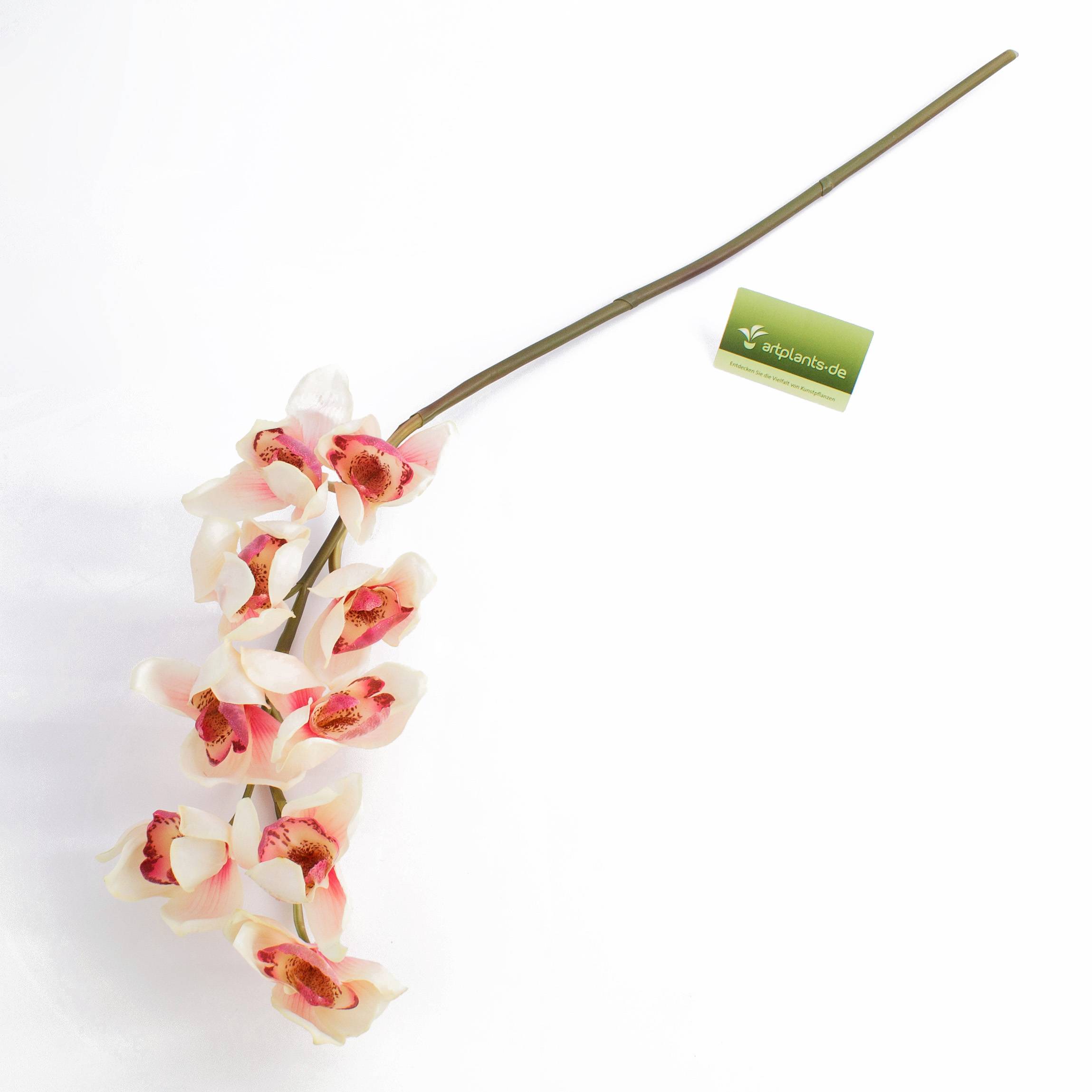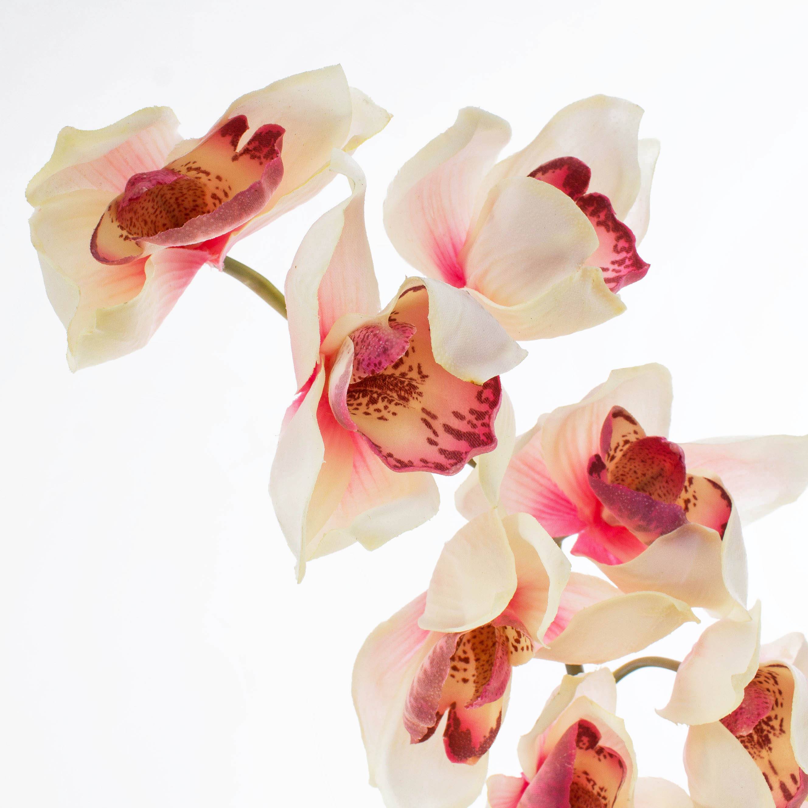 Rama de orquídea Cymbidium con 9 flores abiertas de color crema y rosa e interiores fucsias. La rama artificial mide una longitud total de aprox. 80 cm y tiene un aspecto muy auténtico.