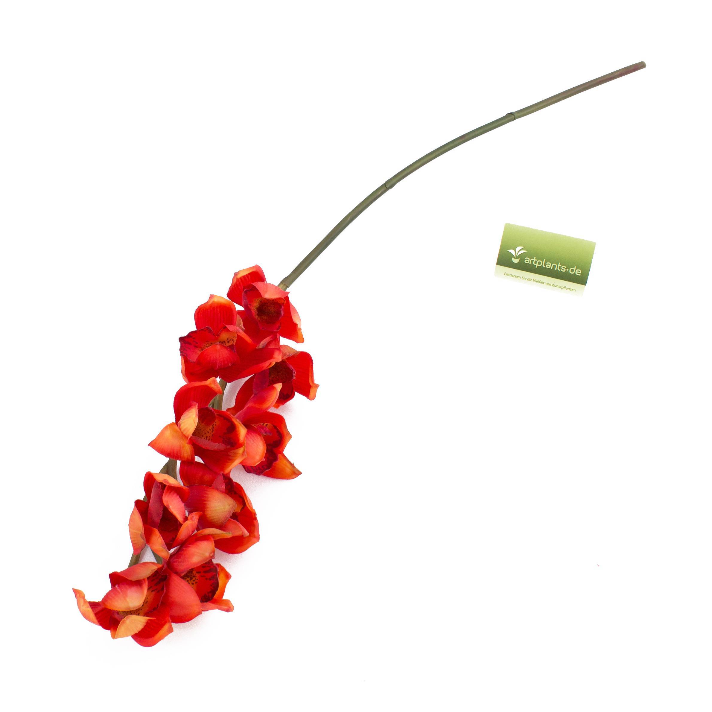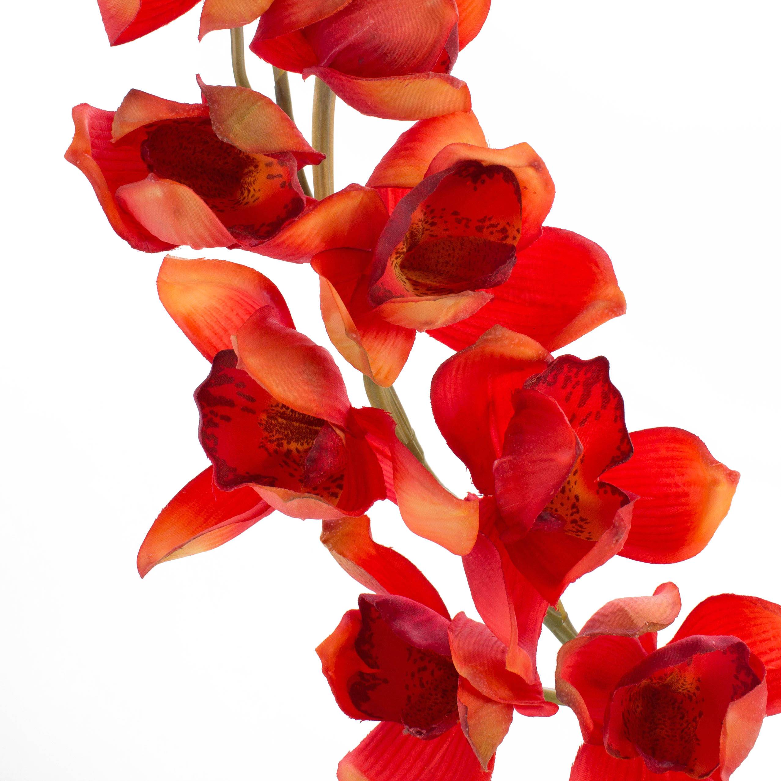 Rama de orquídea Cymbidium con 9 flores abiertas de color rojo y naranja. La rama artificial mide una longitud total de aprox. 90 cm y tiene un aspecto muy auténtico.