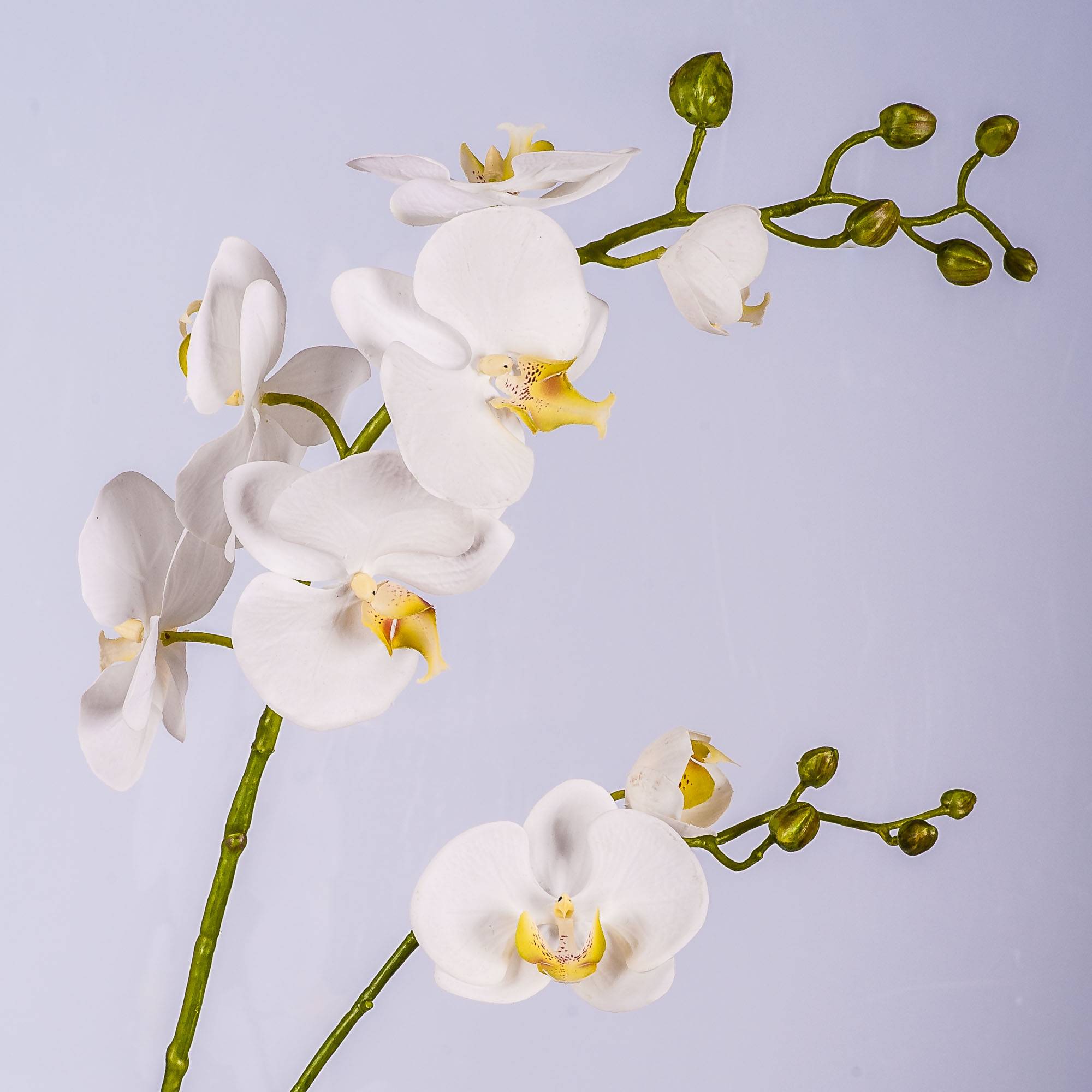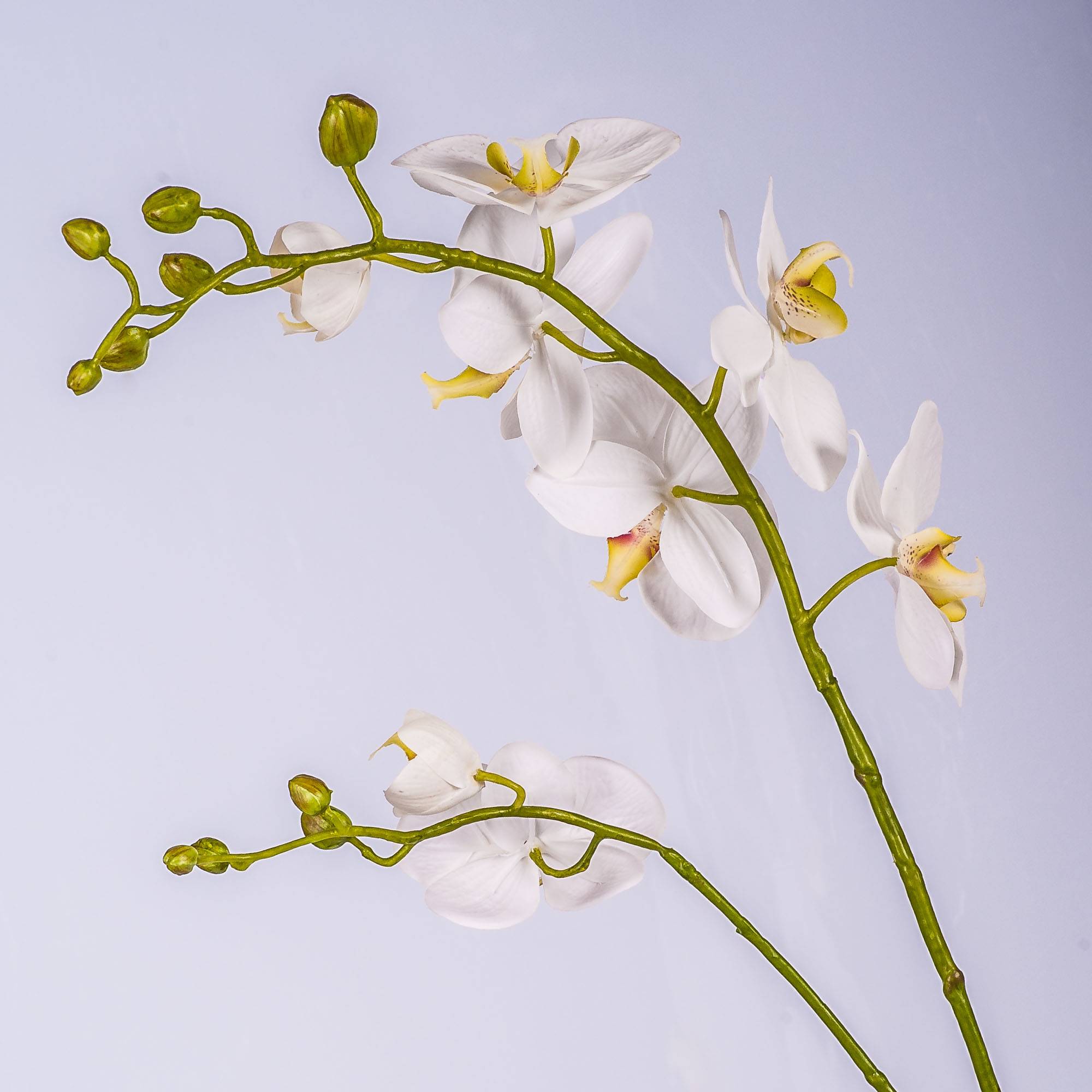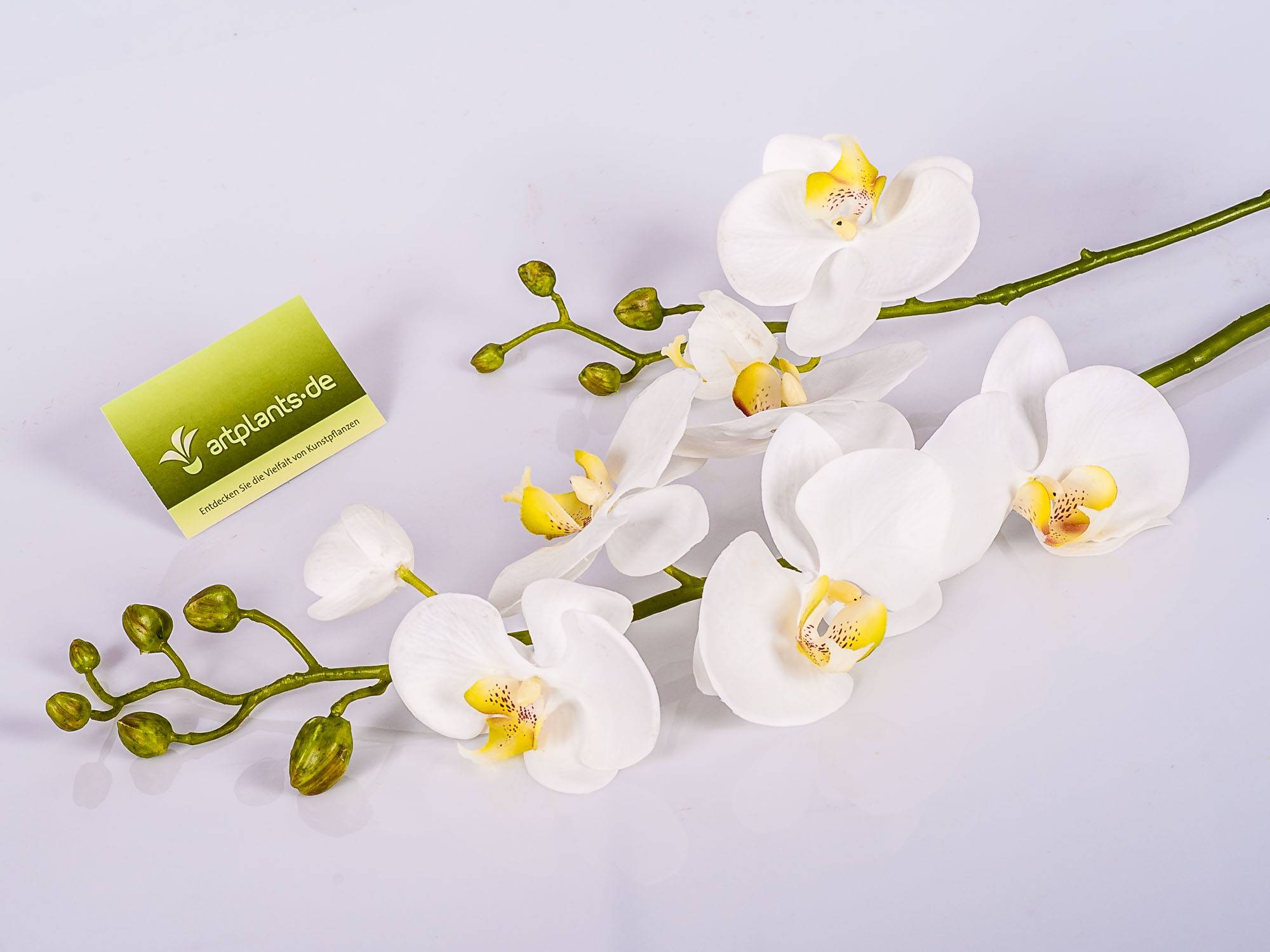 Rama de orquídea Phalaenopsis LAHNA con 8 flores de color blanco y 10 capullos. La rama artificial con una longitud alrededor de 95 cm es una atracción en combinación con una orquídea real marchita.
