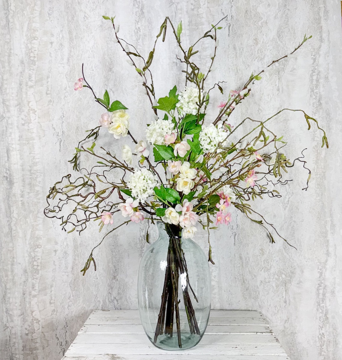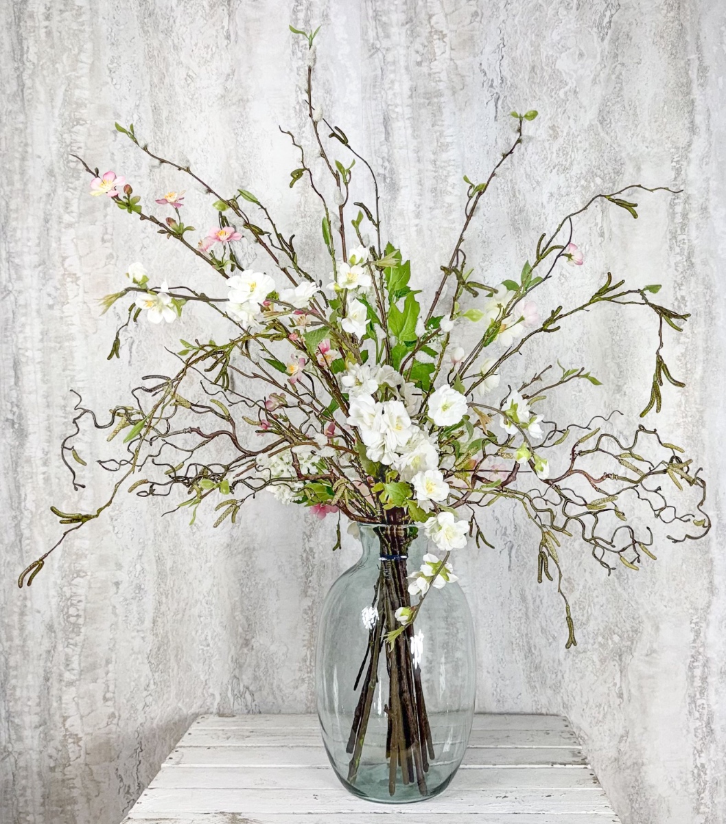 ¡Salvaje y floreciente! Christiane todavía estaba buscando la decoración floral adecuada para su estudio, donde regularmente se llevan a cabo talleres sobre diseño de joyas. Para ella era especialmente importante que las ramas de tallo largo y las flores delicadas crearan un aspecto salvaje y natural. Se utilizaron ramas de sauce, avellana, abedul, manzano, melocotón y flor de cerezo. Una exuberante rama de bola de nieve completó el conjunto floral. El ramo está ingeniosamente dispuesto, con las ramas entrelazadas en una danza armoniosa. Algunas ramas se inclinan elegantemente hacia abajo mientras que otras se extienden orgullosamente hacia el cielo, pero juntas forman una composición equilibrada y estéticamente agradable. ¿Quieres también tener un verdadero atractivo que encarne la belleza de la primavera en todo su esplendor y llene de alegría los corazones de quienes la ven? ¡Compra el look!