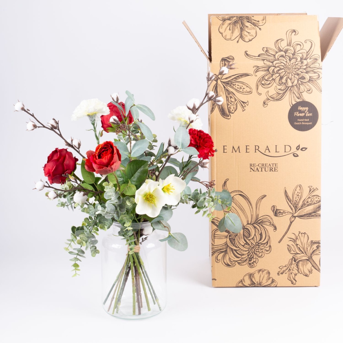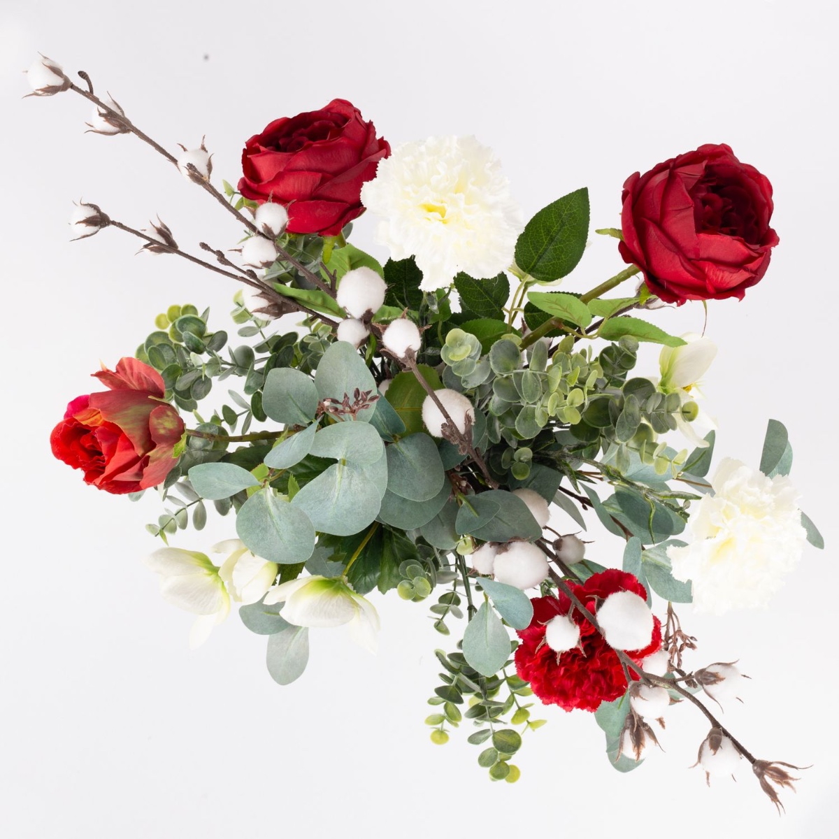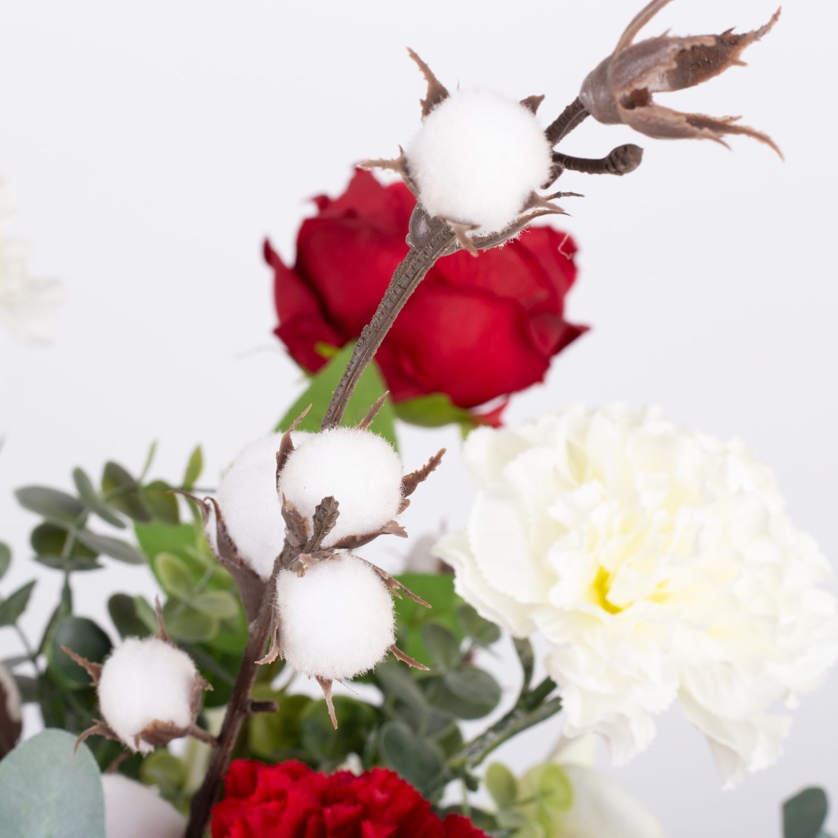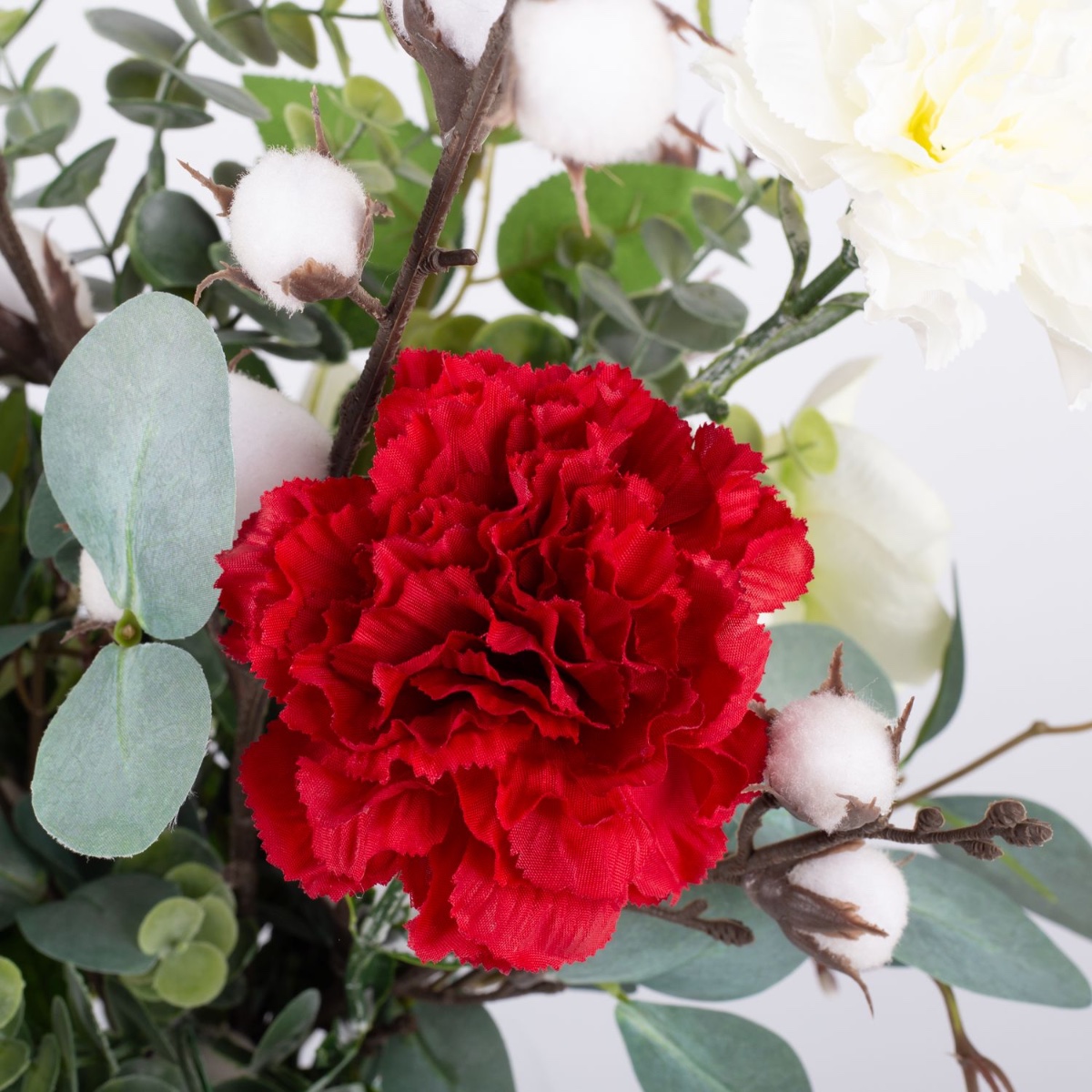 Rojo y blanco. ¡Es Navidad! Este ramo invernal nos hace esperar con ilusión la llegada de la Navidad y crea un ambiente cálido en la habitación. Las flores de algodón, que parecen pequeñas bolas de nieve, están rodeadas de rosas, claveles, rosas de Navidad y ramas de eucalipto. Un ramo invernal de interpretación moderna que da una bienvenida acogedora en cualquier entrada.