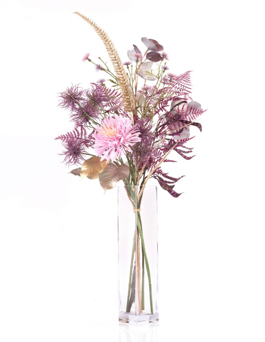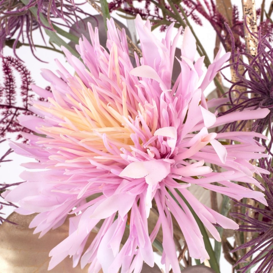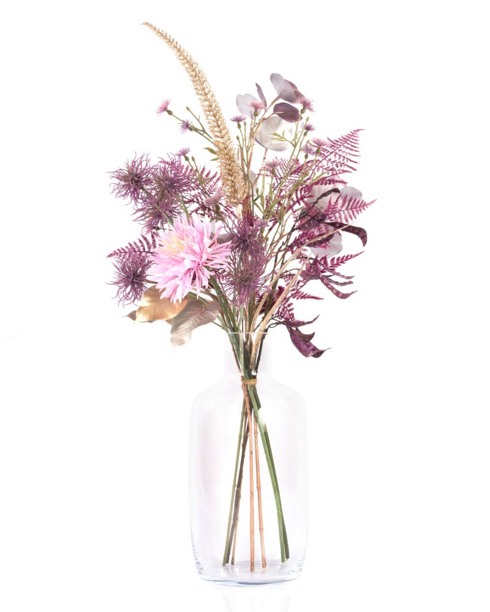 En hawaiano, MENAMI significa "el que trae suerte" y eso es exactamente lo que hace nuestro alegre ramo textil. El ramillete es perfecto como accesorio decorativo o como regalo para cualquier celebración de Nochevieja. Las flores artificiales utilizadas, crisantemo, hamamelis y aciano, parecen fuegos artificiales perfectamente coordinados y desprenden glamour y un ambiente festivo. El arreglo floral se completa con brillantes vainas de judías, una panícula de hierba peniseto que parece un cohete, frondas de esparraguera moradas y ramas de ficus y eucaliptos brillantes.
