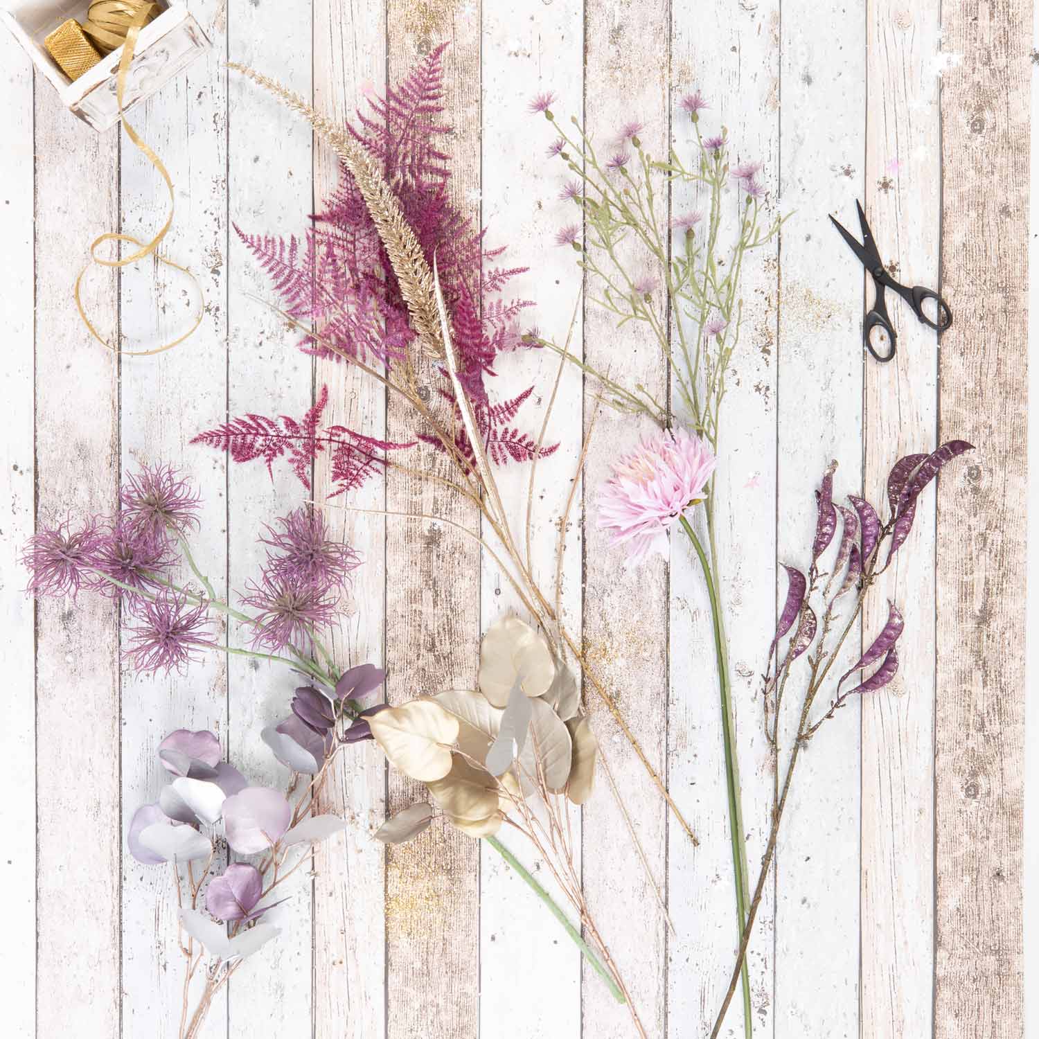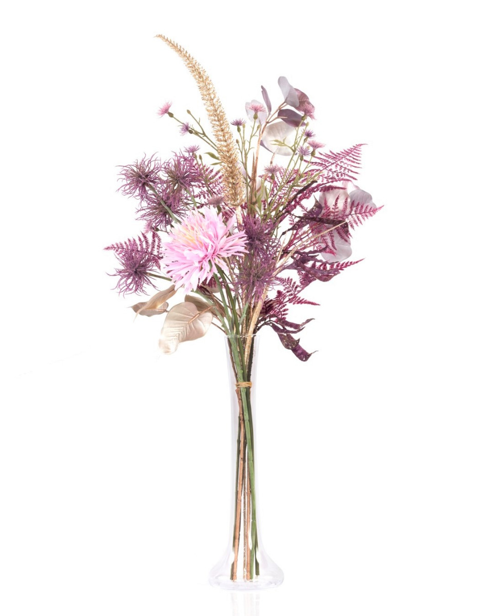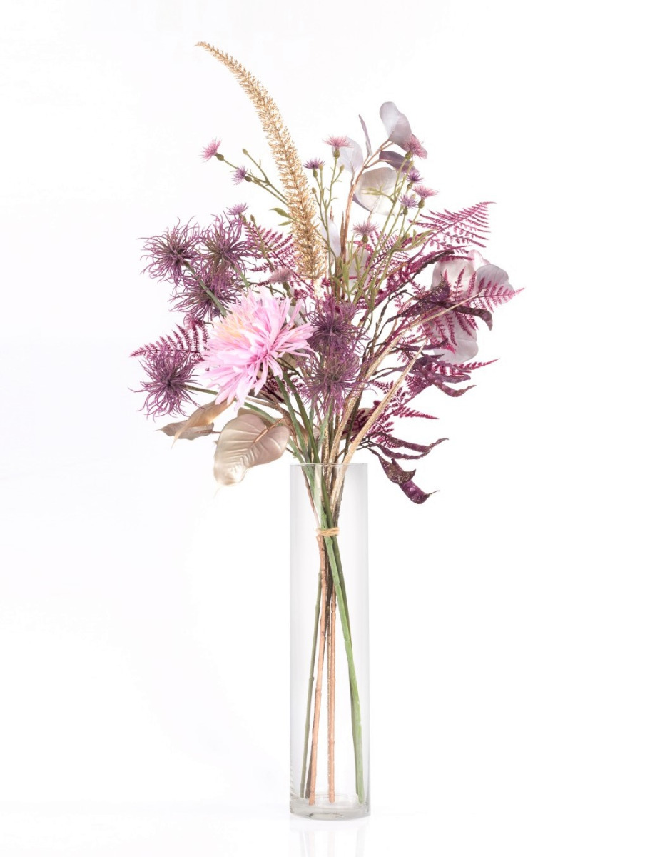 En hawaiano, MENAMI significa "el que trae suerte" y eso es exactamente lo que hace nuestro alegre ramo textil. El ramillete es perfecto como accesorio decorativo o como regalo para cualquier celebración de Nochevieja. Las flores artificiales utilizadas, crisantemo, hamamelis y aciano, parecen fuegos artificiales perfectamente coordinados y desprenden glamour y un ambiente festivo. El arreglo floral se completa con brillantes vainas de judías, una panícula de hierba peniseto que parece un cohete, frondas de esparraguera moradas y ramas de ficus y eucaliptos brillantes.
