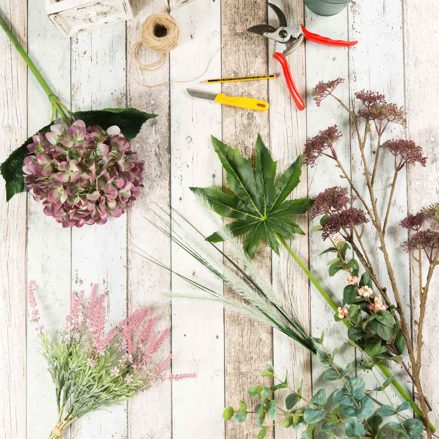 - Las flores y las ramas se pueden acortar individualmente o utilizar por separado para proyectos creativos después de quitar el cordel